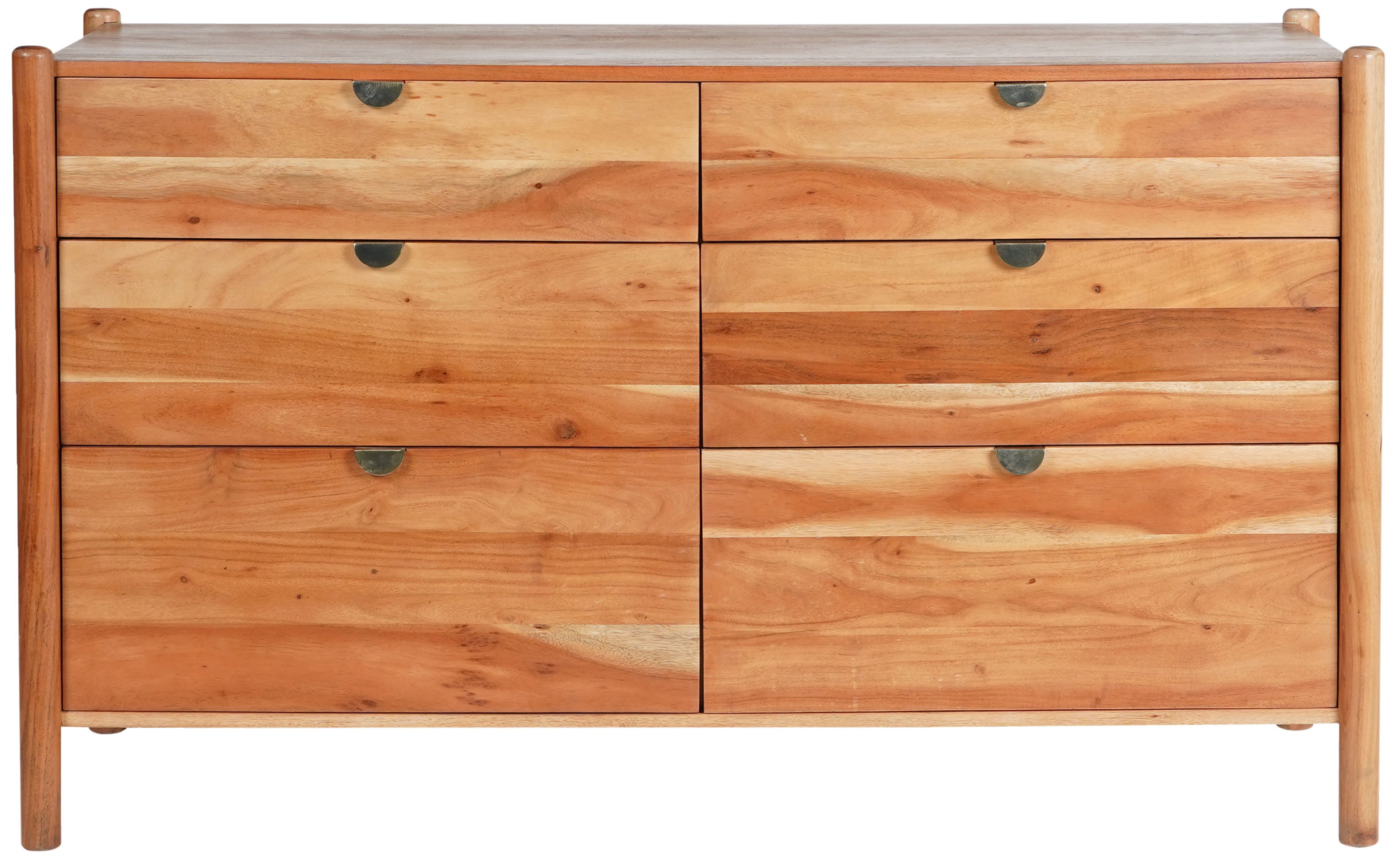Embrace the chic and versatile appeal of our Shanti dresser. The modern dresser impresses with its elegant details and rich textural appeal. Its sleek and minimalist profile is uplifted with the organic textures and tonal variation of acacia wood. It features semi-circular, gold pulls for a perfect touch of luster. Our dresser is ready to lend a rich and sophisticated look to your bedroom. It includes six roomy drawers to keep all your clothes and linens neatly organized.