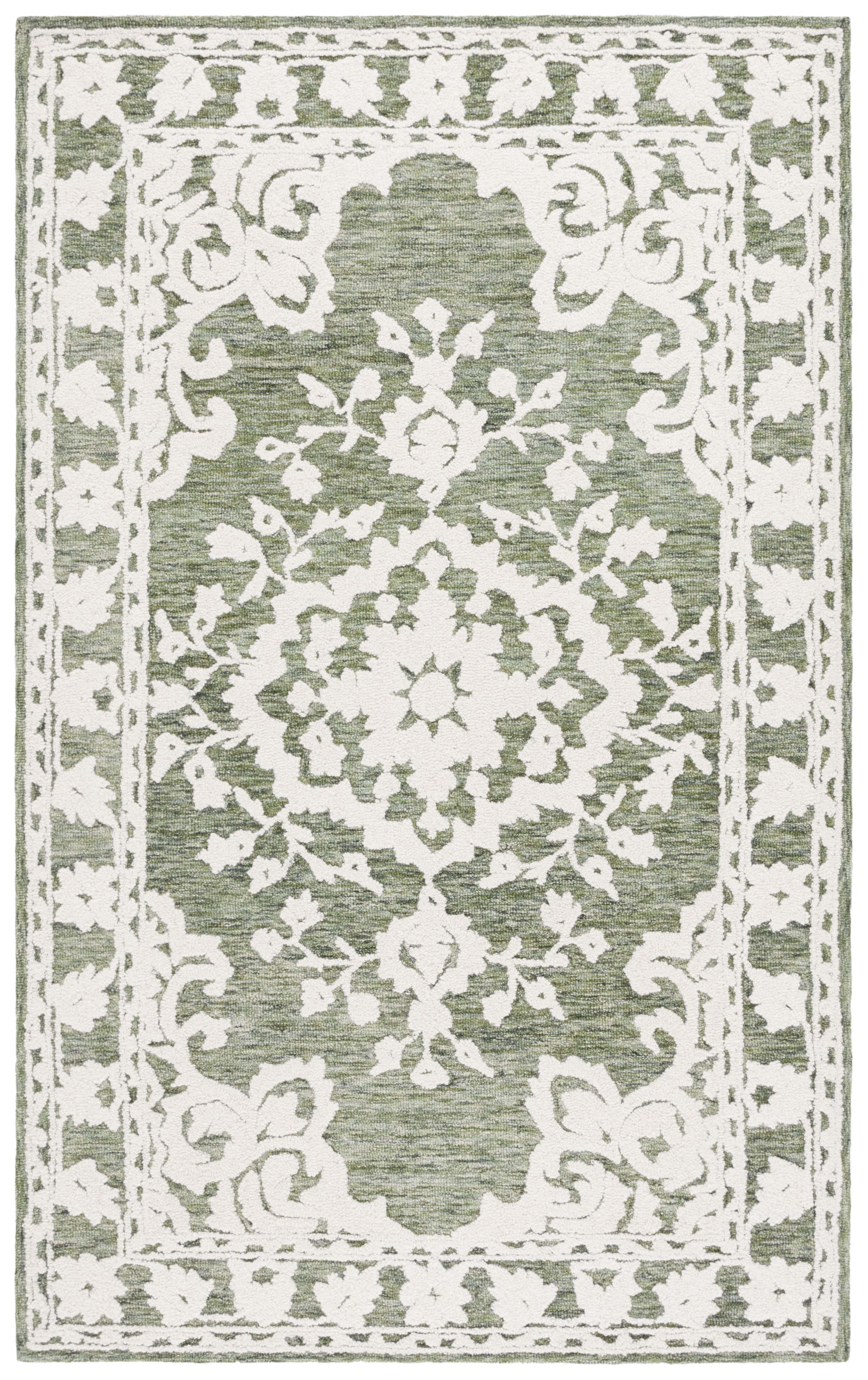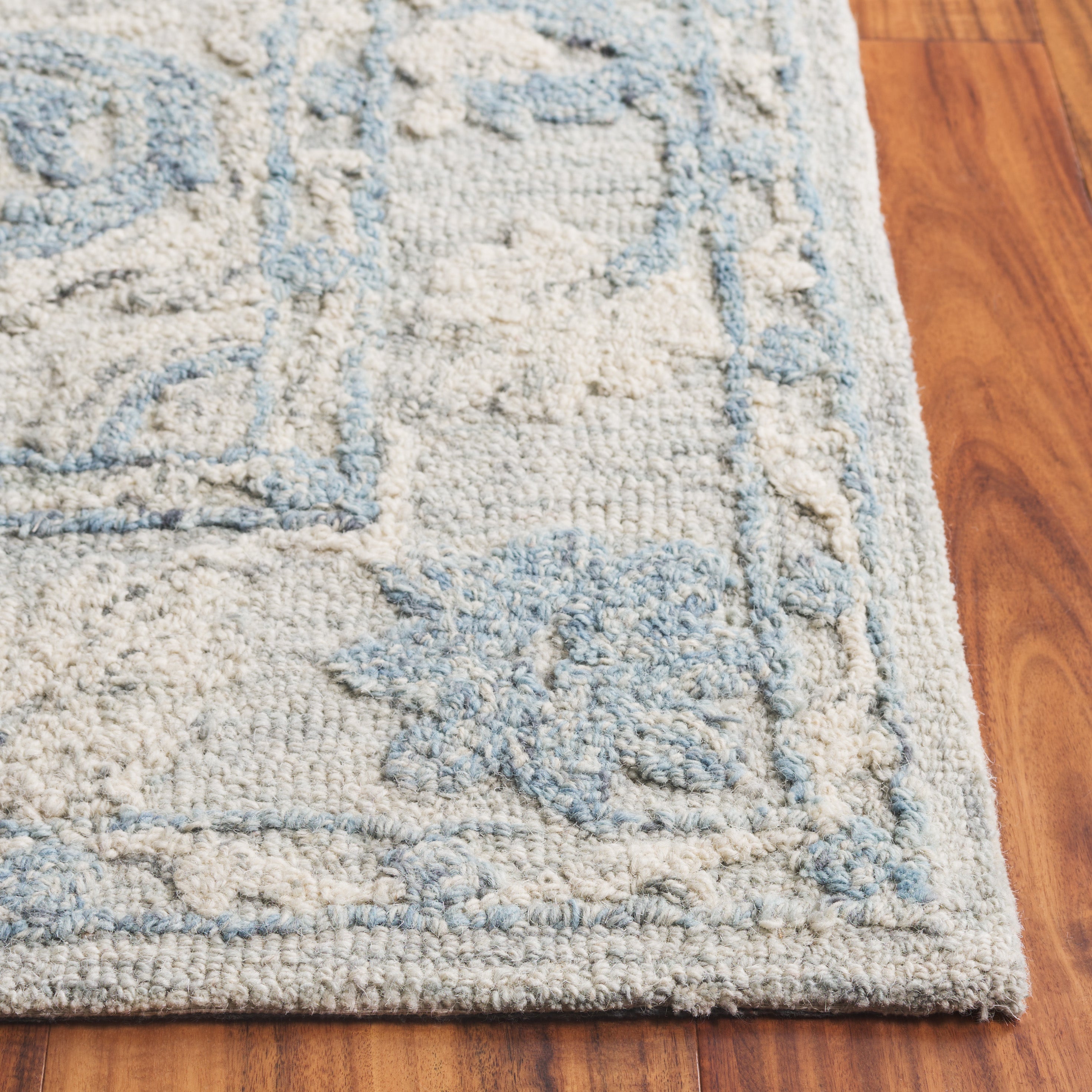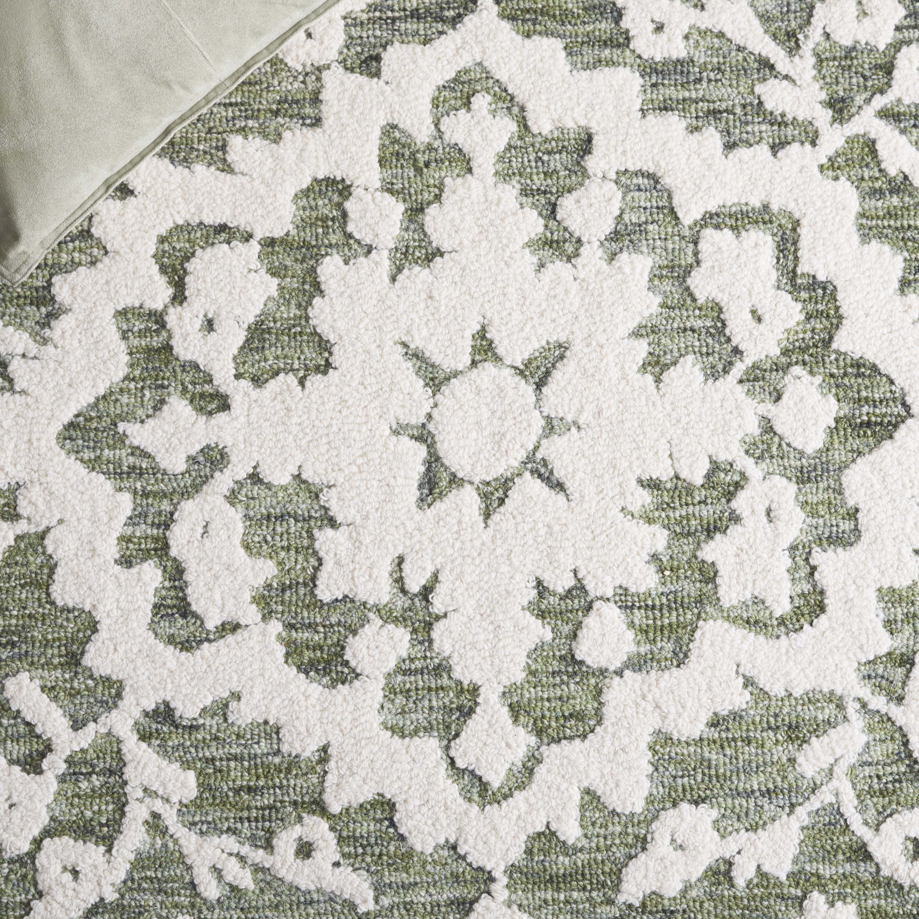 The intricate pattern, which draws inspiration from classic motifs, features a harmonious medley of floral elements that gracefully unfold over the rug's surface, imparting a sense of timeless allure. Skillfully hand-tufted by artisans in India, this rug is a testament to traditional craftsmanship, blending an 80% wool and 20% cotton composition to create a soft yet durable textile masterpiece.