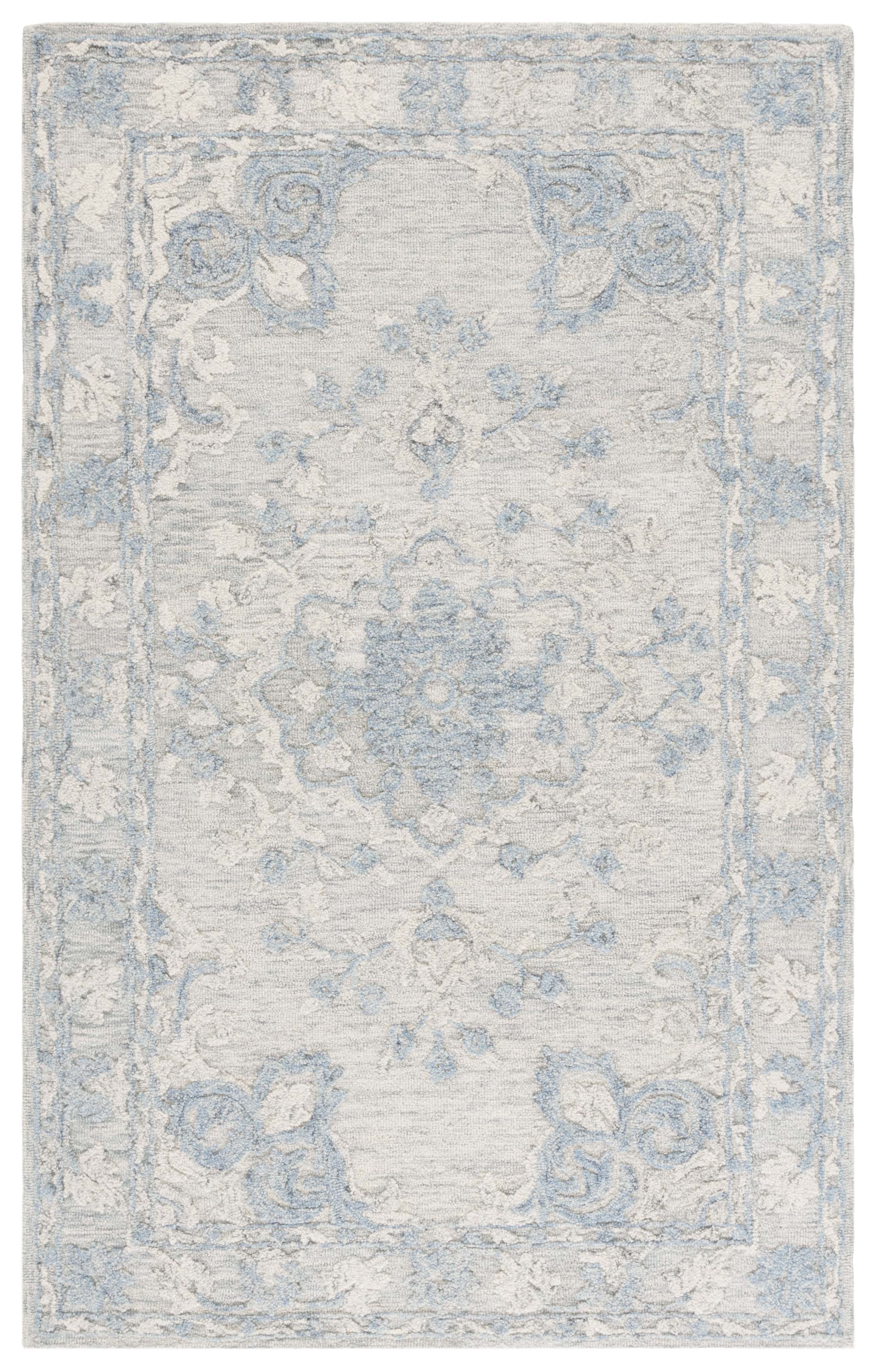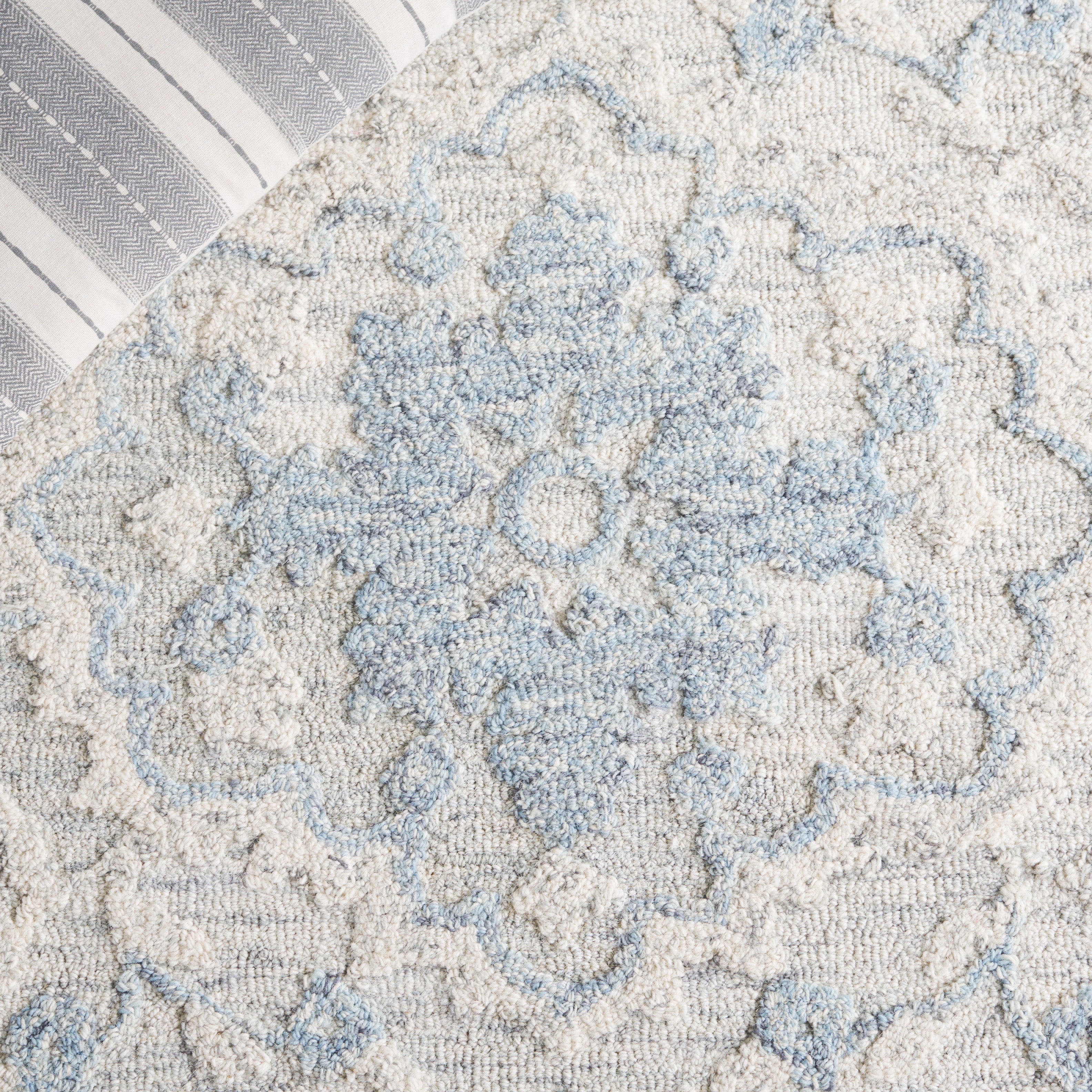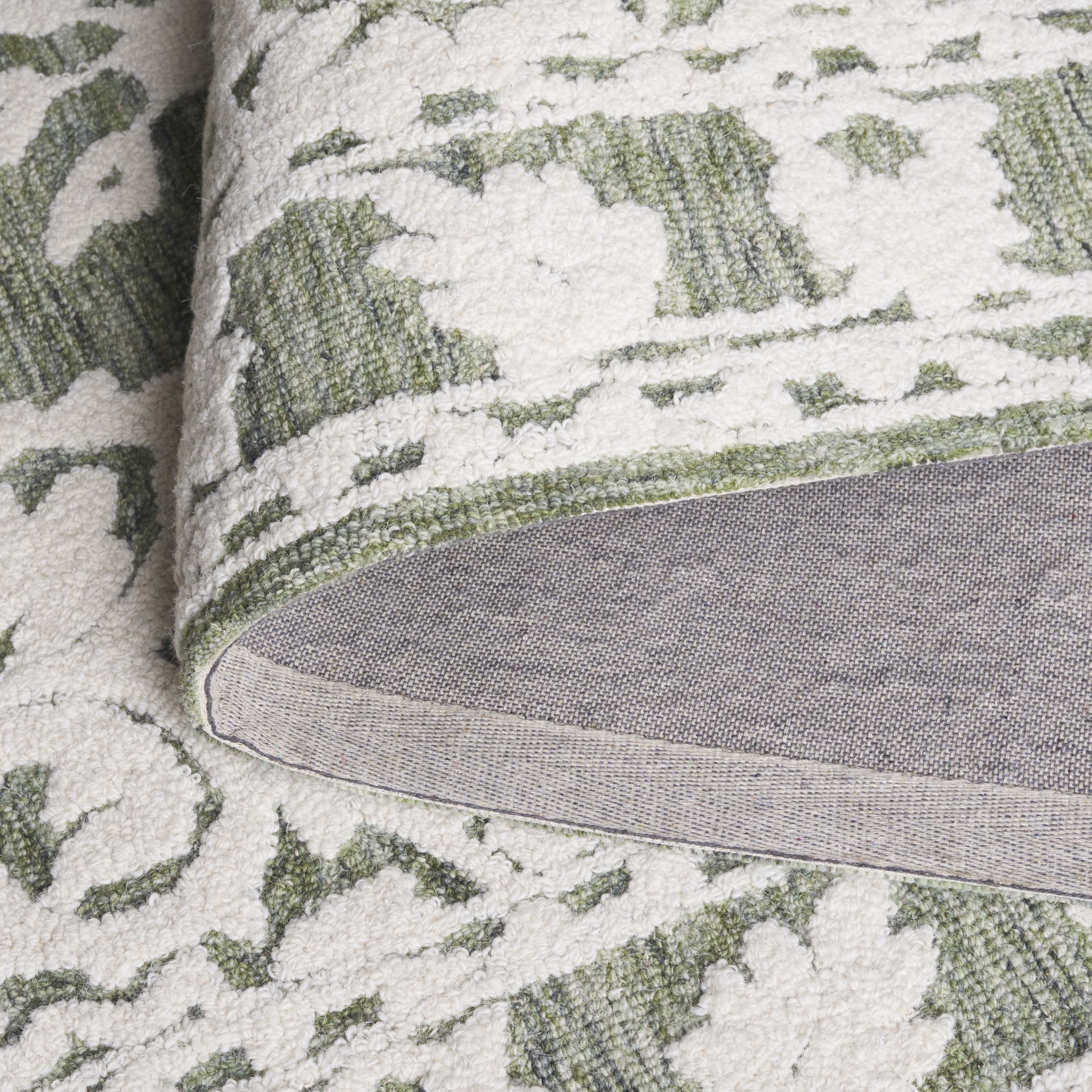 The intricate pattern, which draws inspiration from classic motifs, features a harmonious medley of floral elements that gracefully unfold over the rug's surface, imparting a sense of timeless allure. Skillfully hand-tufted by artisans in India, this rug is a testament to traditional craftsmanship, blending an 80% wool and 20% cotton composition to create a soft yet durable textile masterpiece.