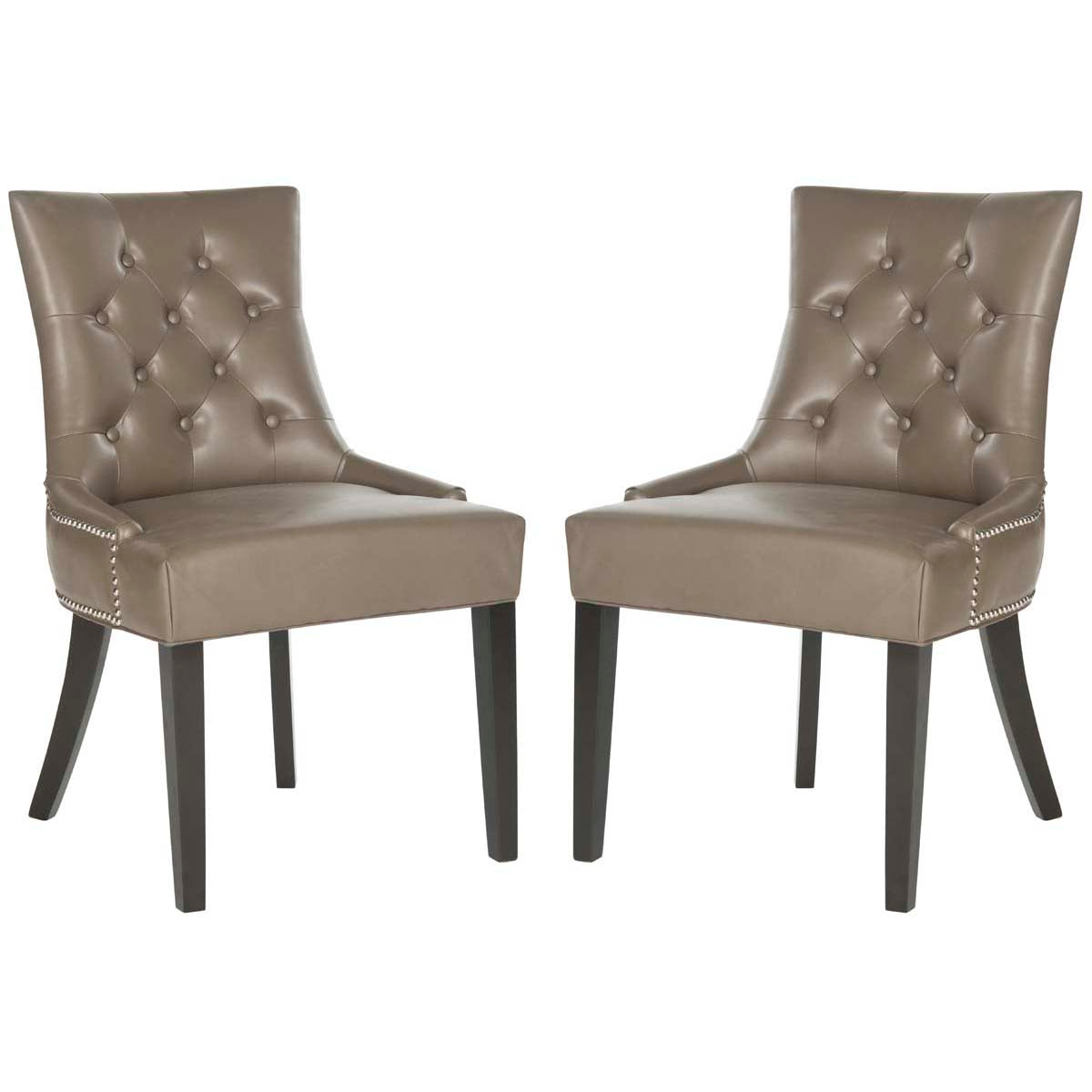 The stylish Harlow ring chair by Safavieh transforms any dining room with instant glamour. Dressed up with silver nail heads and a clever metal ring on its back, Harlow is shown in clay toned bicast leather with birch legs in espresso. Button tufts on the front of the tapered backrest add to the allure of this set of two chairs.