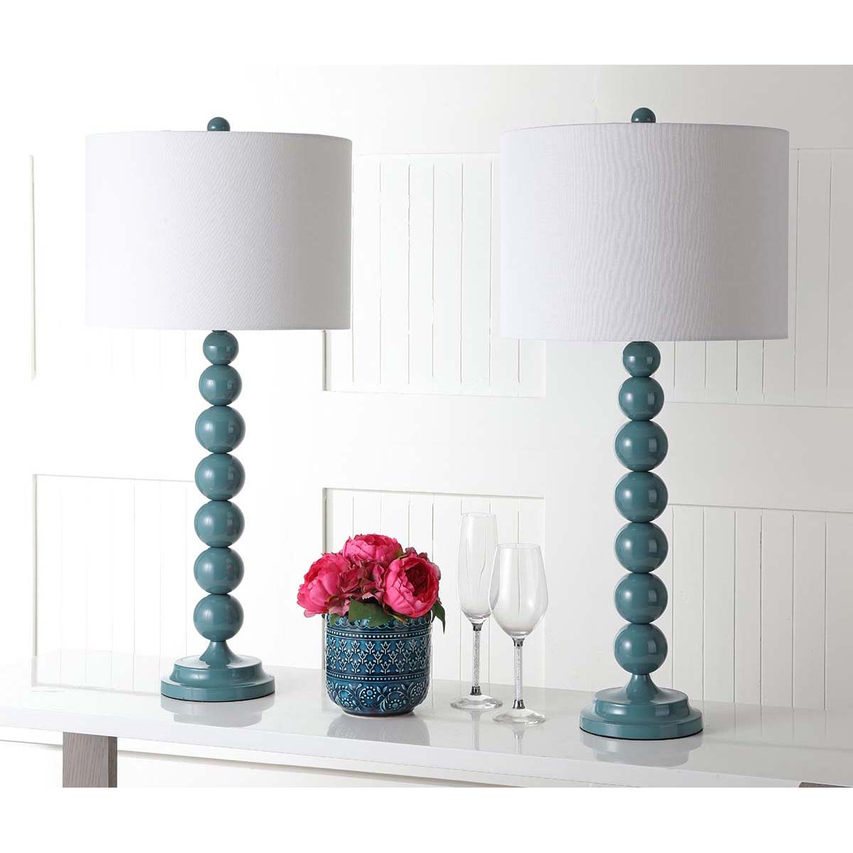Light up your life with the perfect symmetry of this gleaming marine blue stacked ball lamp. The tall, lean silhouette adds height on a console or hall table and the uniform color of base, neck and final are complemented by the white cotton drum shade.