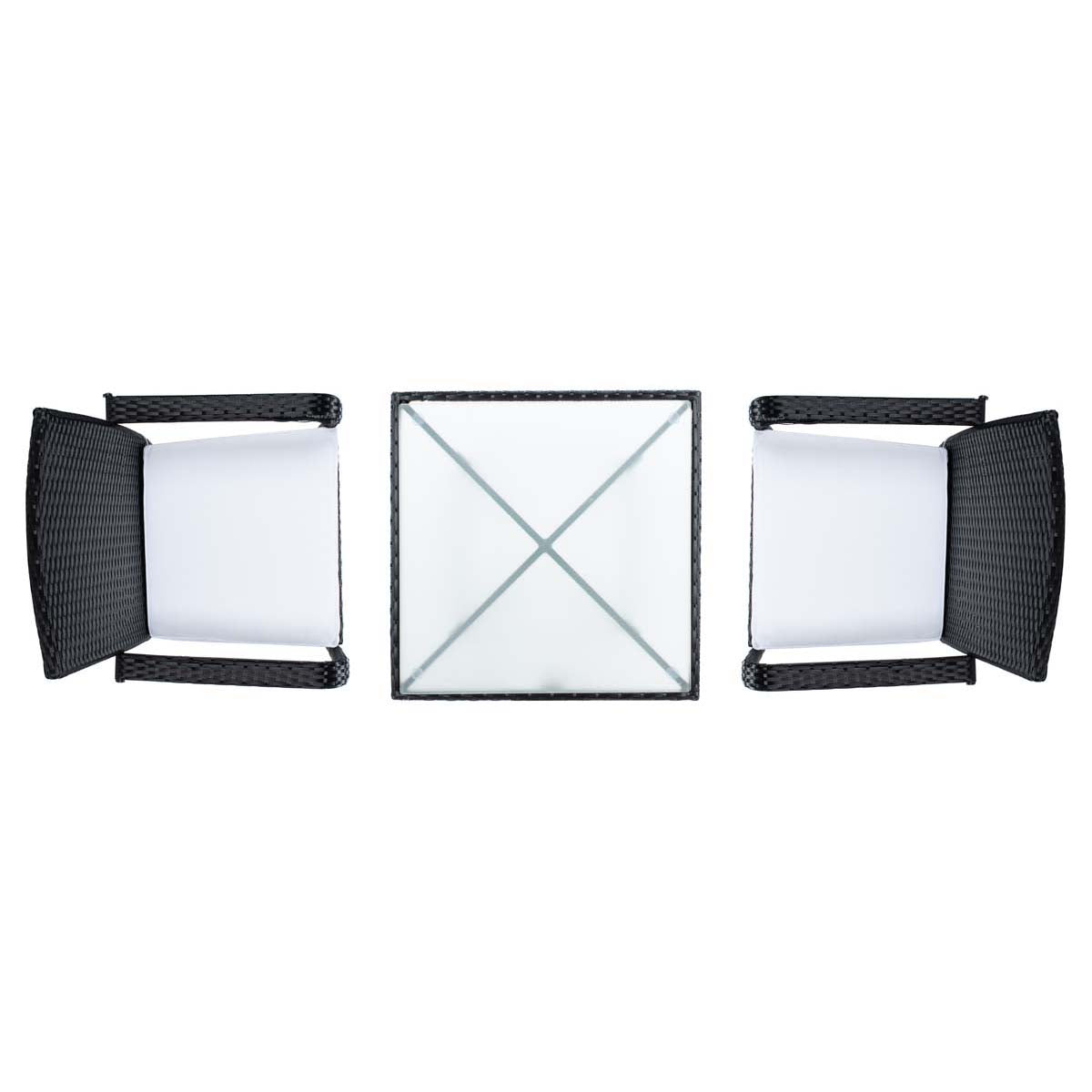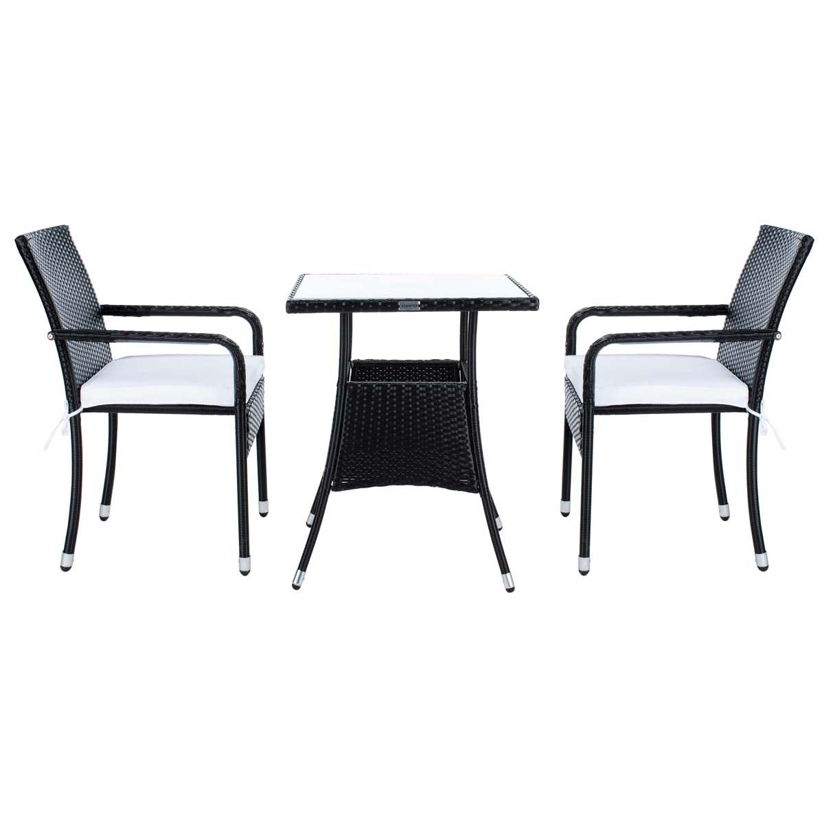 Enjoy al fresco dining with this contemporary-chic Laban Bistro Set. The subtly reclined backs and plush white cushions of Laban?? two black PE rattan chairs allow for maximum relaxation, and its matching glass-topped table is effortlessly elegant.