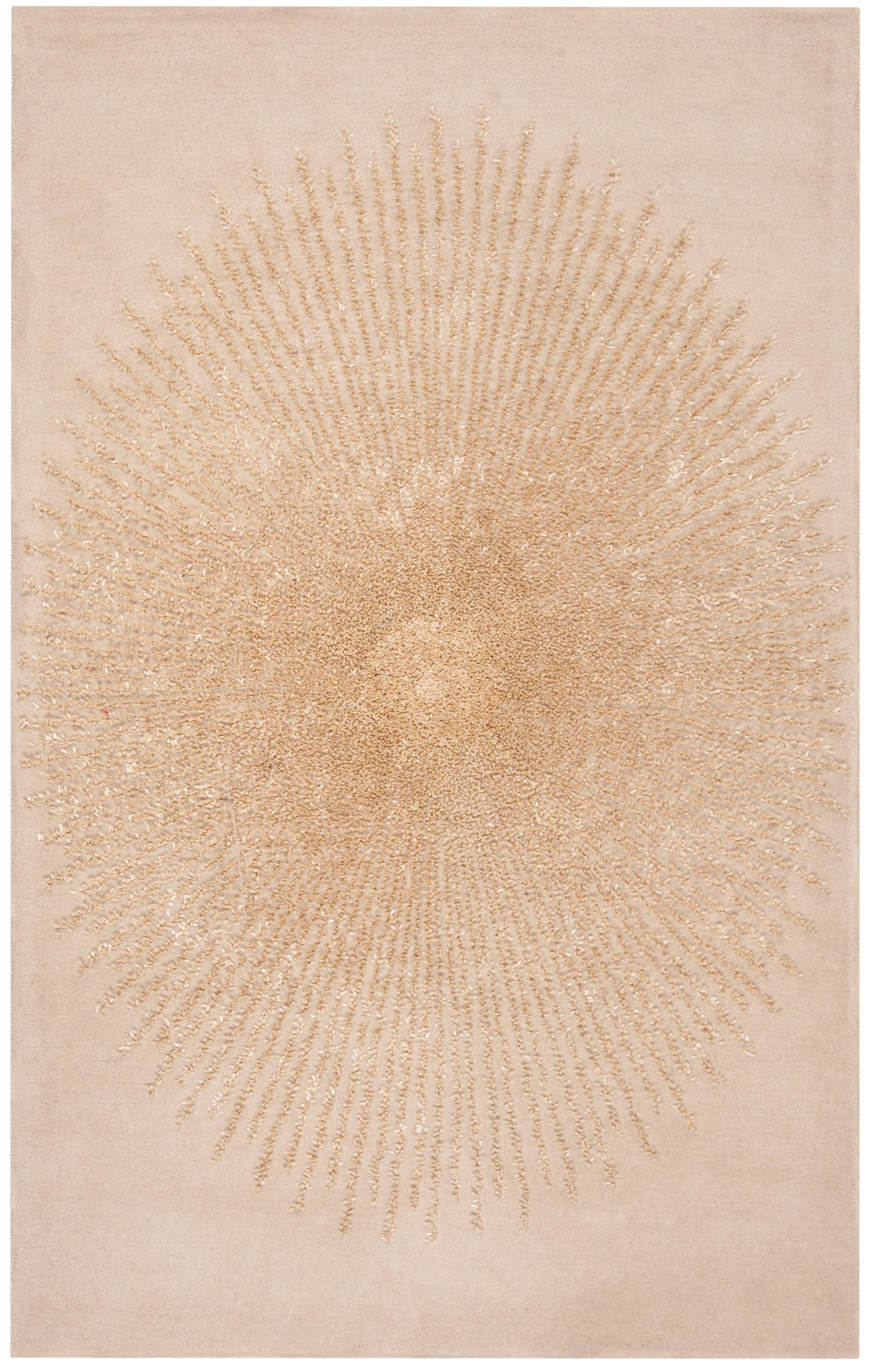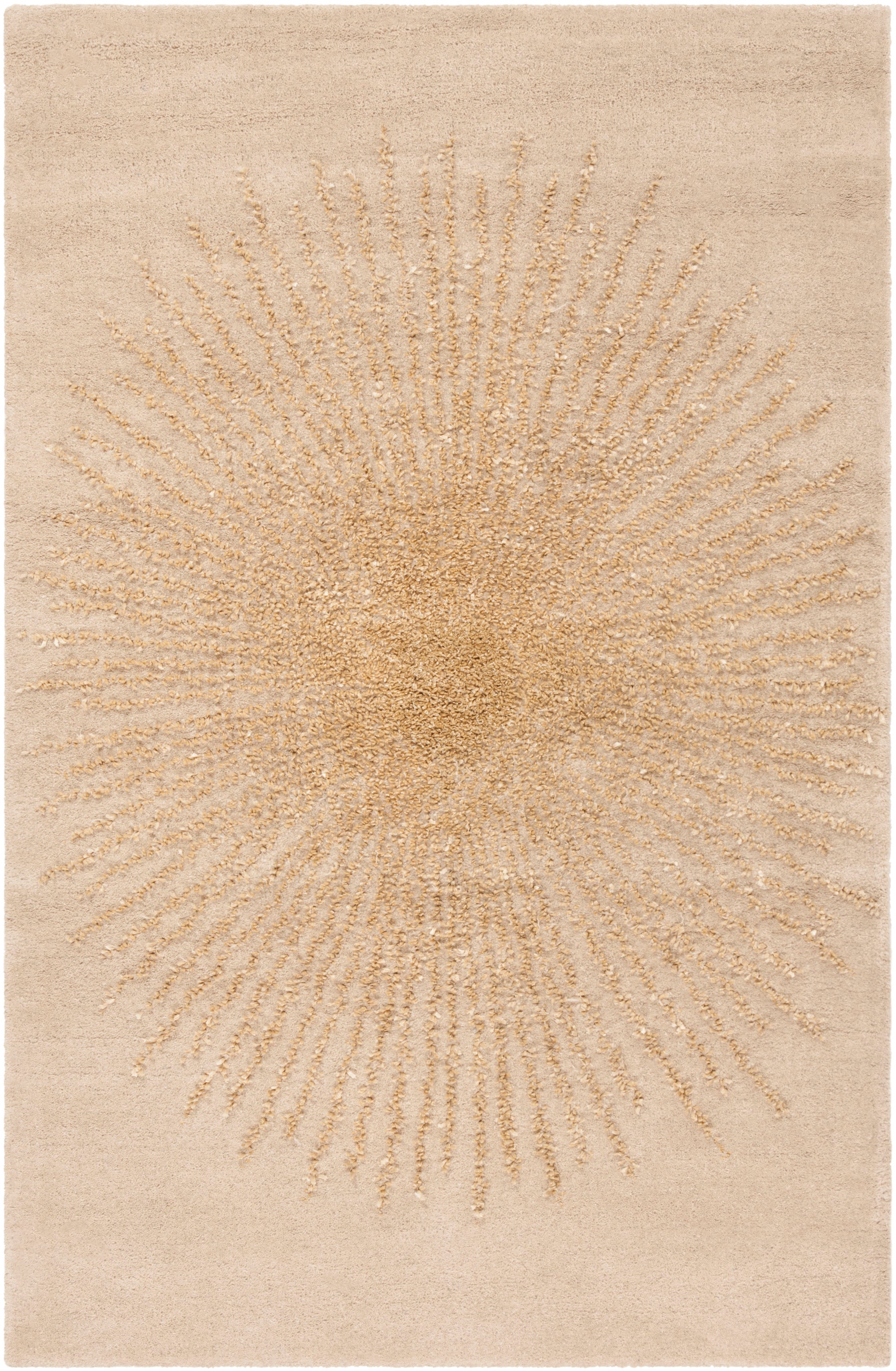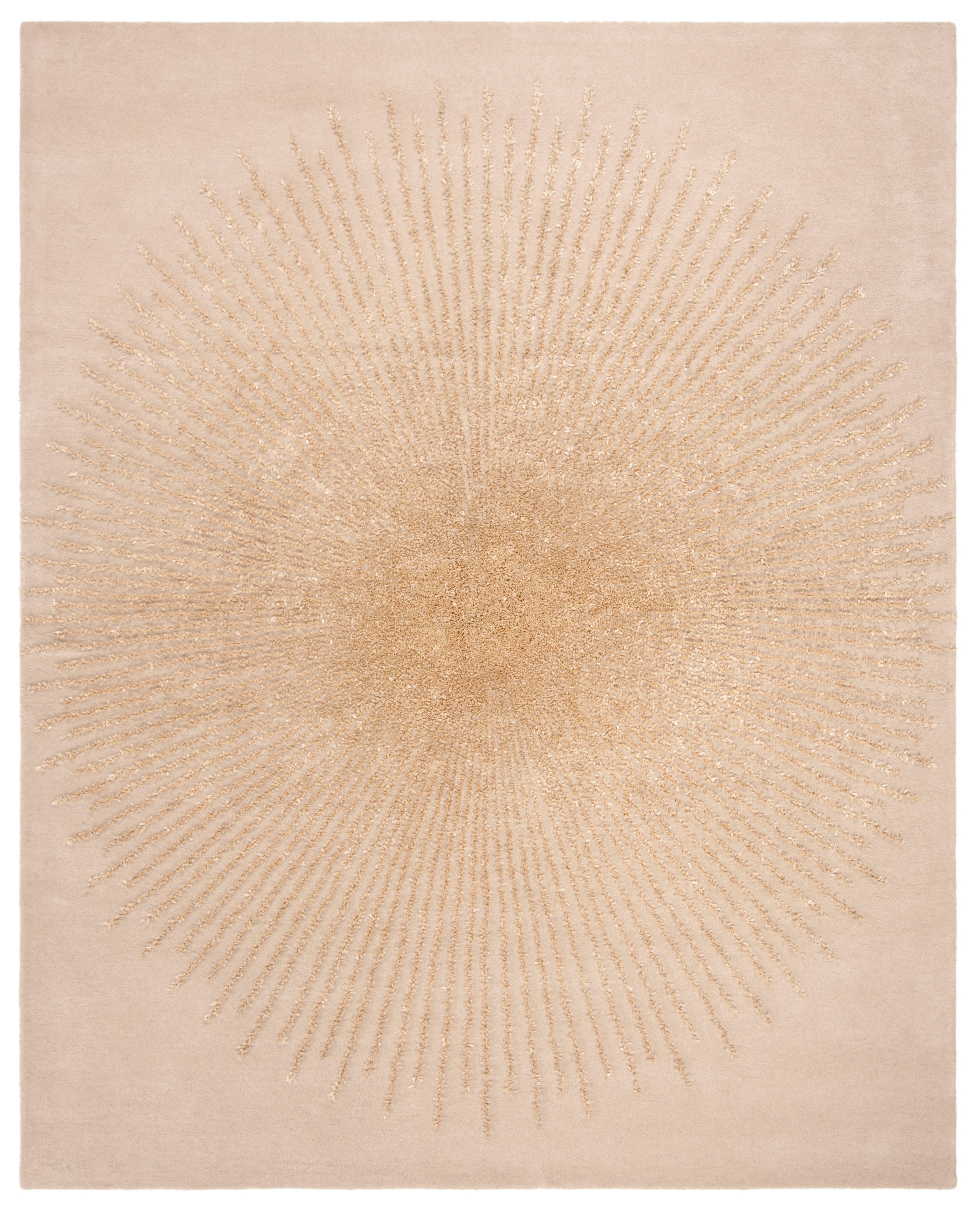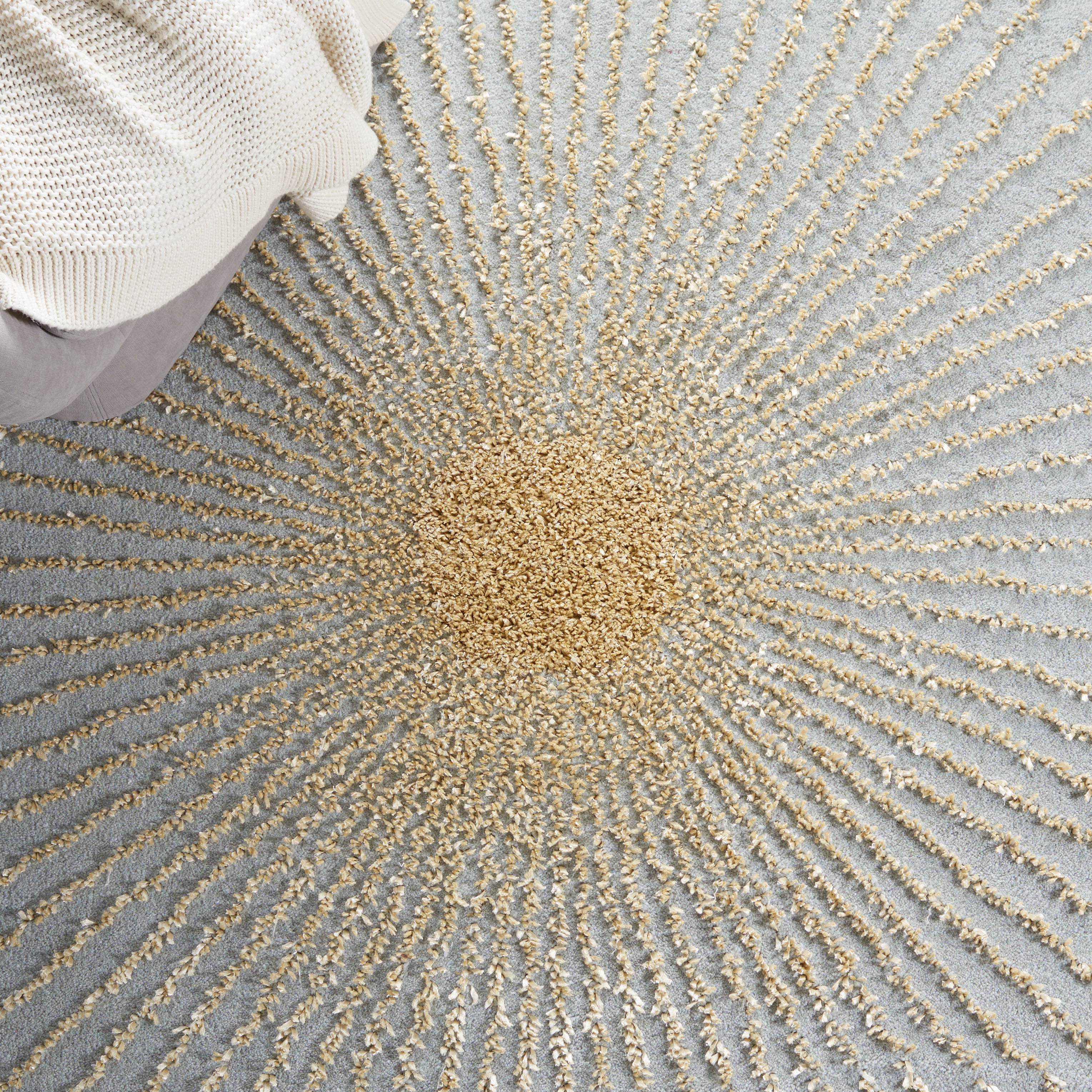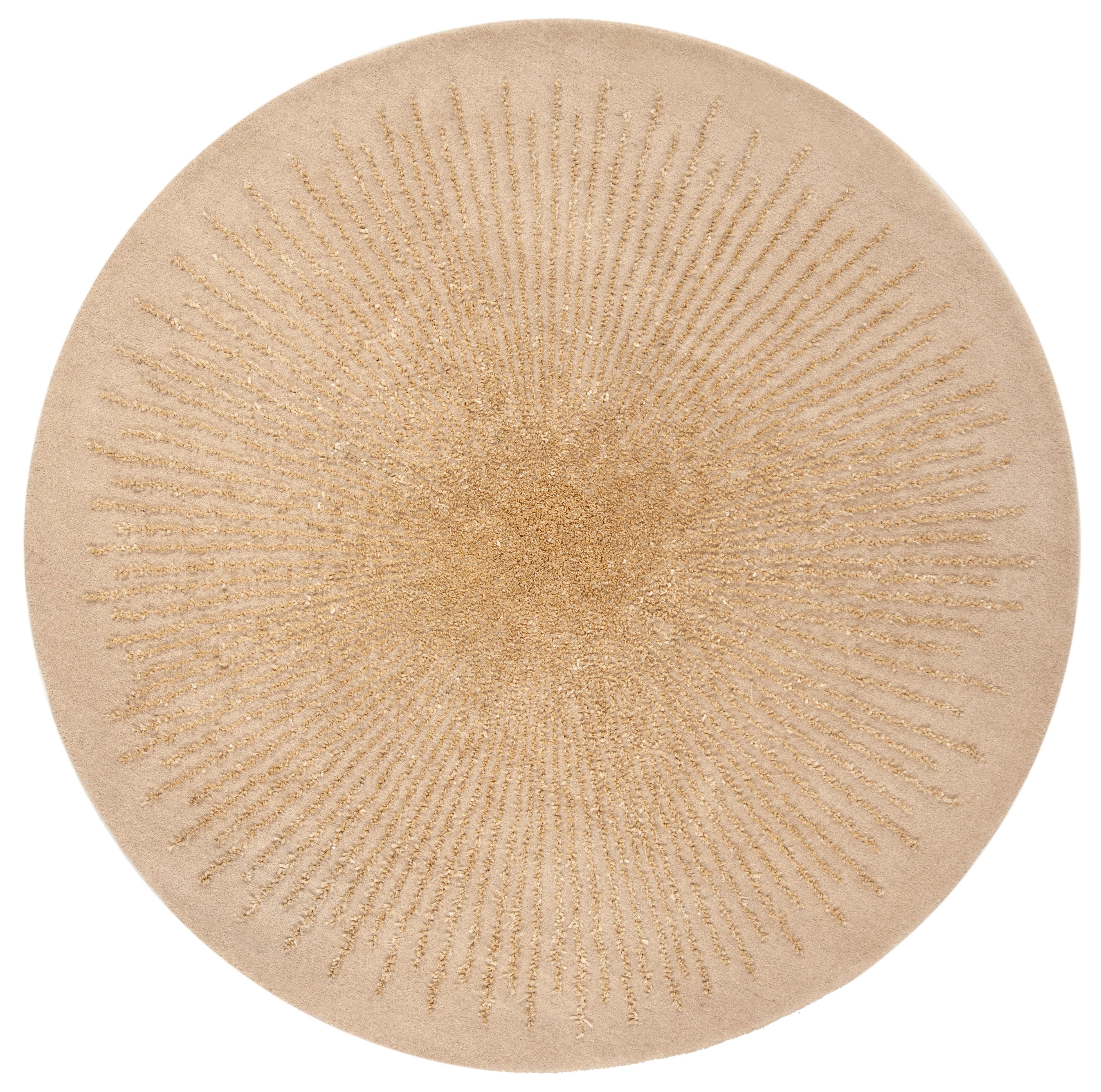 The rug's inviting beige tone serves as a versatile backdrop for its exquisite pattern, radiating from the center like golden rays of sunshine. The contrast between the subtle beige background and the shimmering, textured pattern creates a captivating visual effect, lending a touch of sophistication and warmth to any room.