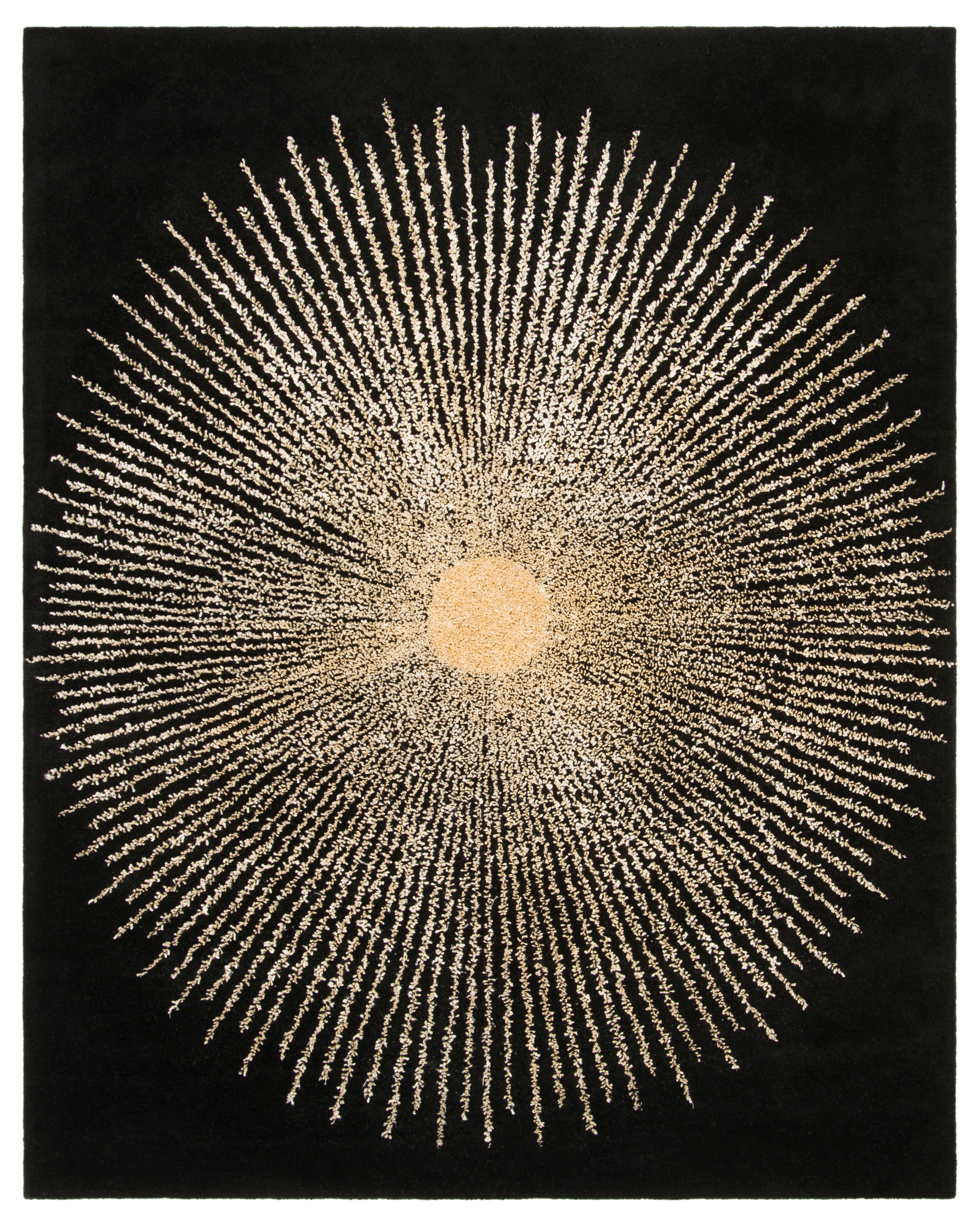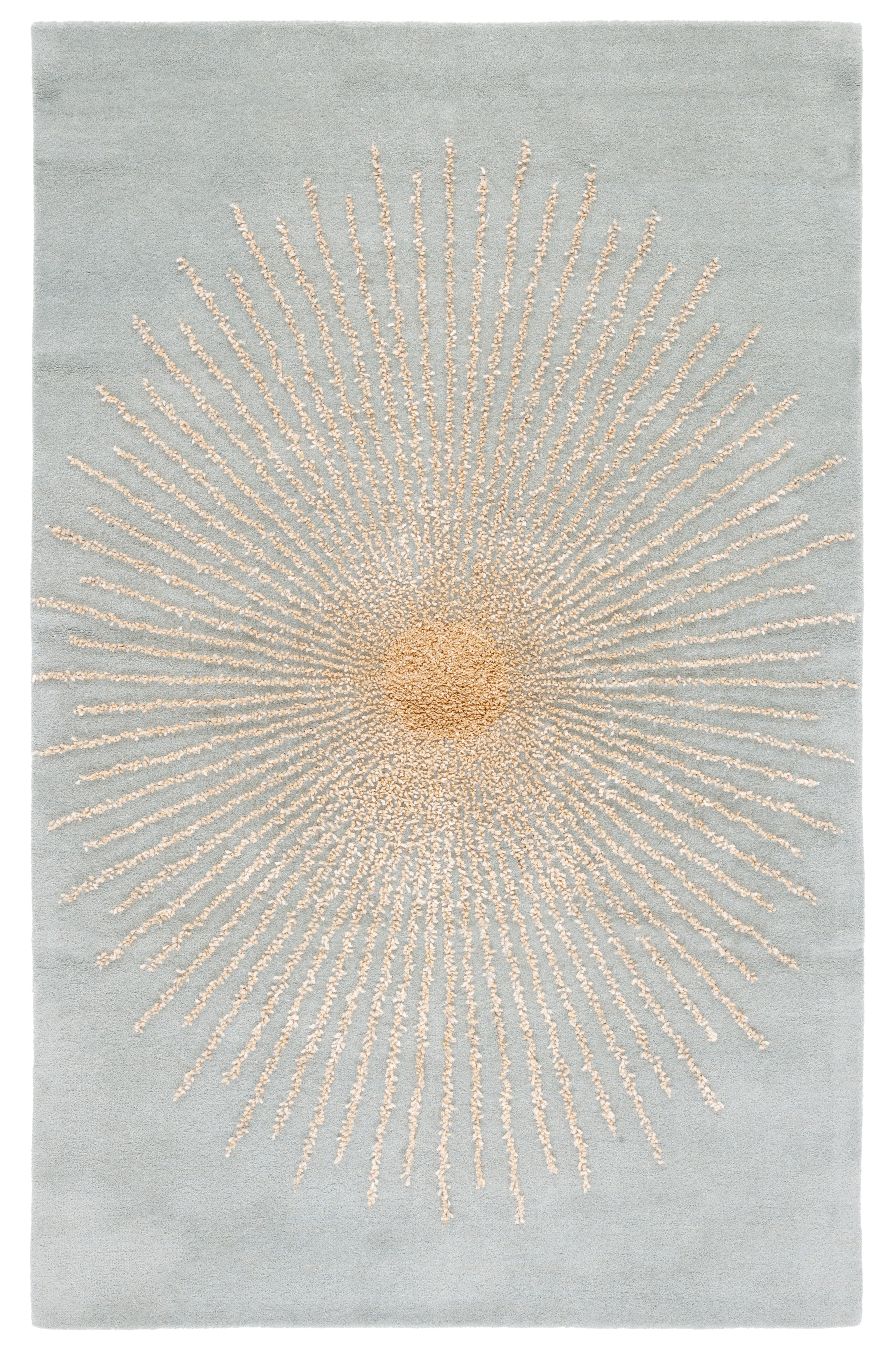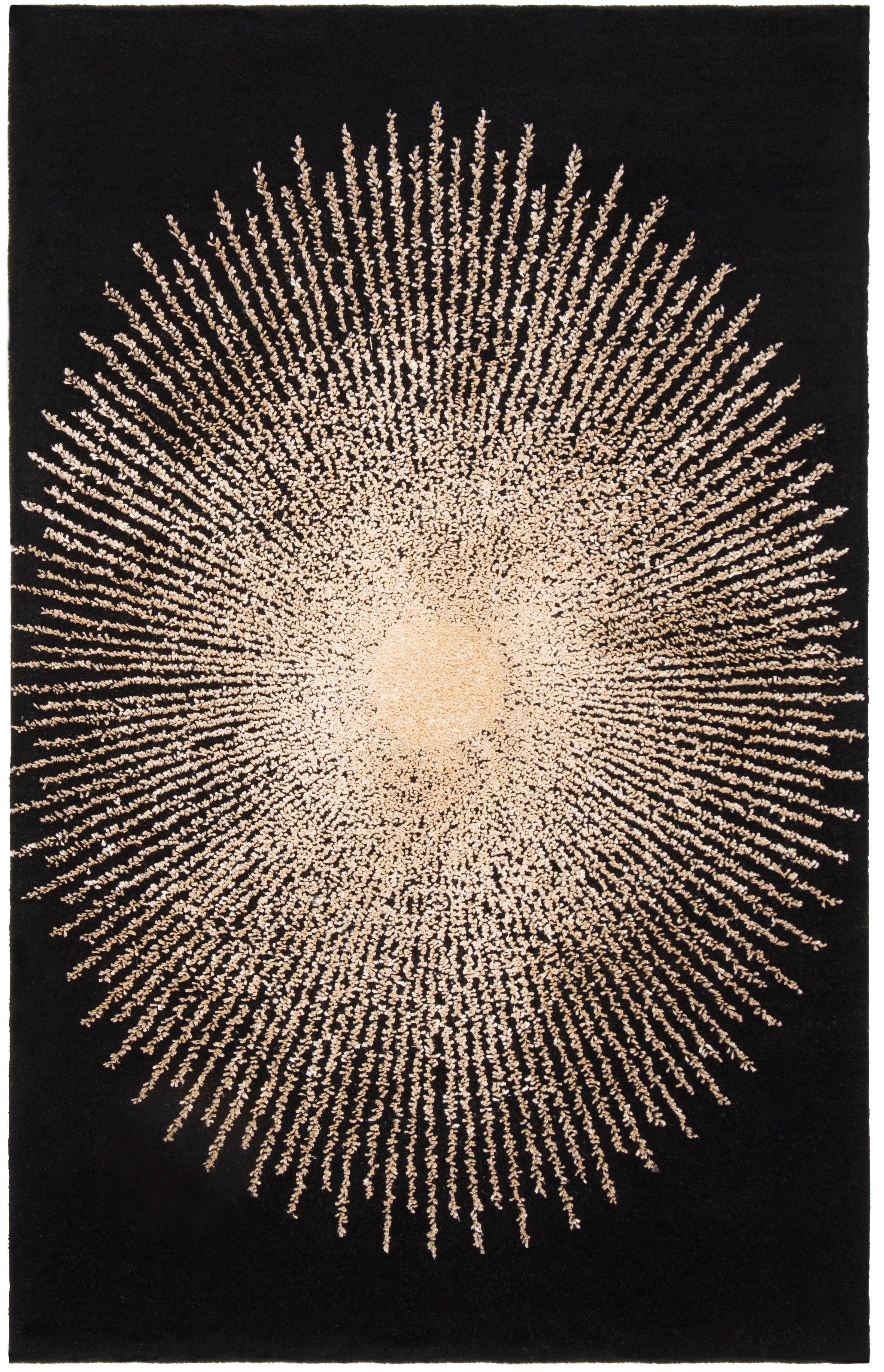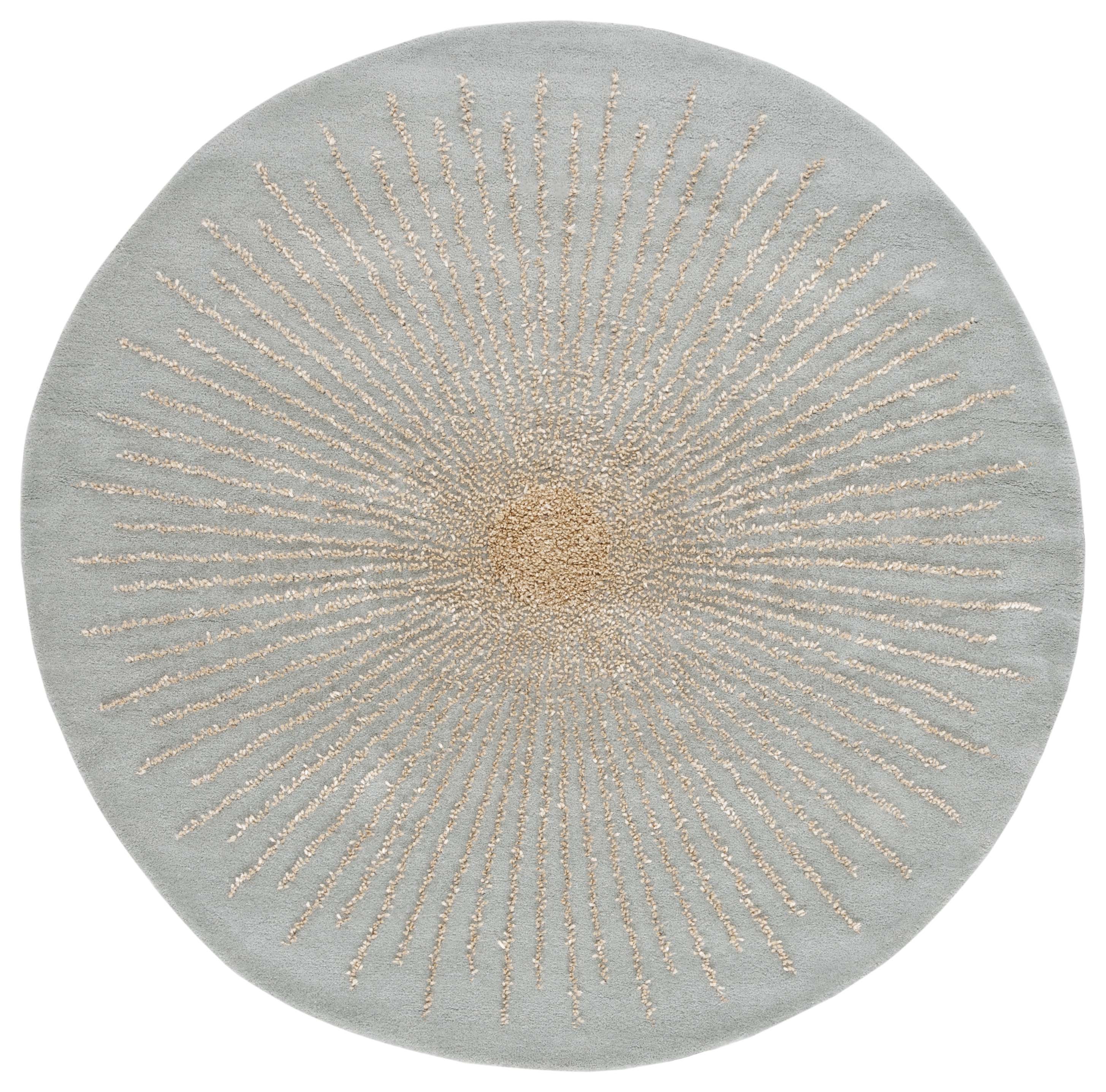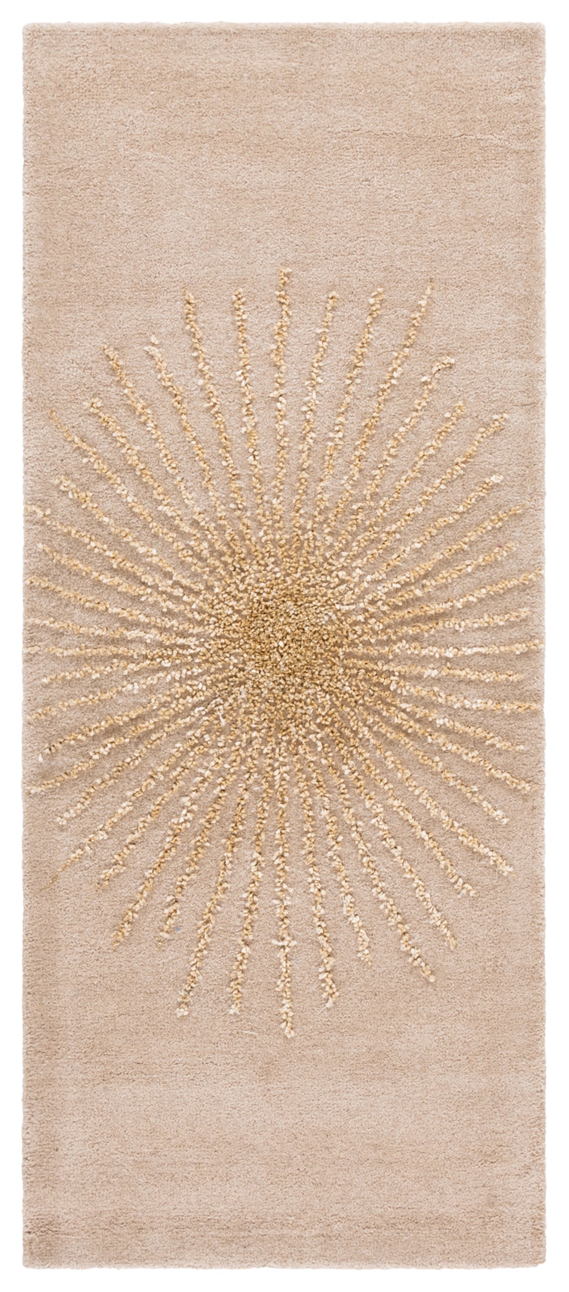 The rug's inviting beige tone serves as a versatile backdrop for its exquisite pattern, radiating from the center like golden rays of sunshine. The contrast between the subtle beige background and the shimmering, textured pattern creates a captivating visual effect, lending a touch of sophistication and warmth to any room.