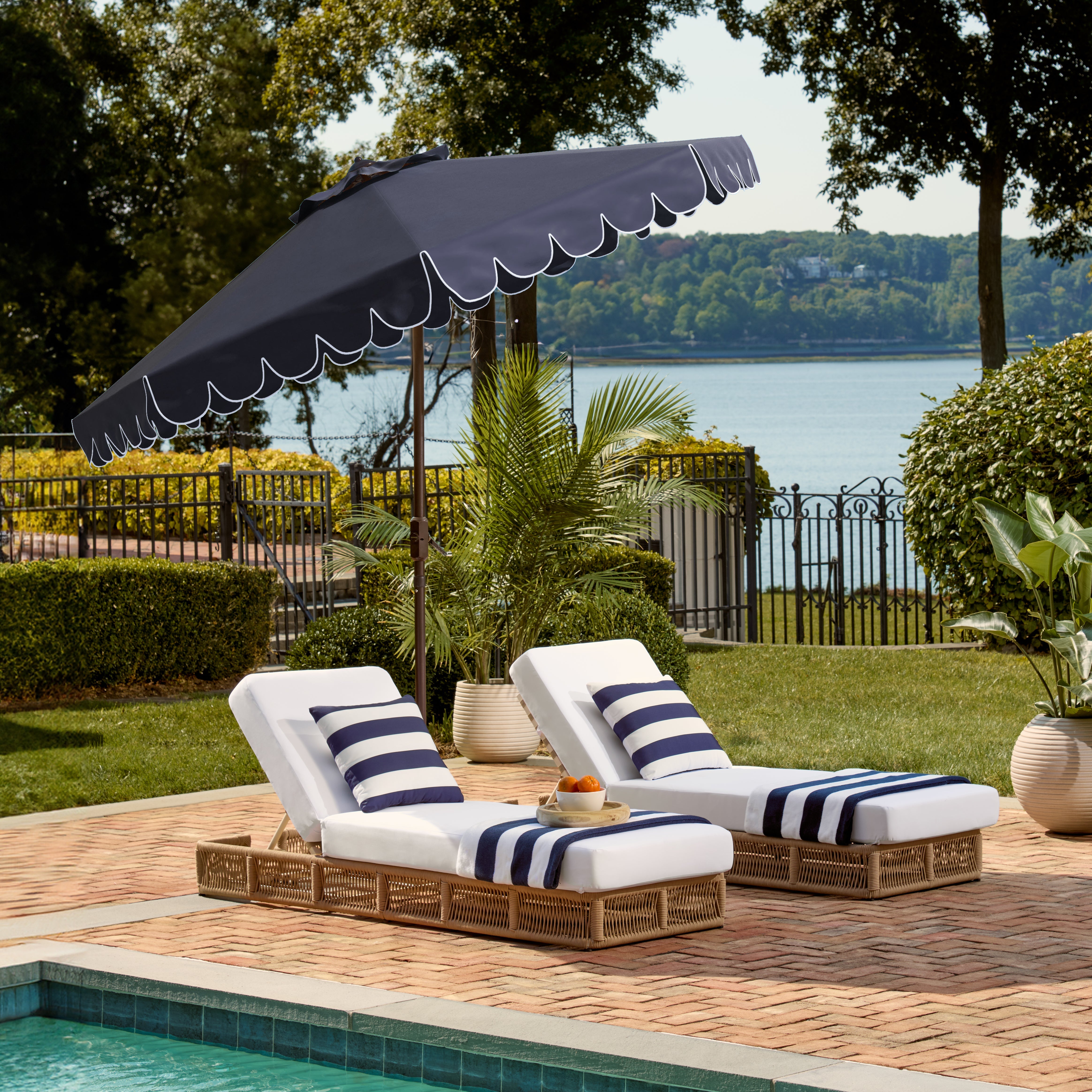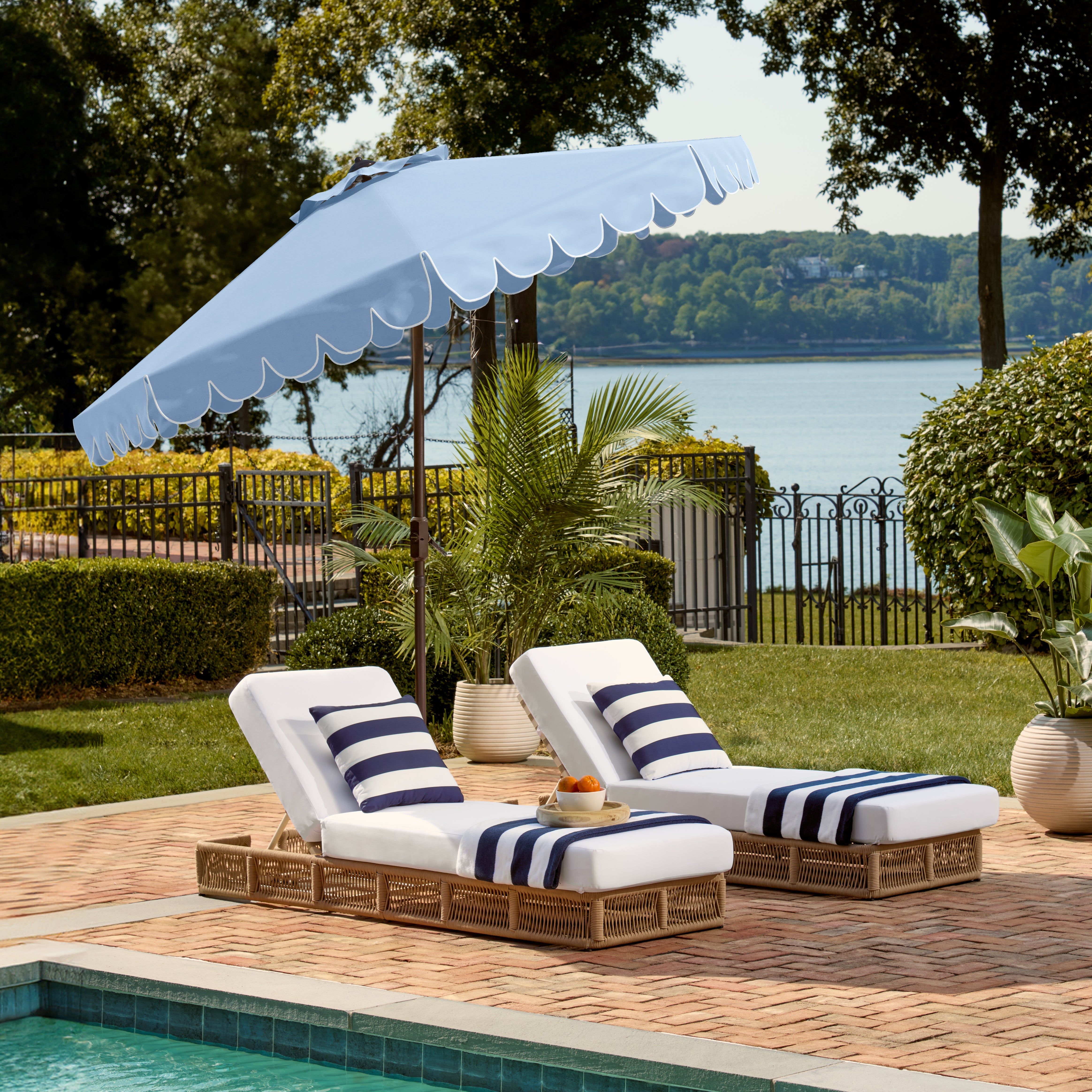 The signature coloration of Santorini's lush legendary resort inspired this nine foot crank umbrella. Its sophisticated hues features a single scallop white trim to create an outdoor retreat for the modern tastemaker.