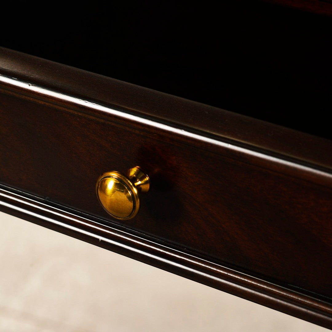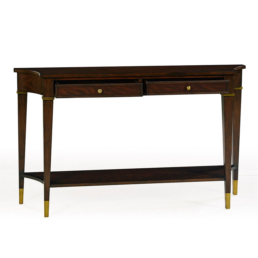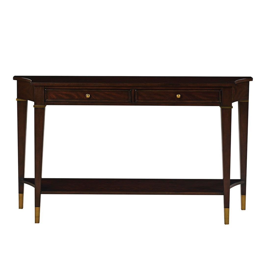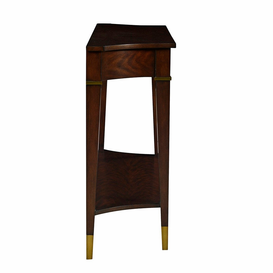 Our Salem Console Table features a traditional shape, curved corners, two drawers, hand-turned solid brass hardware, a shaped shelf, and tapered legs.