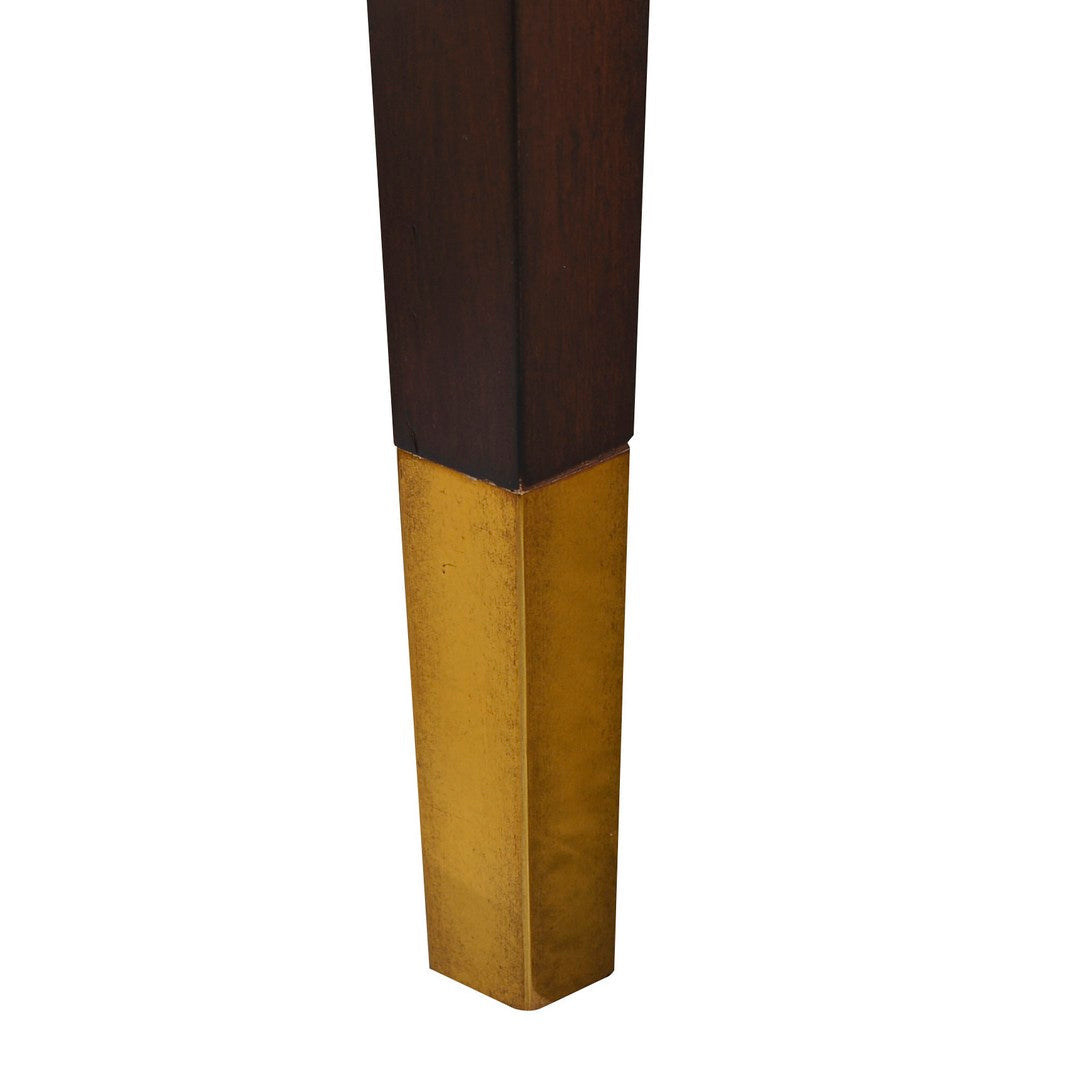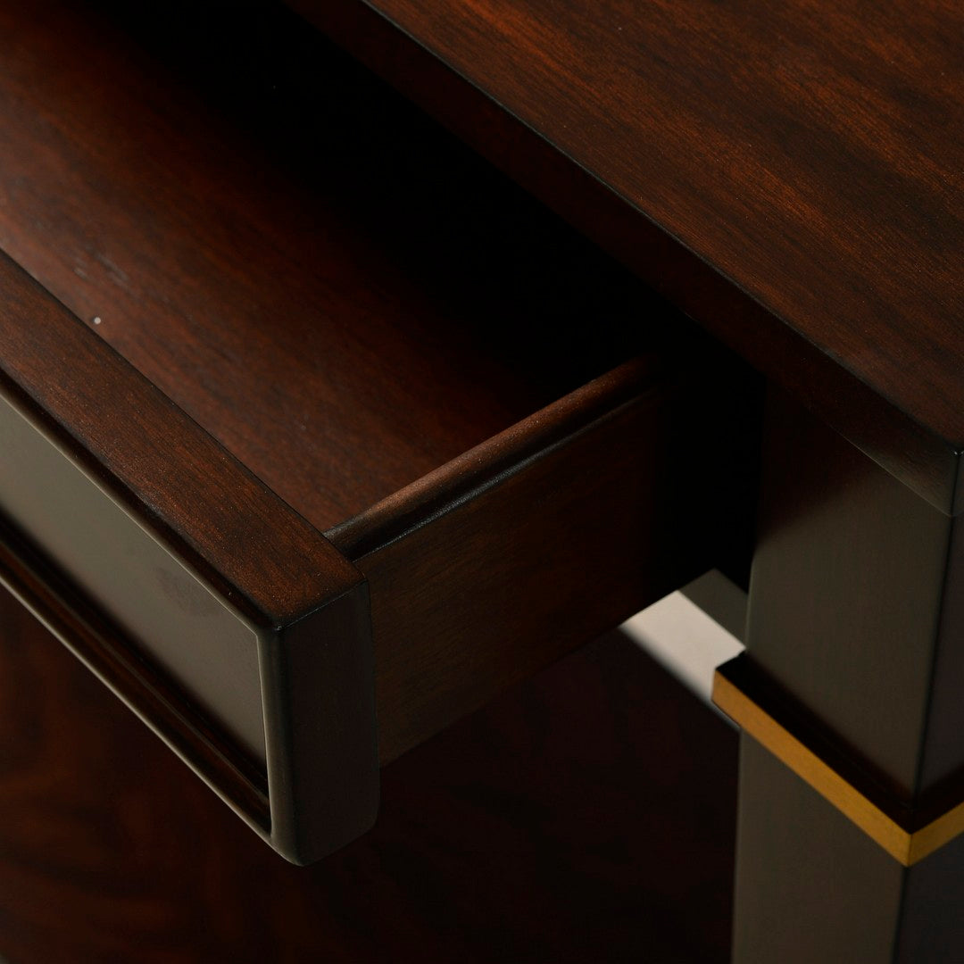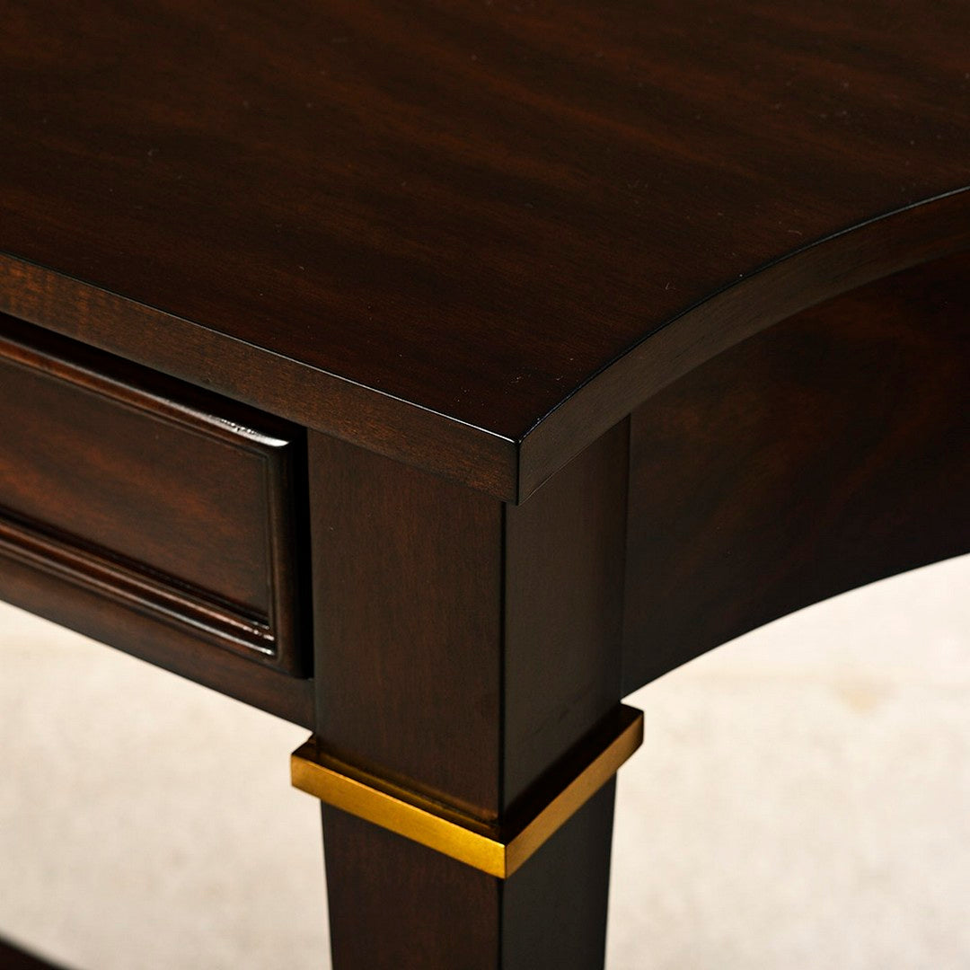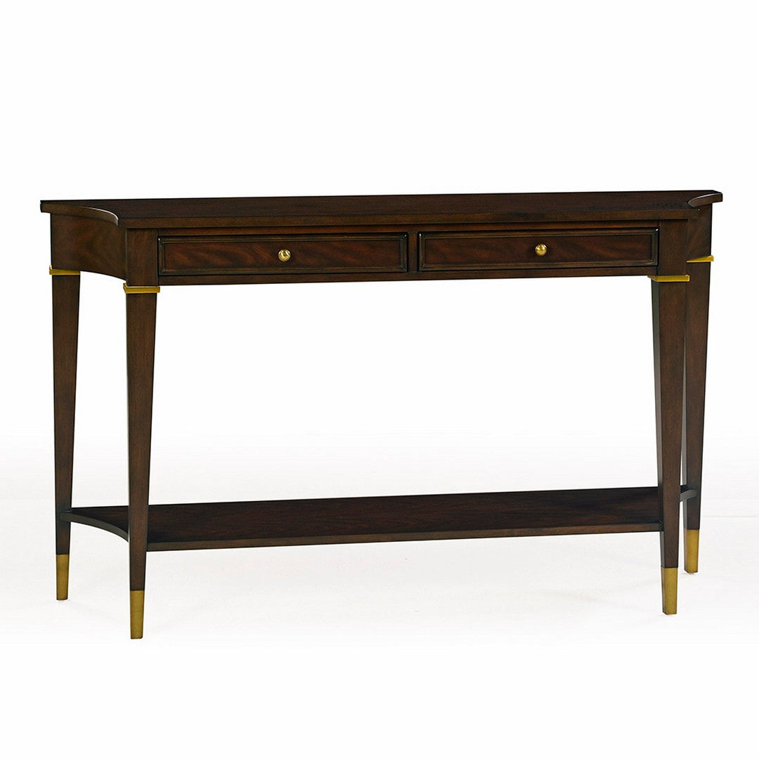 Our Salem Console Table features a traditional shape, curved corners, two drawers, hand-turned solid brass hardware, a shaped shelf, and tapered legs.