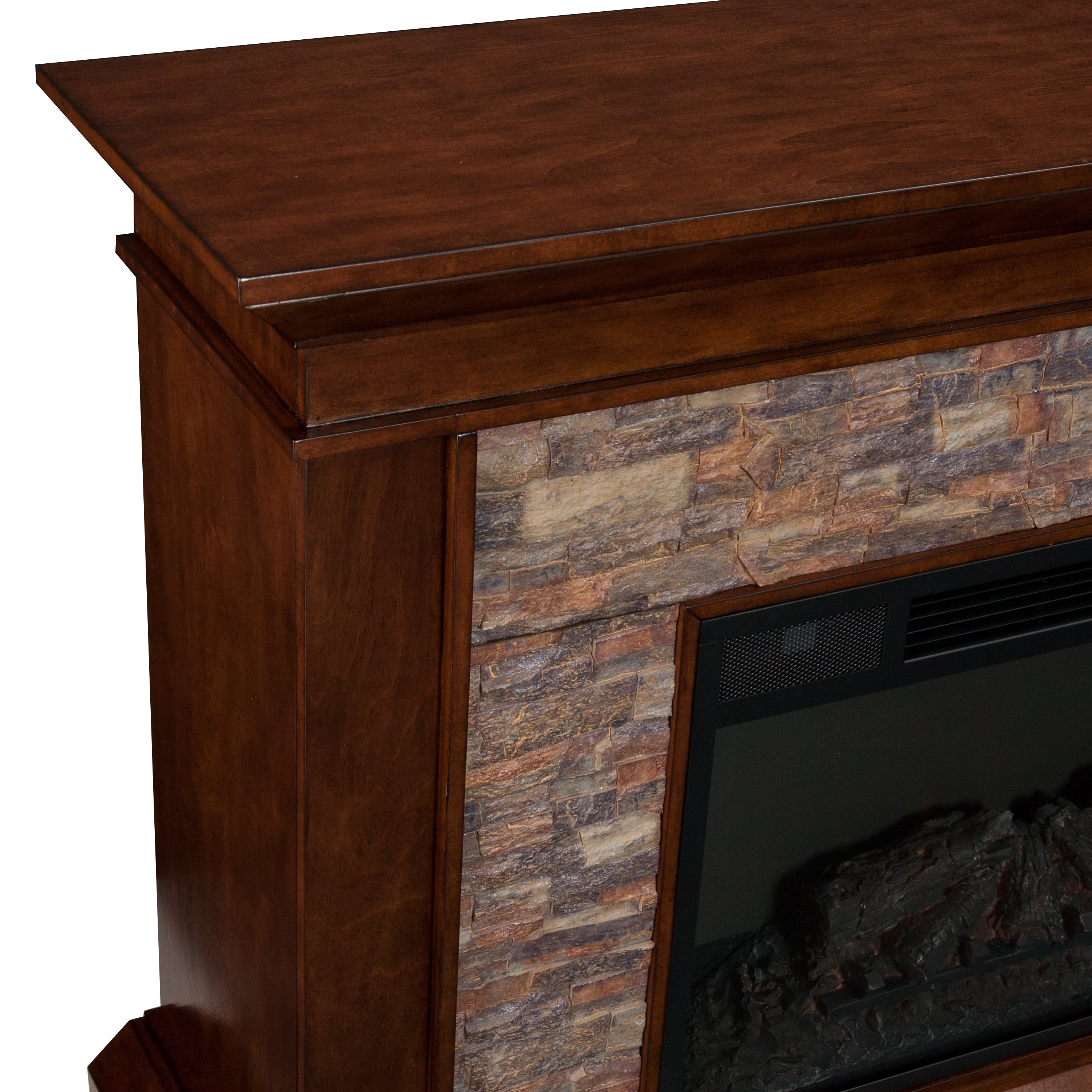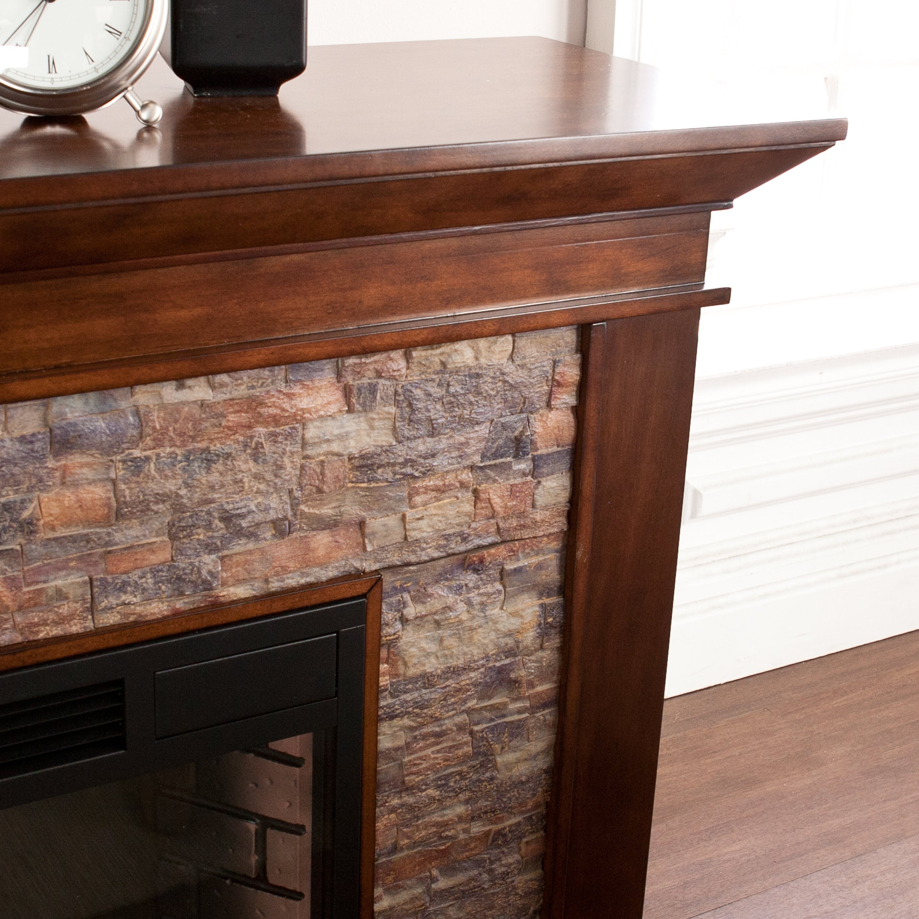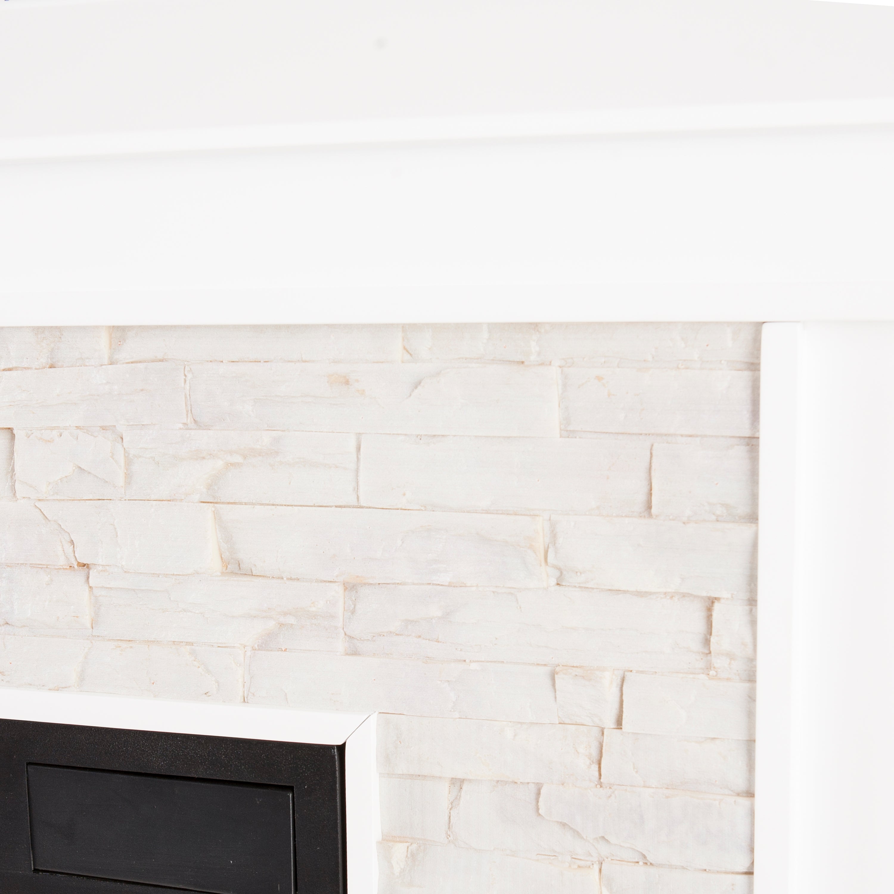 Coziness is a click away with this electric fireplace with mantel. Crown molding adds an elegant touch to your space while a crisp white finish and faux stacked stone bring modern flair. With a slightly larger 33 inch wide firebox, this electric fireplace converts any room into a warm haven. Enjoy flickering LED flames and lifelike embers with or without heat, all controlled from your sofa with the user-friendly remote. Transform your apartment into a comfortable retreat, or add to your living room for an instant warm and cozy feel. Any room becomes a serene sanctuary with this stacked stone fireplace.