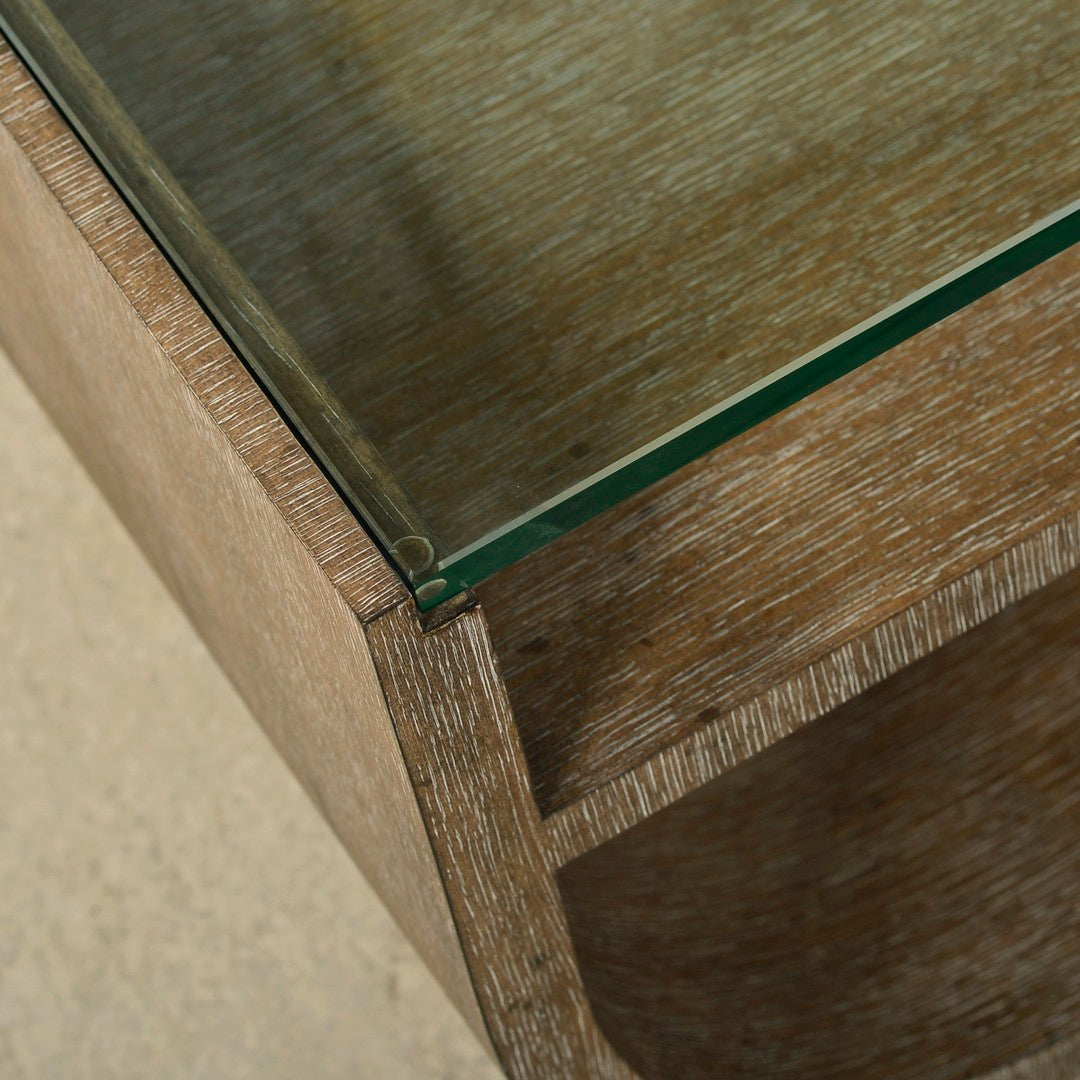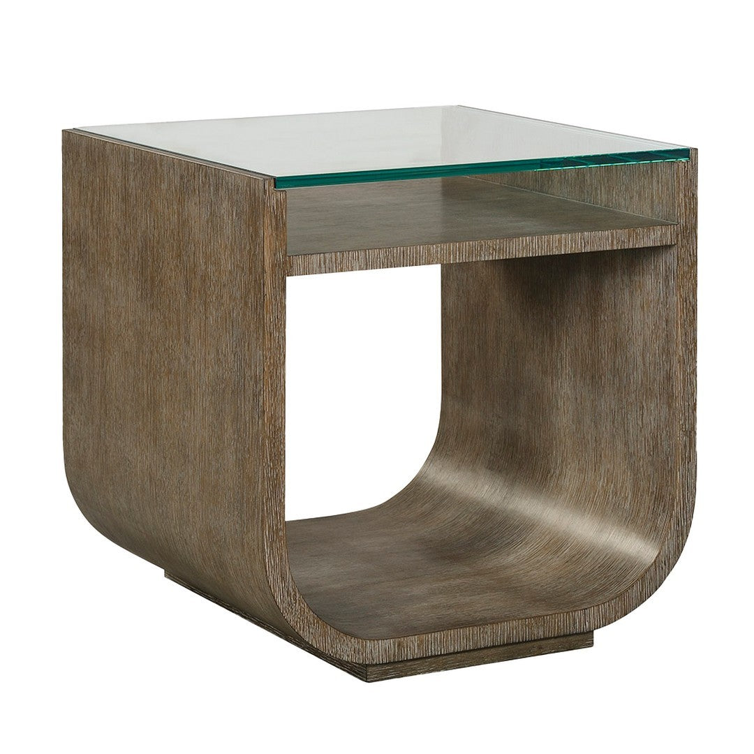 Our Soho Side Table features a drop-in tempered glass top, shelving, and an organic shape.