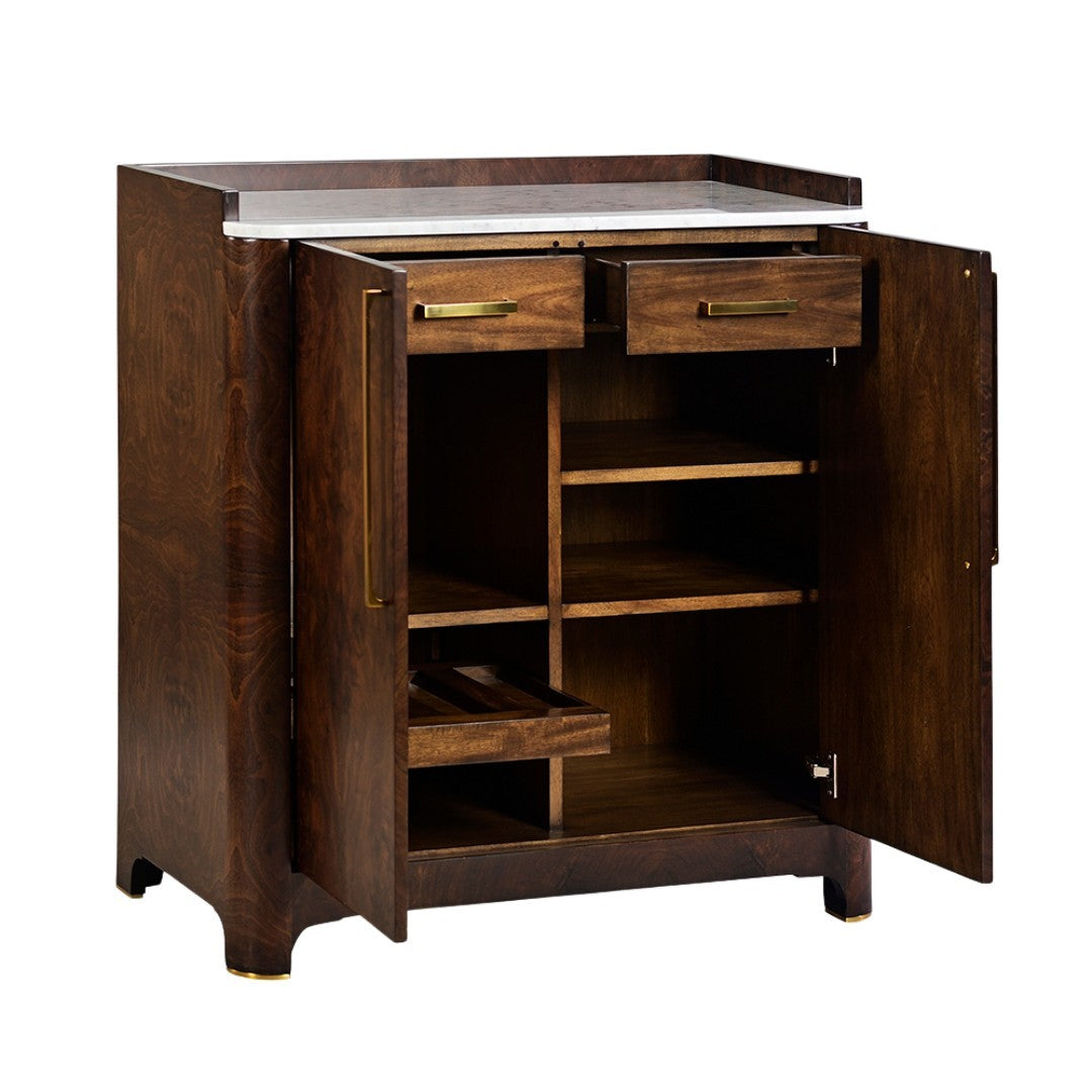 Our Syracuse Bar Cabinet features a marble, inset top with a lip frame, curved front corners and a shaped apron, and finished brass plate feet. Two smooth doors open to 45 degrees with long, brass rod pulls. The interior features two storage drawers, bottle storage, and five open storage shelves