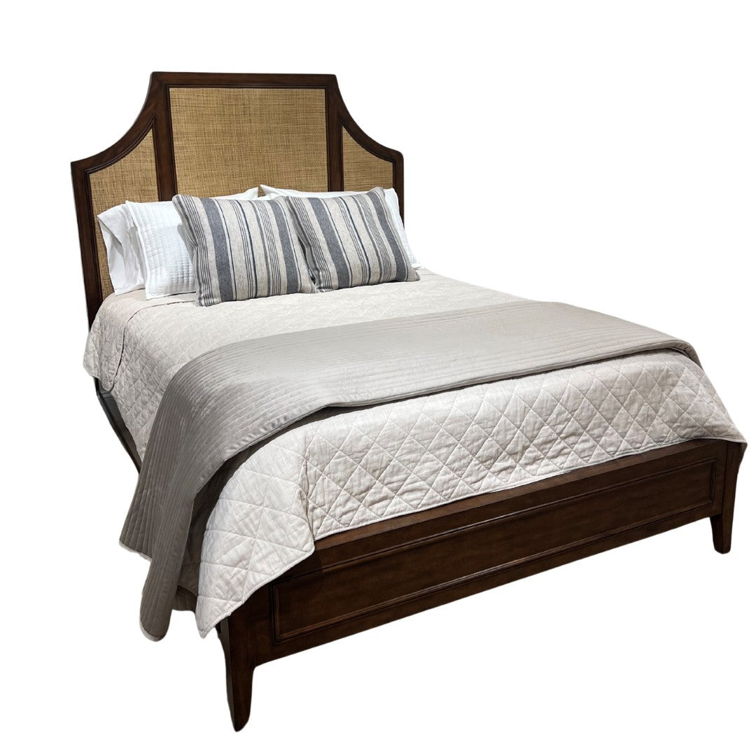 Our Ventura King Bed features a shaped headboard with a cane panel inlay, a bead trim on the headboard, and a bead trim panel on both the footboard and side rails