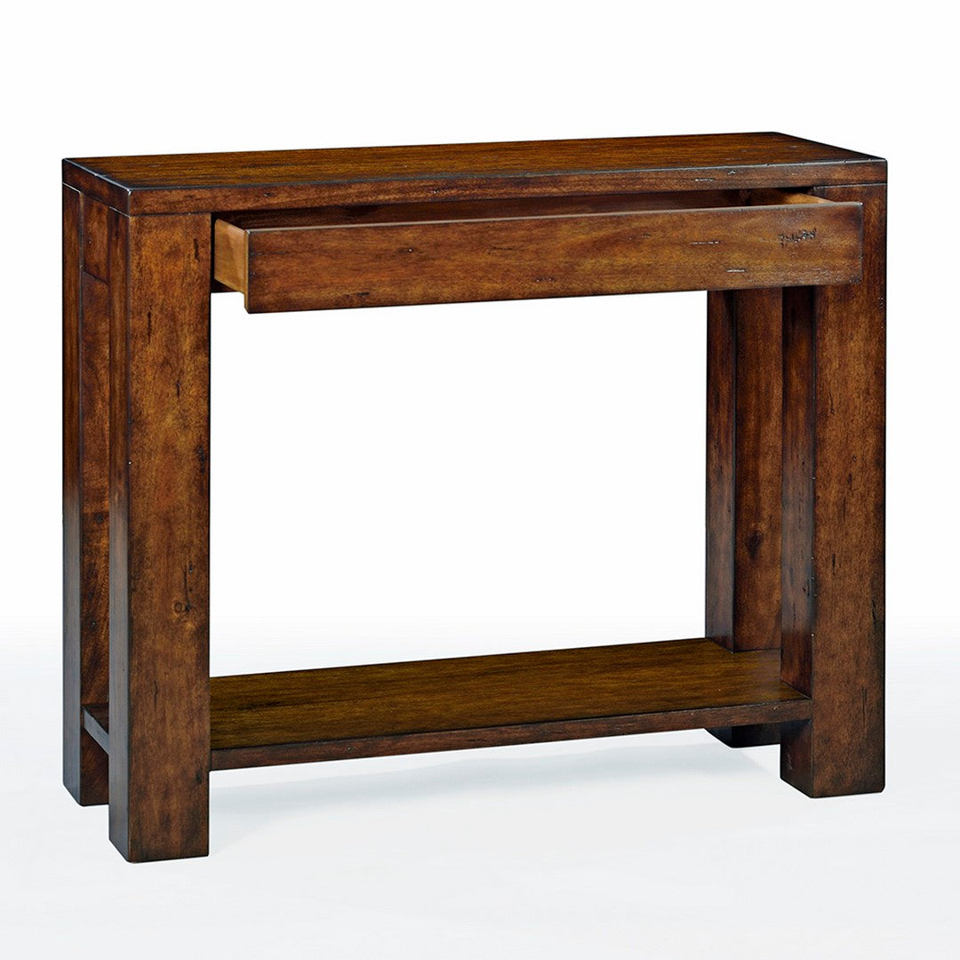 Our Villa Console Table features a thick, rectangular top and straight legs, one storage drawer in the apron, and a lower open shelf