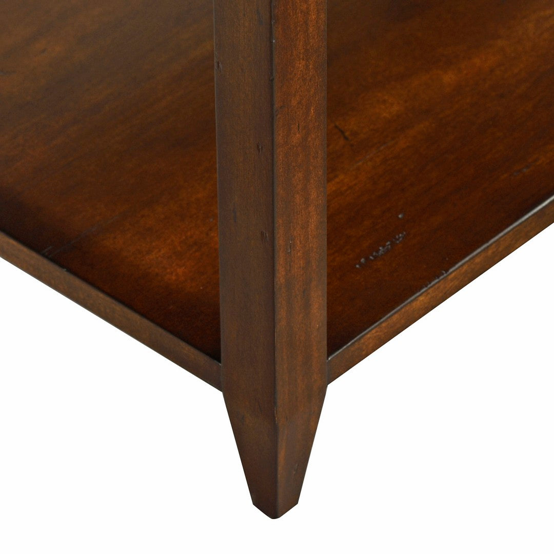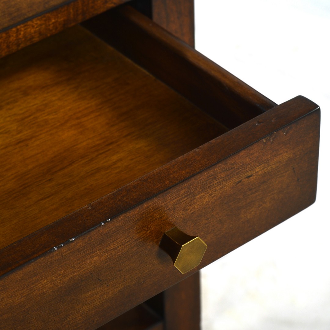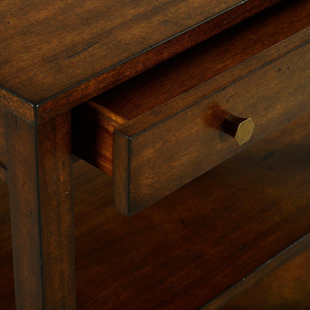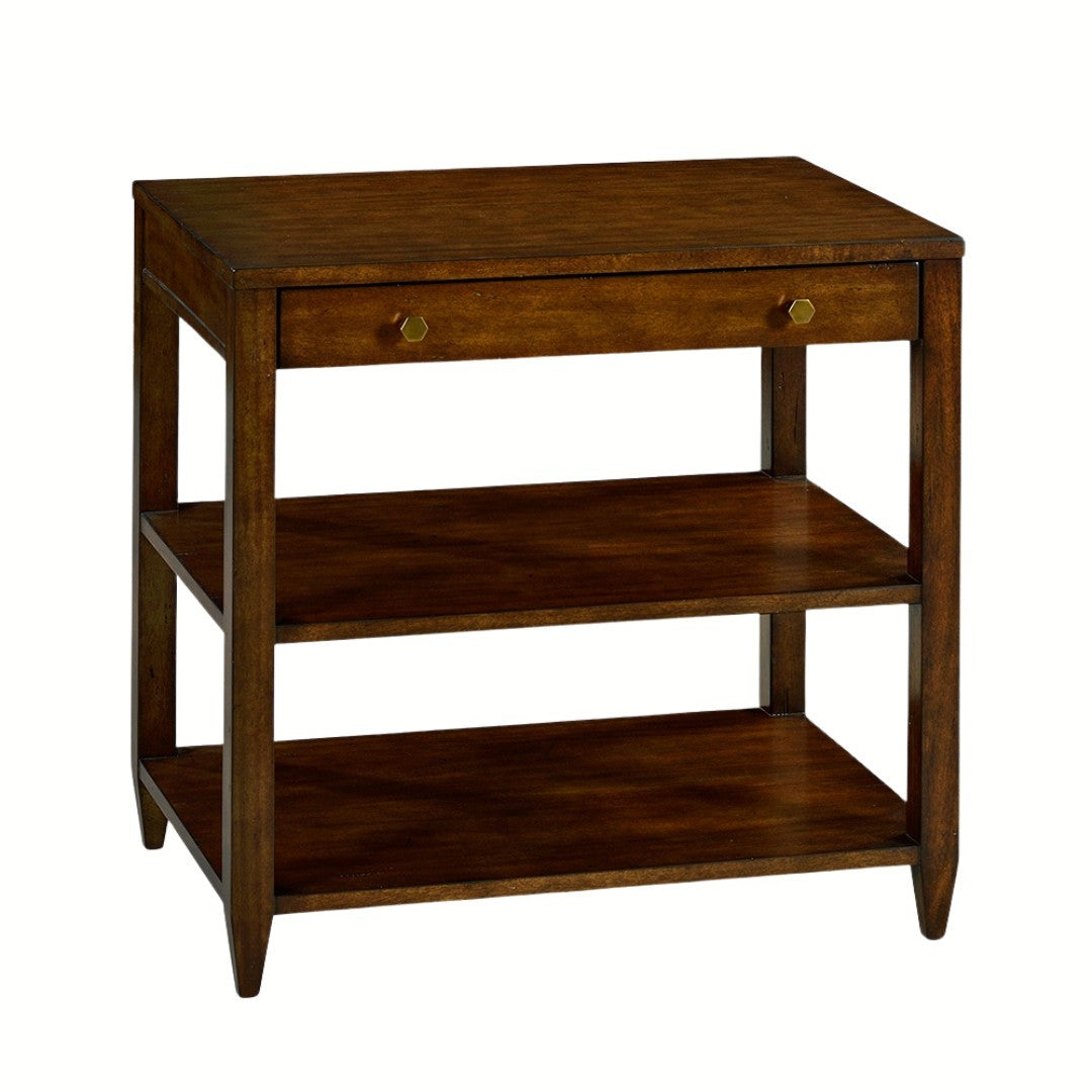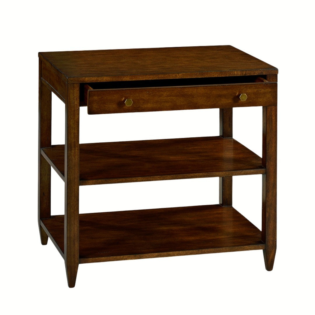 Our Wallace Wide Side Table features one drawer, two shelves, hand-cast hexagon shaped solid brass hardware, straight legs, and tapered feet.