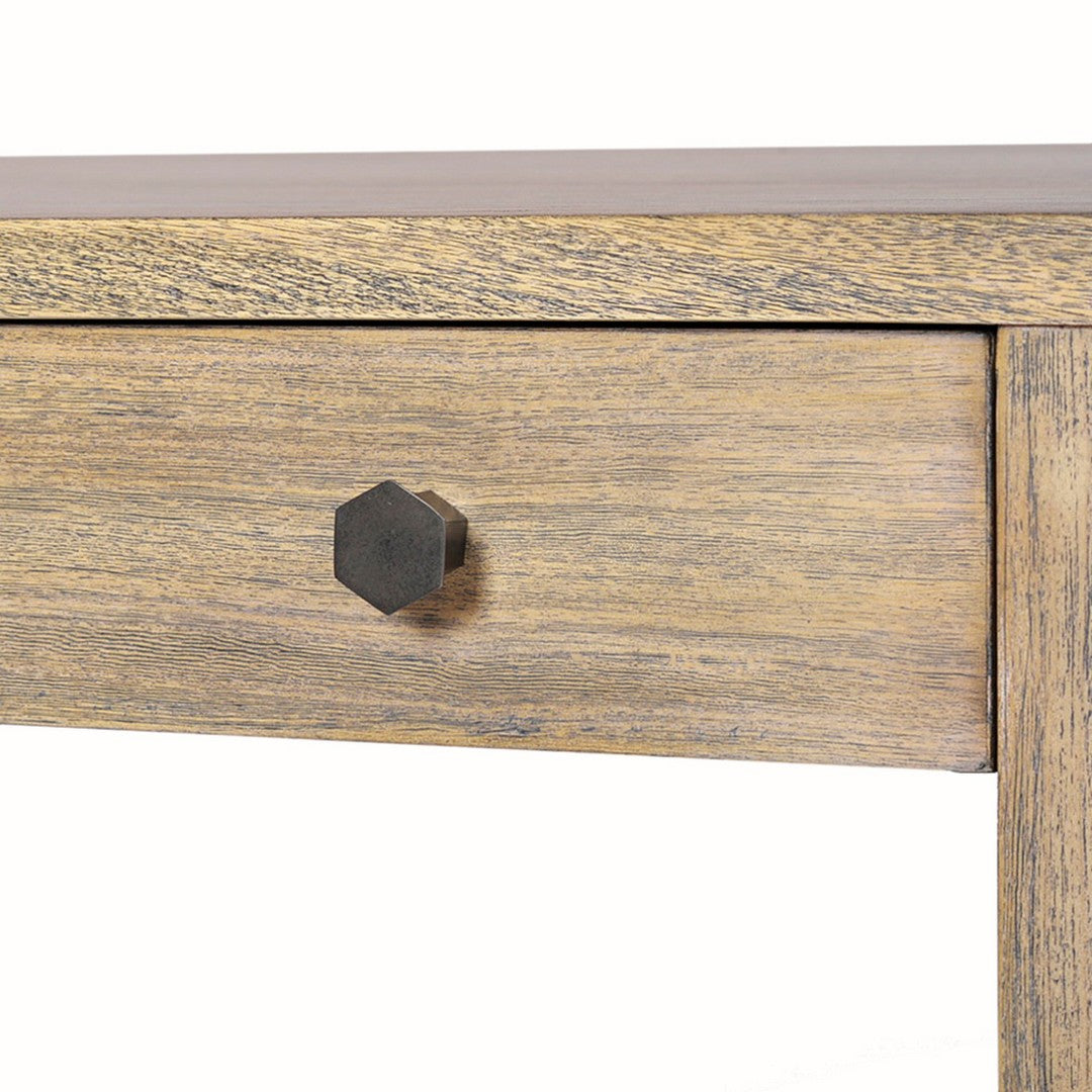 Our Wallace Wide Side Table features one drawer, two shelves, hand-cast hexagon shaped solid brass hardware, straight legs, and tapered feet.