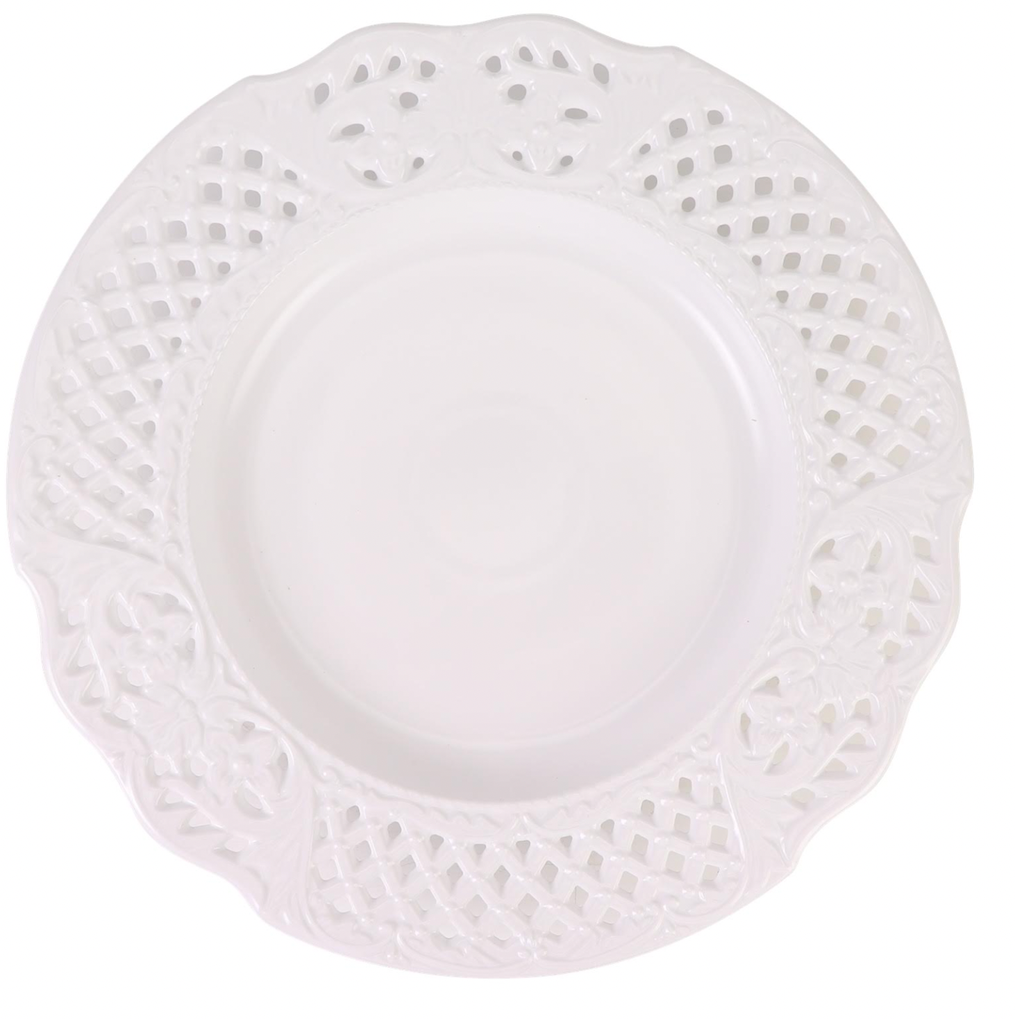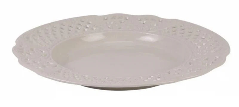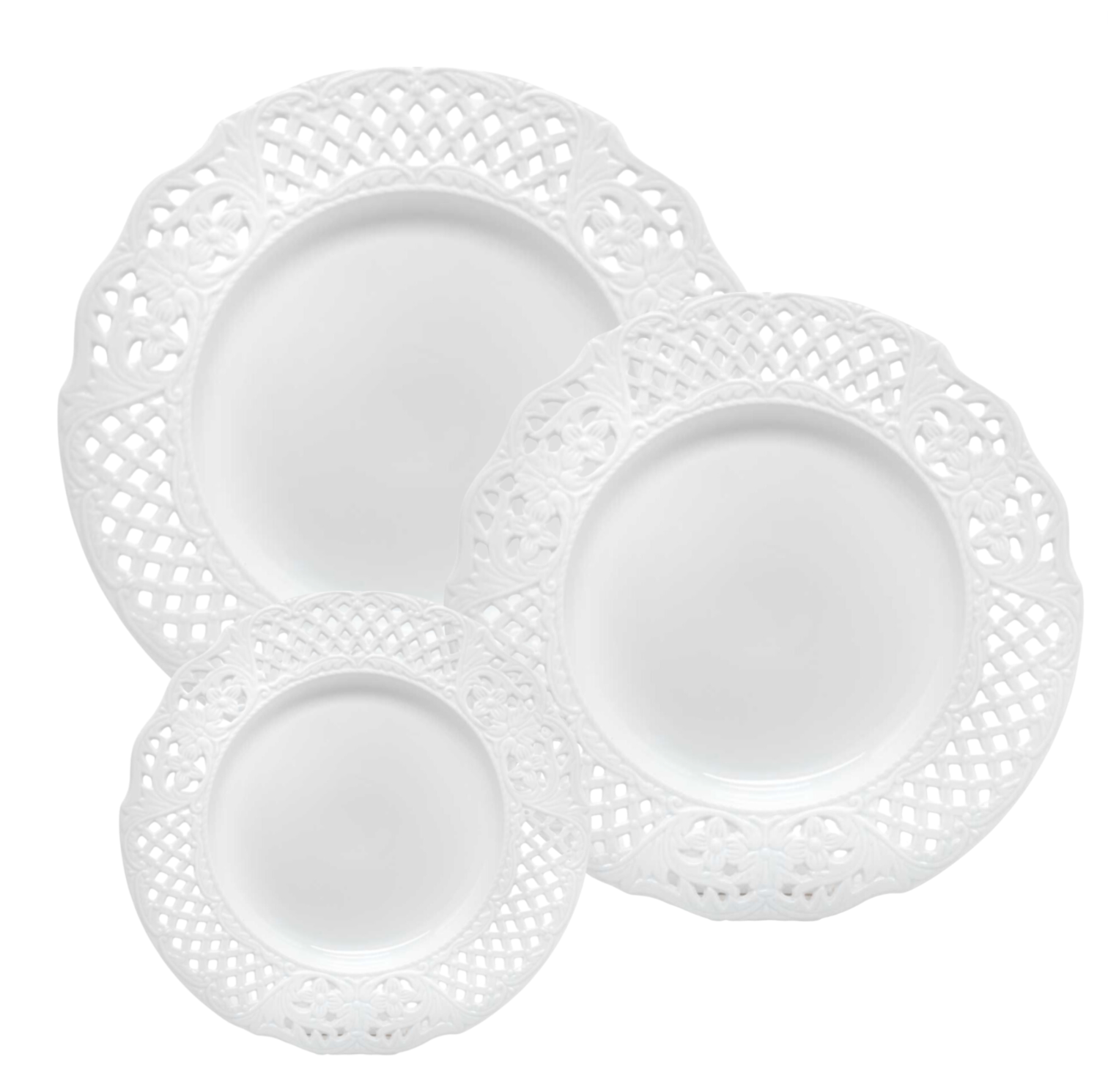 Elevate your dining experience with our White Pierced Floral Dinnerware collection. This exquisite set includes a dinner plate, salad plate, and charger, each adorned with intricate raised dot and floral motifs. Crafted to perfection in pure white, these pieces exude elegance and charm, capturing the essence of timeless sophistication. Whether used individually or as a complete set, they effortlessly enhance any table setting with their delicate detailing and versatile appeal.