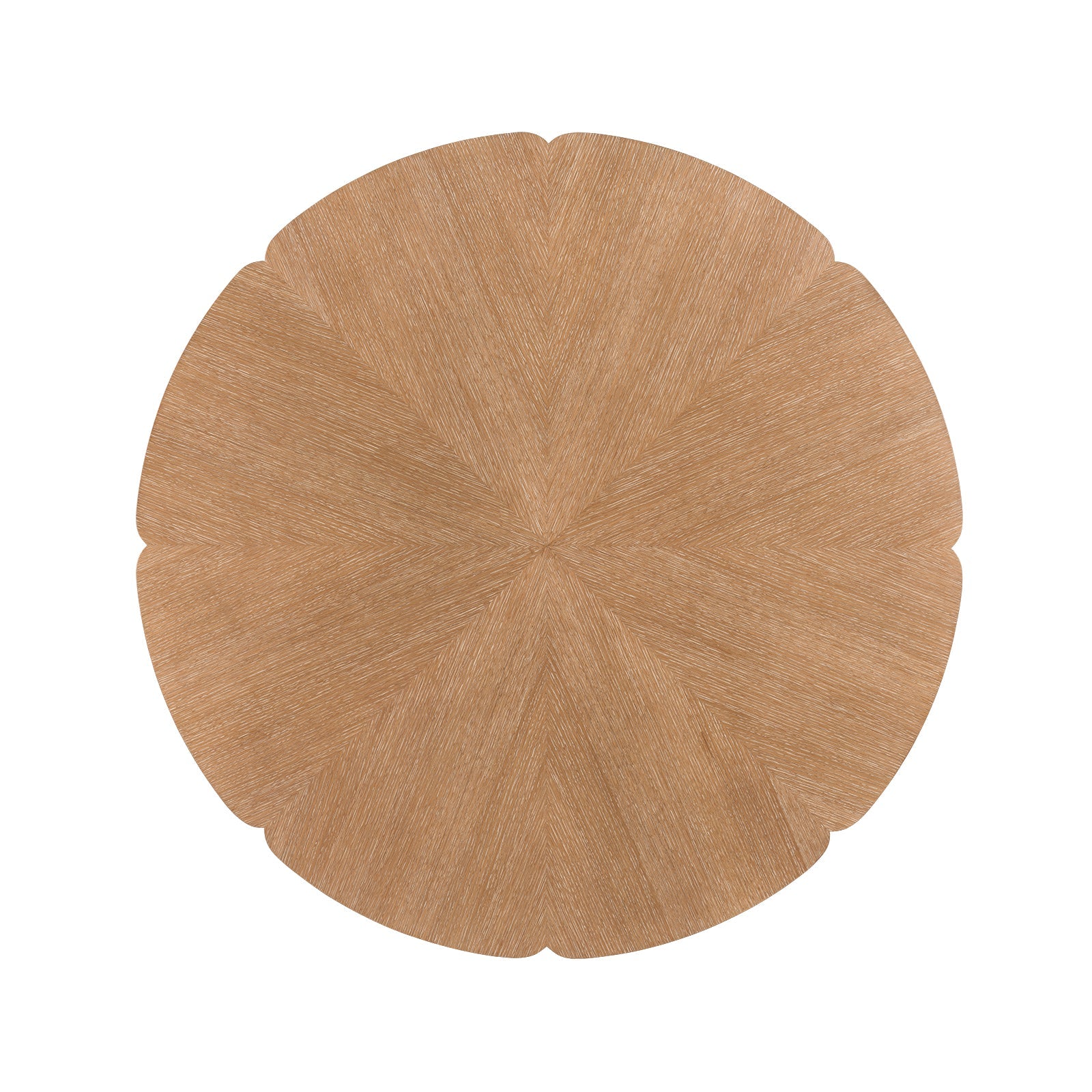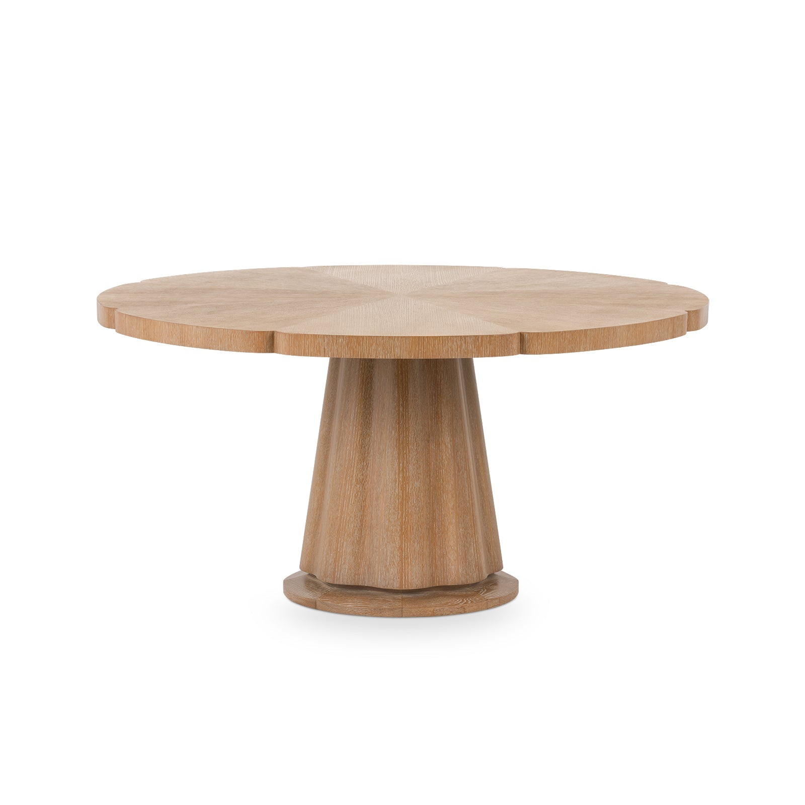 The York Dining Table blends sculptural beauty with organic elegance. Crafted from cerused oak, its round tabletop features subtle regular indentations around its edge that evoke a floating lily pad—a subtle detail that elevates its charm. A scalloped conical pedestal base adds another playful detail, bringing both movement and grace to the design. The York is a standout piece that feels refined and sophisticated yet very approachable, perfect for those who appreciate natural textures and unique silhouettes in their dining spaces.