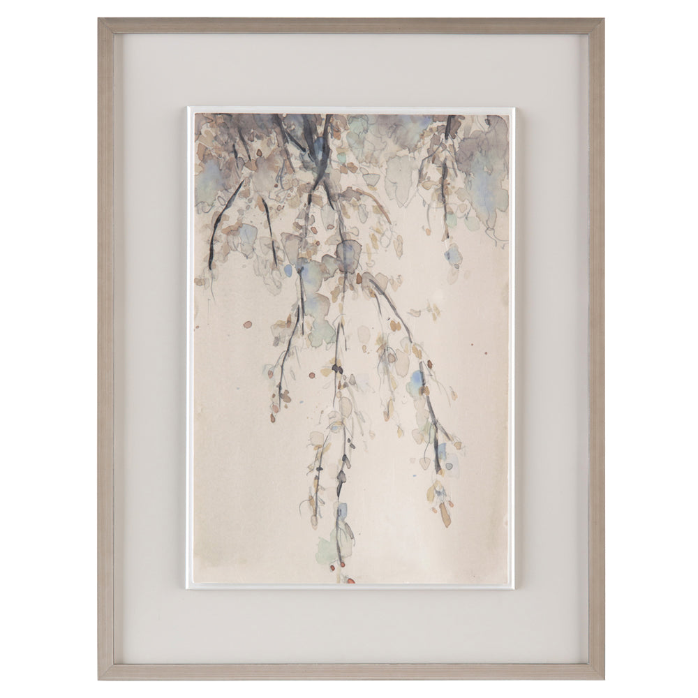 Casual Shade is a design in shades of grey and soft light greens on a neutral background. The art is mounted on a hand-painted mat in light grey that repeats the background of the print. The frame is a narrow wood molding in a silver finish.