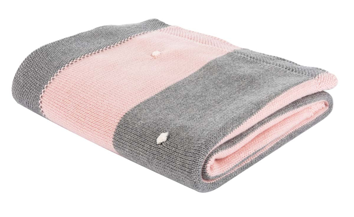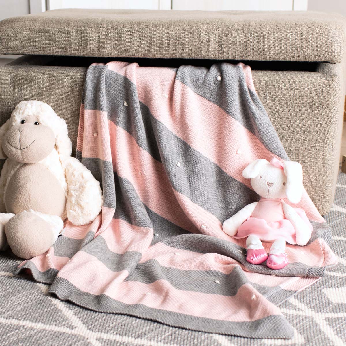 The Bubble Baby Blanket is a high fashion addition to the nursery, playroom, or stroller. A classic combination of soft pink and grey color Bubble's Ivy League striped pattern and delightful puff stitches, and cotton soft knit fibers keep your little one warm and cozy.