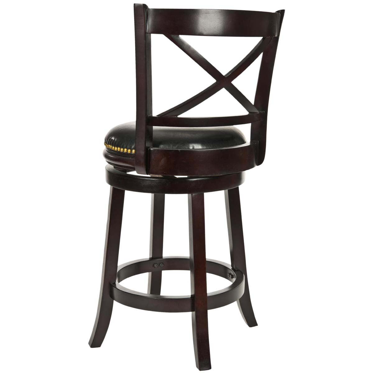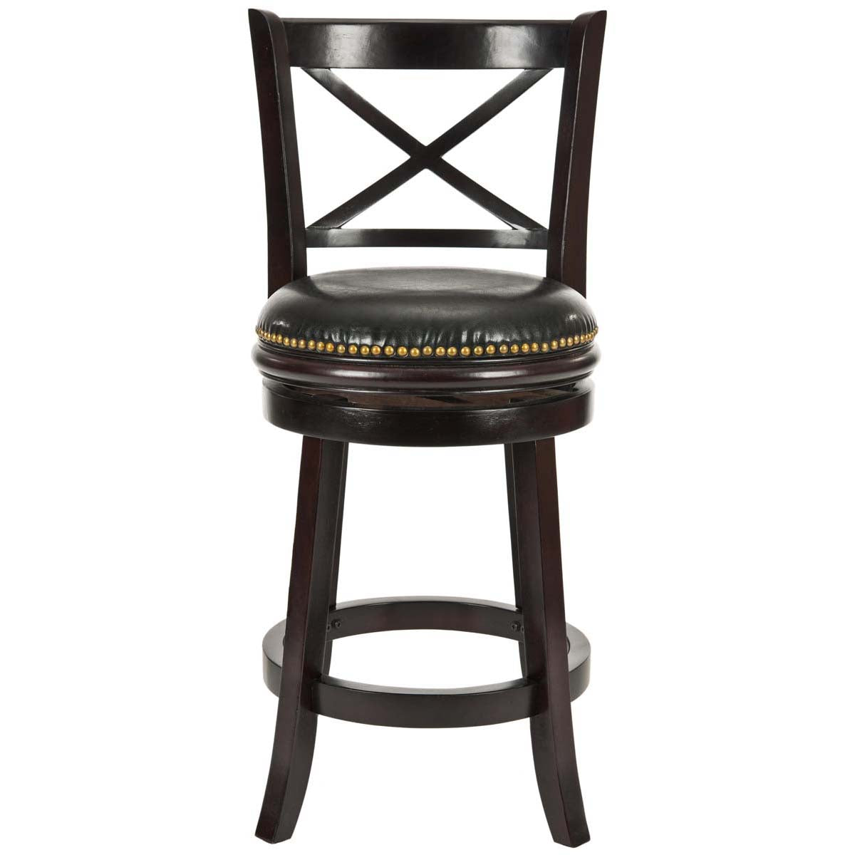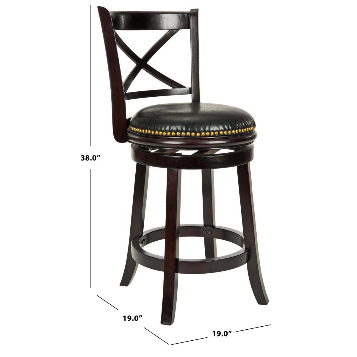 The Butler Counter Stool gives traditional styling an update with a crisscross back and gently curved legs of Malaysian Oak with a rich cappuccino finish. The well padded swivel seat?? cushion is covered in black bi cast leather and accented with nail head detailing. With a 24 inch seat height, Butler will be perfect for your counter or pub table. Assembly required.