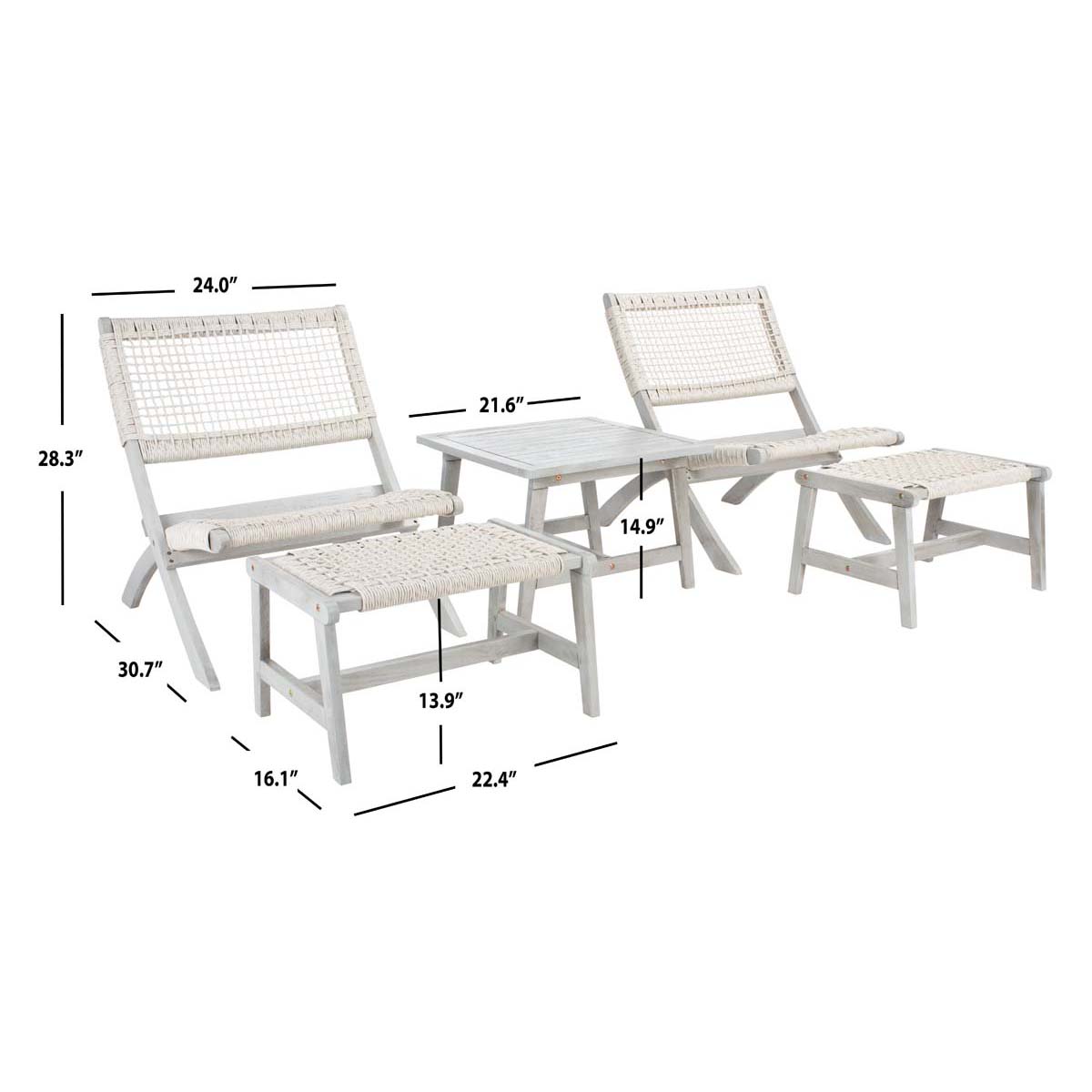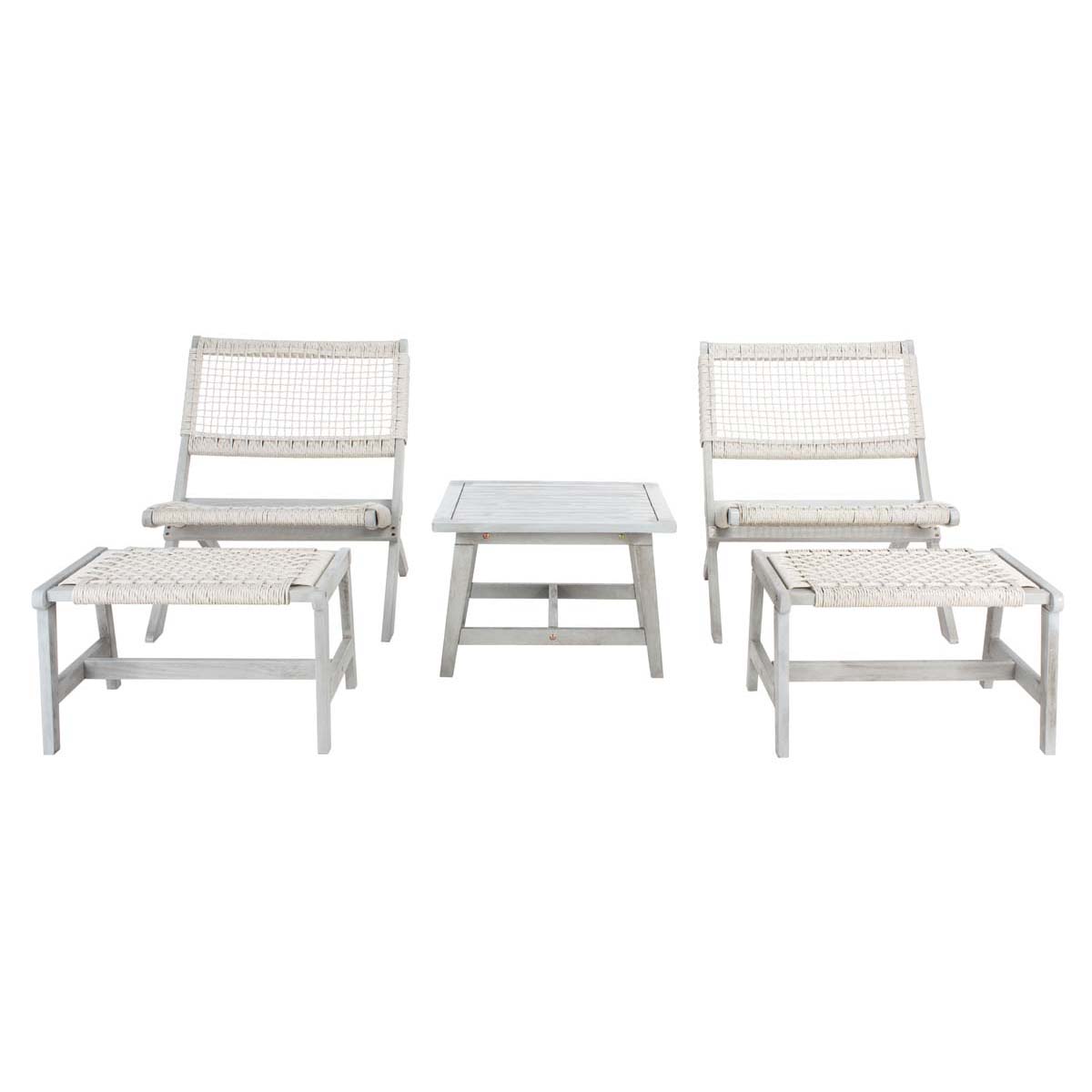This Casella Set allows you to stretch out and enjoy the summer breeze with ease and style. Two grey acacia wood chairs and matching ottomans allow for lavish lounging in the sunshine, and an end table provides ample space for coffees, cocktails, or snacks.