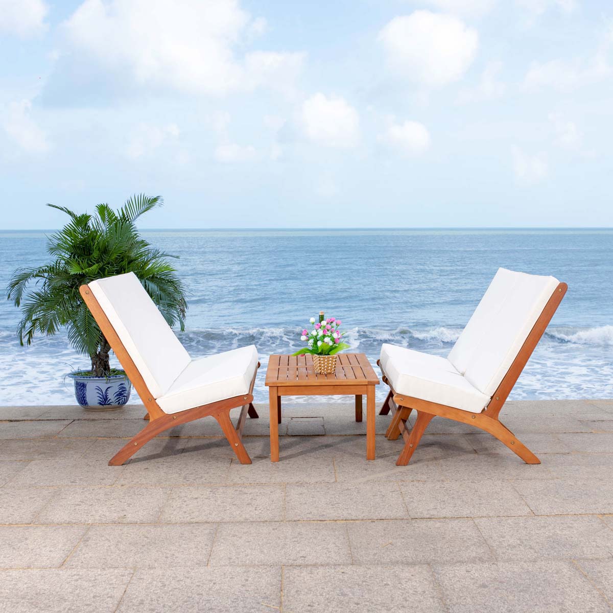 Alive with surf and sand, Sao Paulo's legendary beaches inspired this 4 piece outdoor living set. Crafted of rich natural wood, its clean lines and plush beige upholstery is ideal for afternoon lounging by the pool. Its square pillows with thin navy stripes are complementary.
