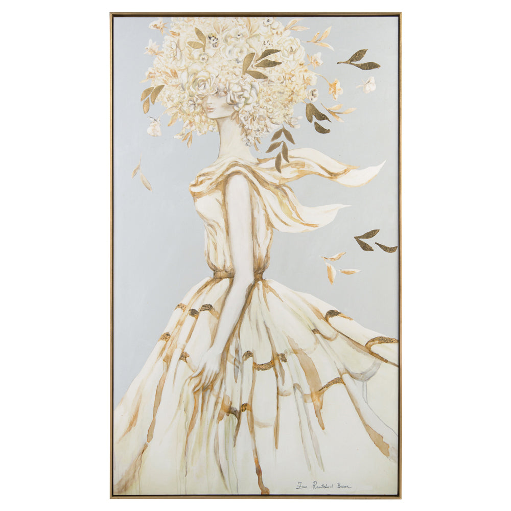 This stunning figural representation in ivory and gold tones by Zana Brown is an incredible work of art. The piece features hand-applied gold leaf, a textural finish to the image, and an aged metallic molding.