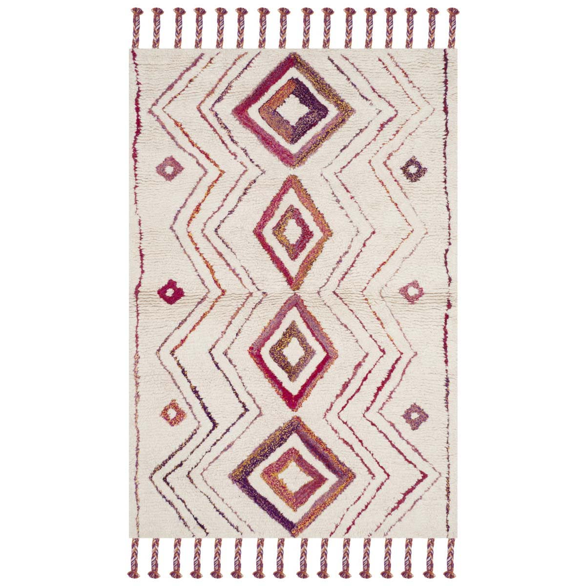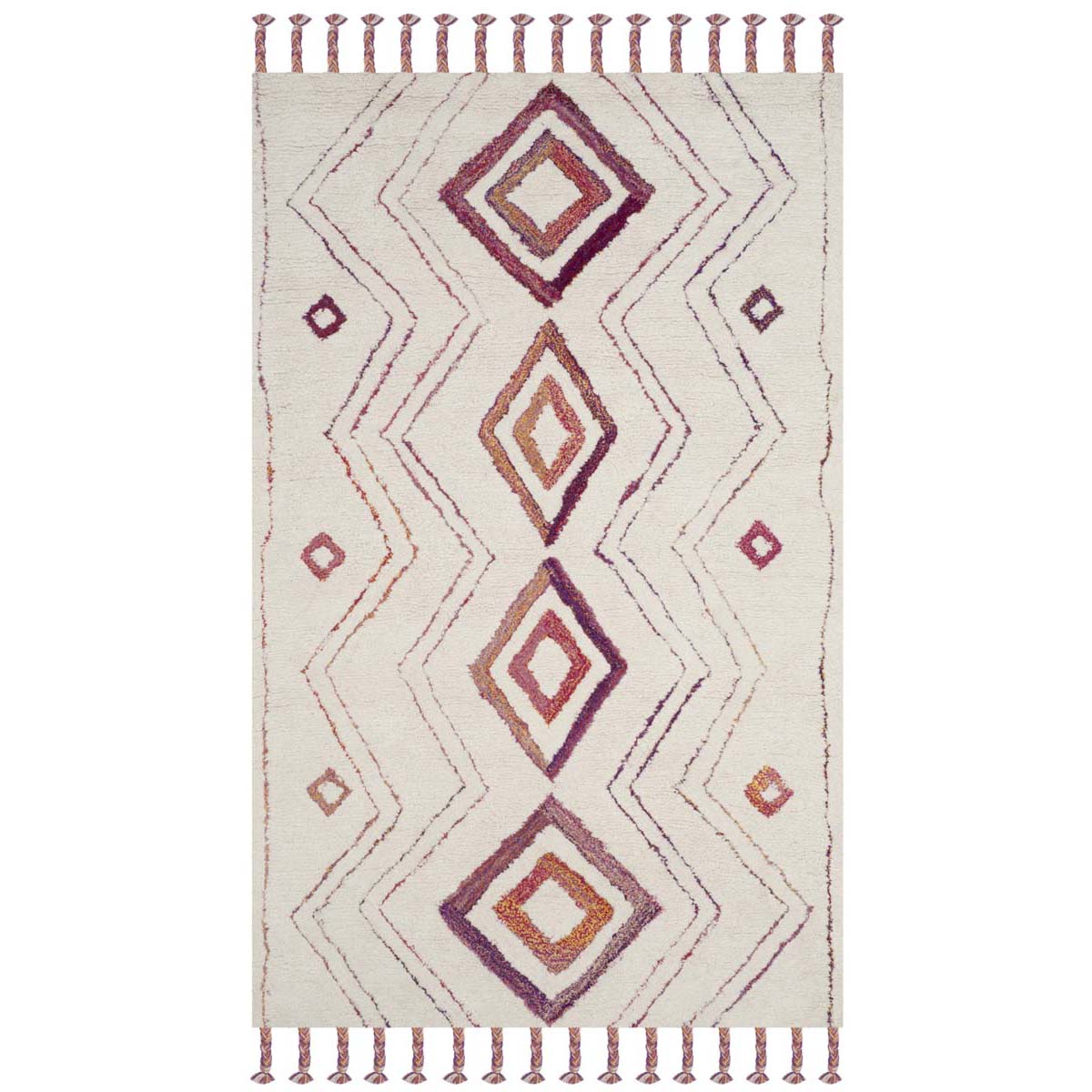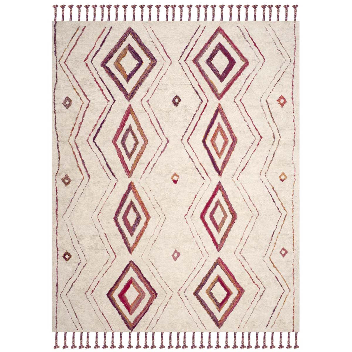 The Ivory base of the rug sets the stage for a captivating Multi-hued geometric pattern that dances across the surface, adding a dash of elegance and vivacity to your floor. The unique design, depicted in the image, showcases a series of concentric diamonds, outlined with subtle hints of reds, purples, and golds, bringing warmth and sophistication to any room.