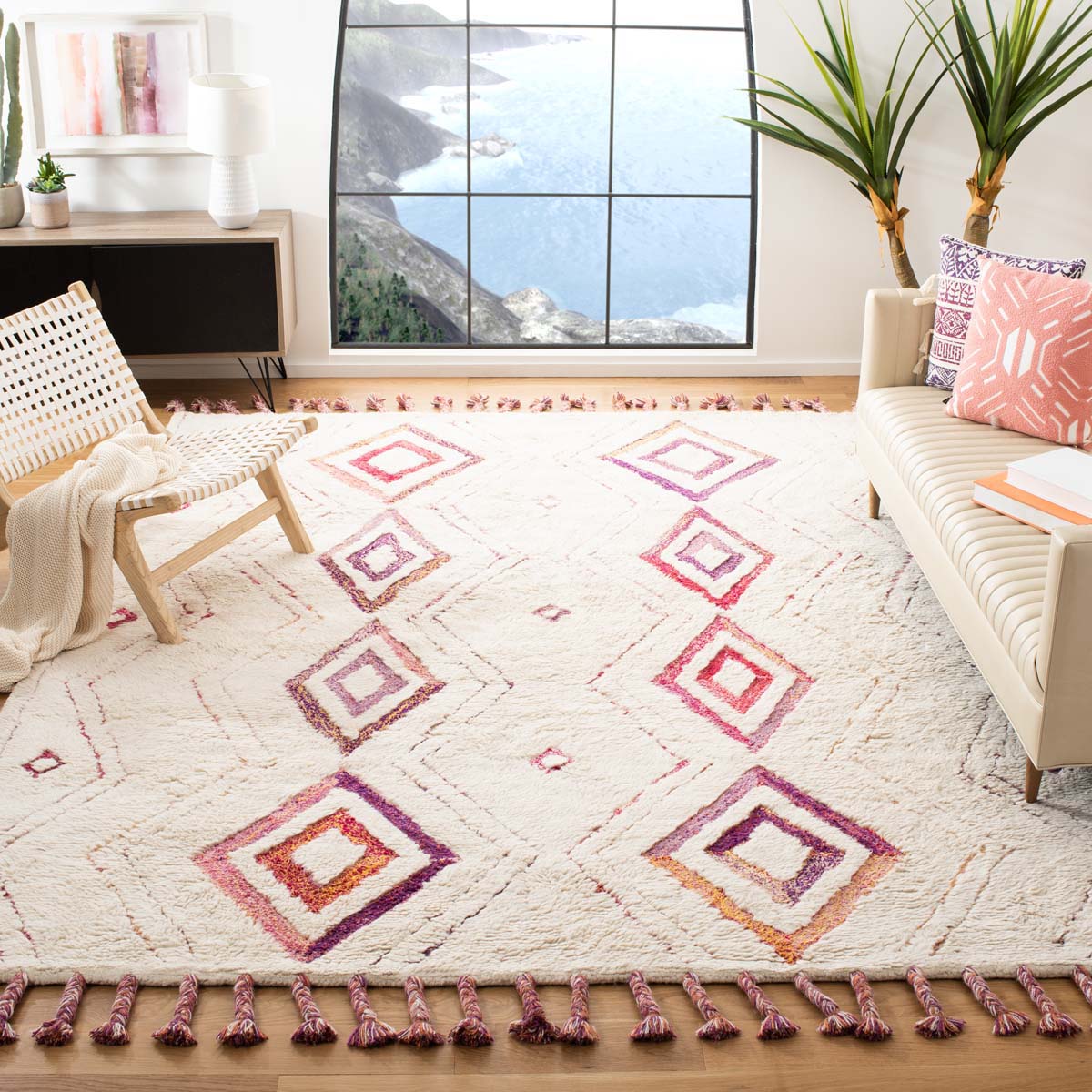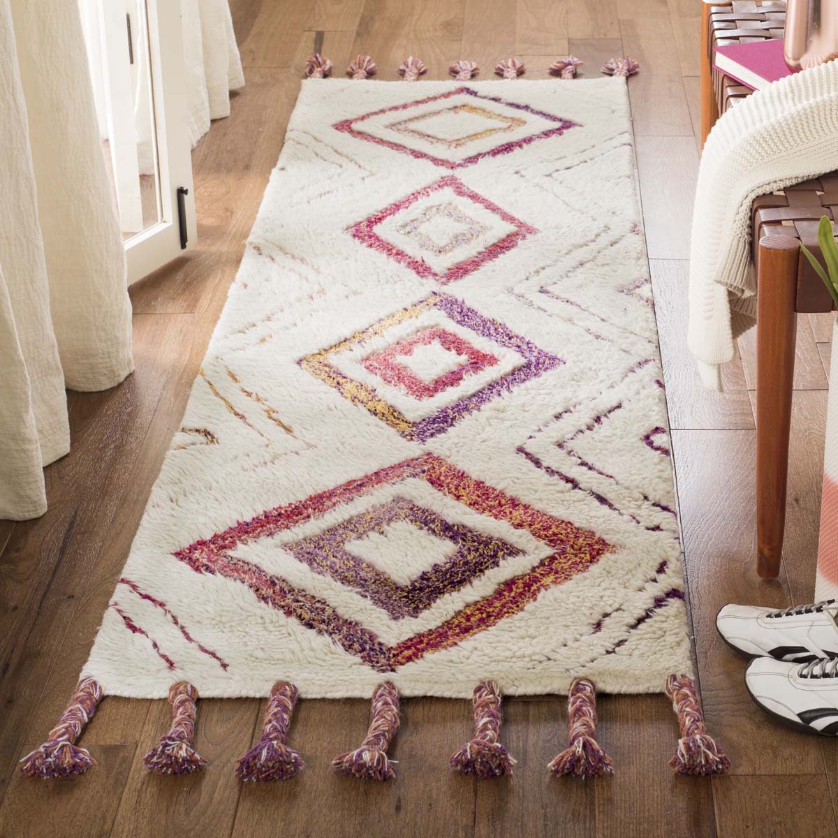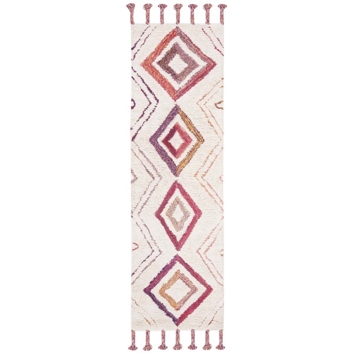 The Ivory base of the rug sets the stage for a captivating Multi-hued geometric pattern that dances across the surface, adding a dash of elegance and vivacity to your floor. The unique design, depicted in the image, showcases a series of concentric diamonds, outlined with subtle hints of reds, purples, and golds, bringing warmth and sophistication to any room.