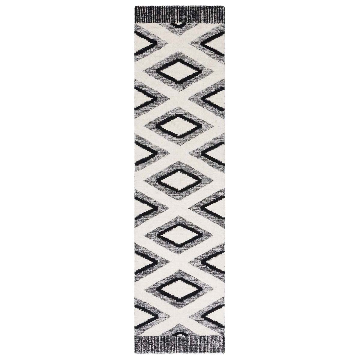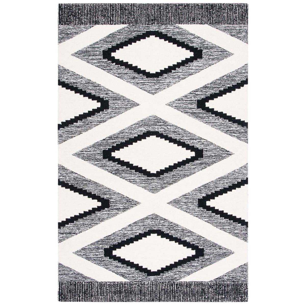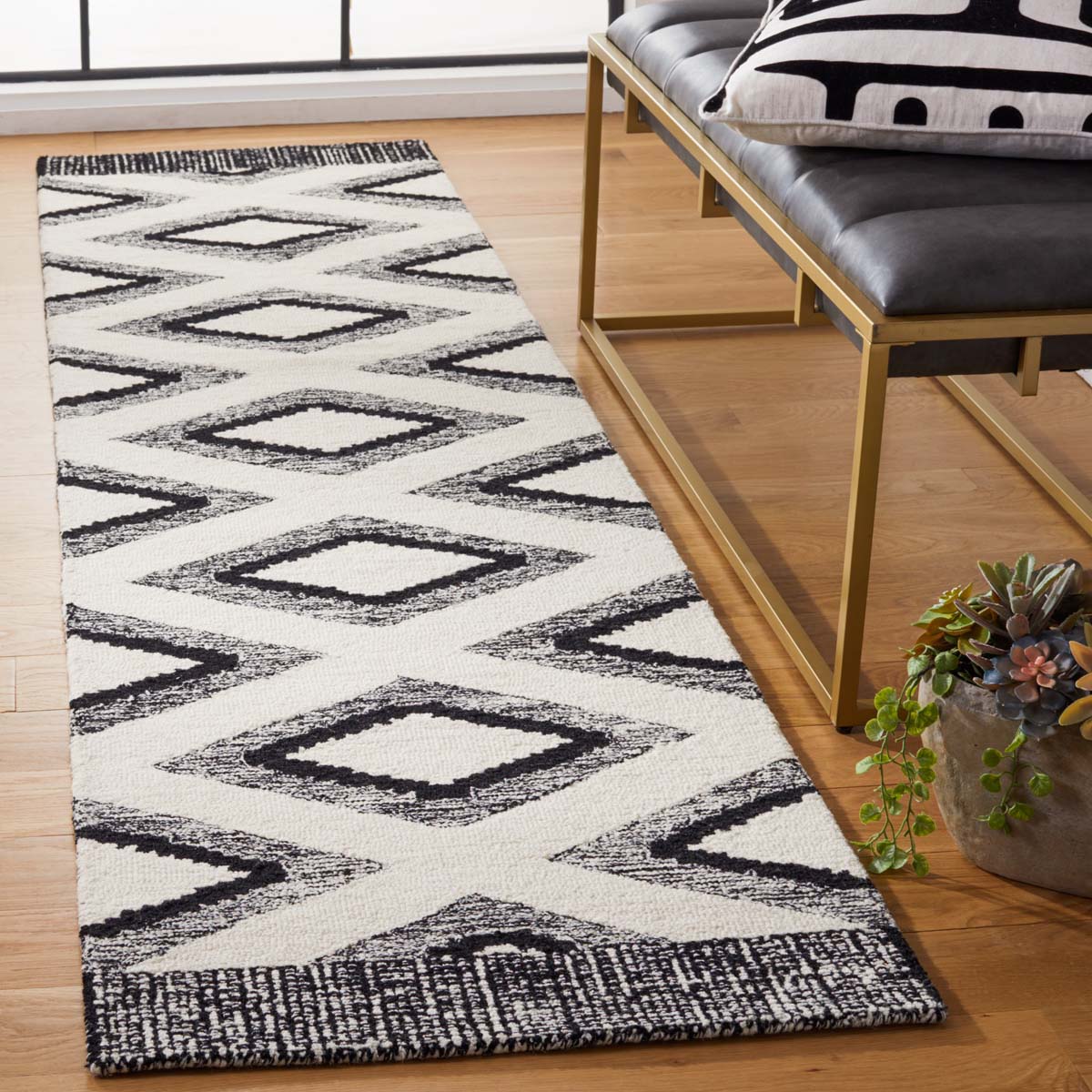 The rug's timeless pattern features bold geometric shapes that create a stunning contrast against the creamy ivory backdrop, delivering an impactful visual statement that seamlessly complements a variety of decorating styles. Each black line and shape within the design is meticulously tufted by hand, showcasing the exceptional skill of Indian artisans and their dedication to creating high-quality woolen textiles.