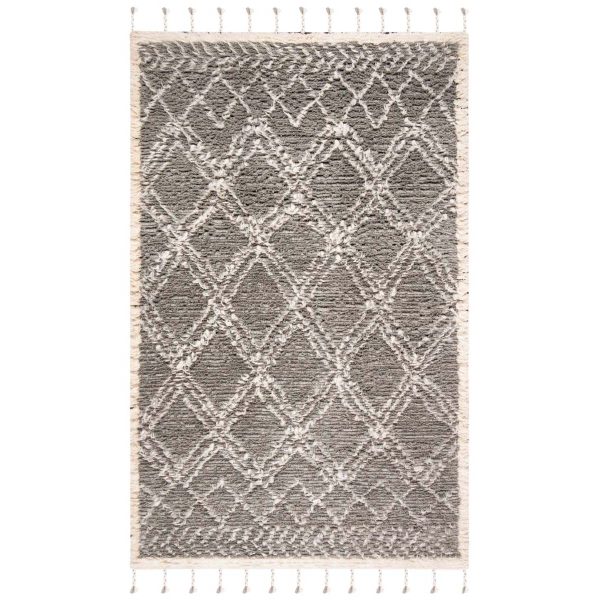 The rug's construction boasts an exceptional blend of 85% wool and 15% cotton, ensuring both durability and softness. Handcrafted with meticulous attention to detail, the artisanship reflects the rich textile heritage of India. The grey and ivory color palette is both modern and neutral, offering flexibility to complement a variety of decors.