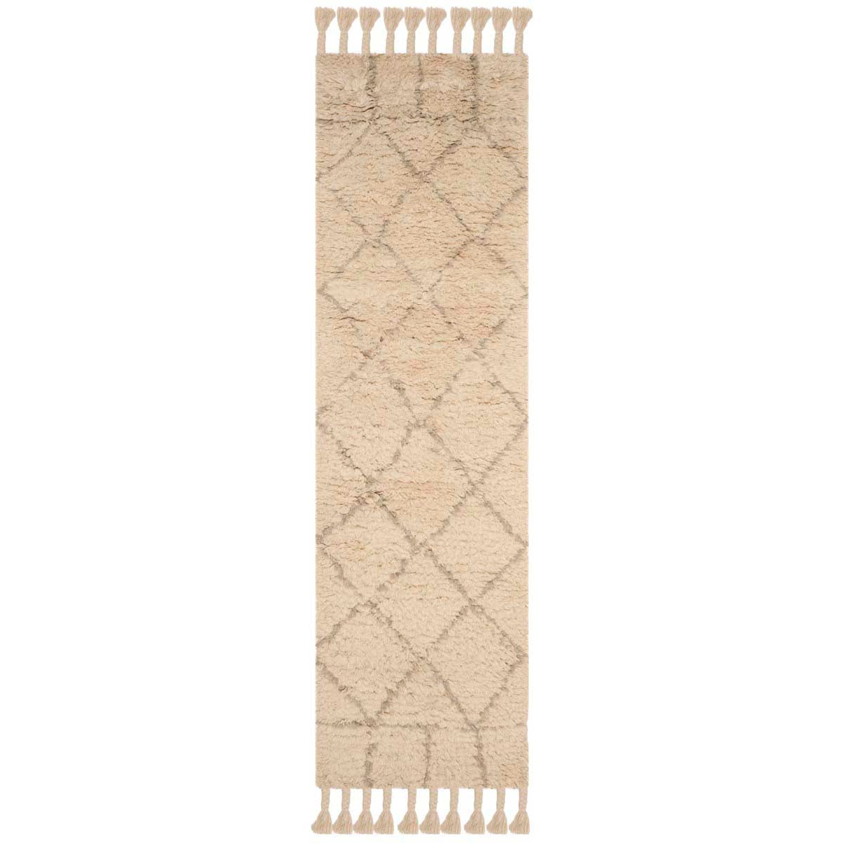 Adorned with a subtle yet chic ivory and light grey color palette, the design showcases a harmonious geometric diamond pattern that resonates with contemporary decor while paying homage to traditional design principles. The rug's inherent charm is amplified by the playful tassels that line its edges, adding a touch of whimsy to its sophisticated profile.