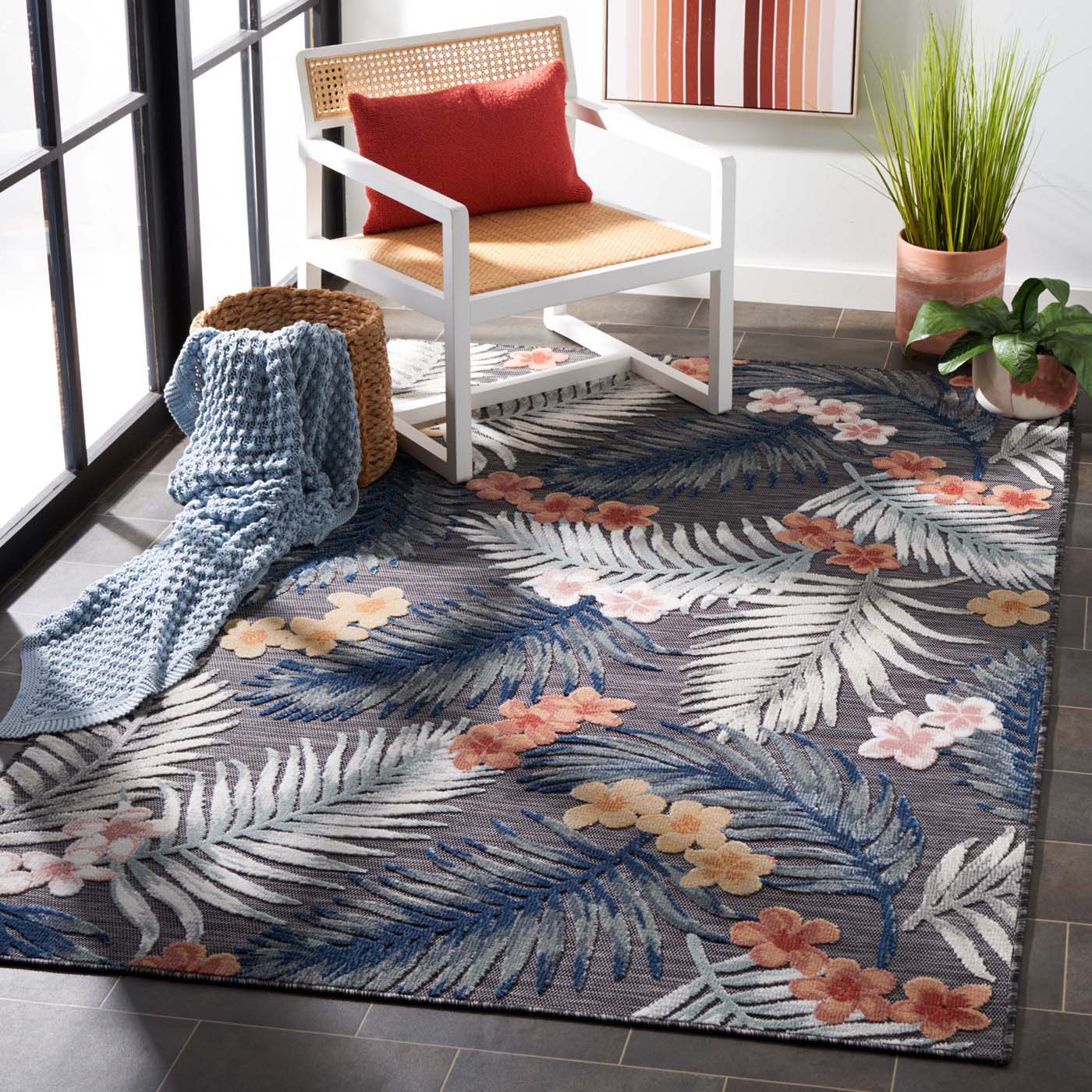 Cabana Indoor/Outdoor Rugs offer a selection of elaborate floor coverings for any busy area of the home, inside or out. Playful florals, lush vines, and fanciful geometric motifs brim with staycation vibes on any deck, porch, or patio. Cabana patio rugs are made using durable synthetic yarns for resistance to weather, wear, mold, mildew, and fading from the sun.,Cabana Indoor/Outdoor Rugs offer a selection of elaborate floor coverings for any busy area of the home, inside or out. Playful florals, lush vines, and fanciful geometric motifs brim with staycation vibes on any deck, porch, or patio. Cabana patio rugs are made using durable synthetic yarns for resistance to weather, wear, mold, mildew, and fading from the sun.