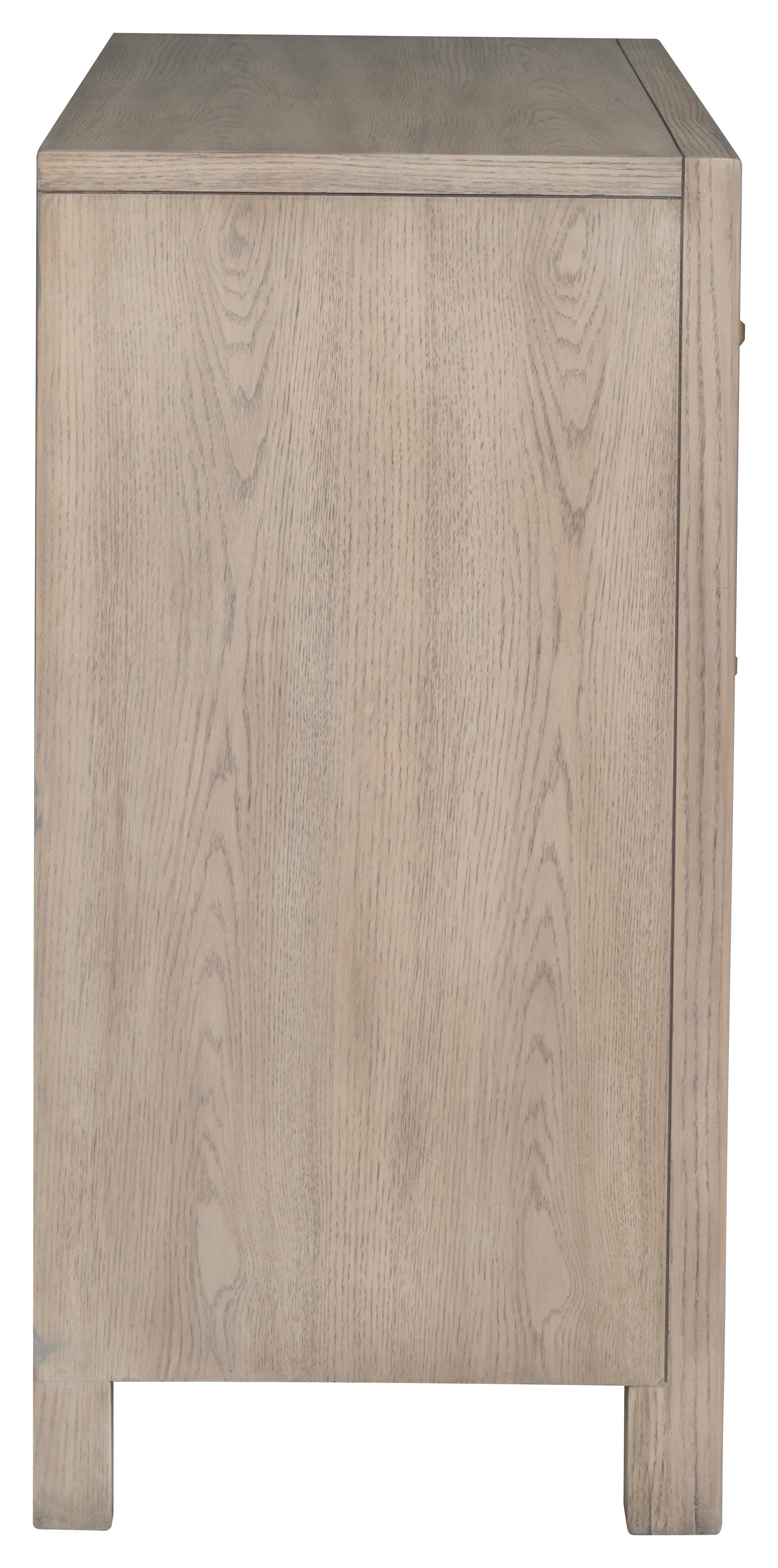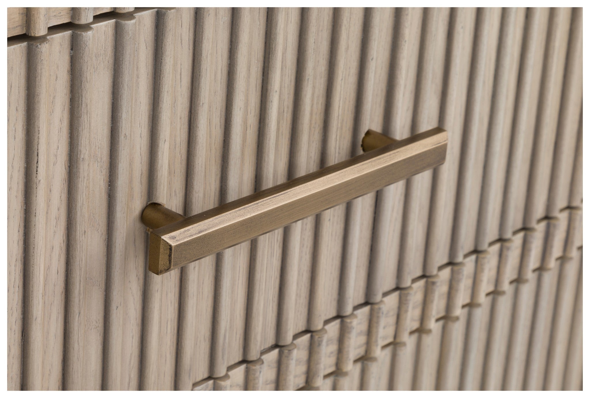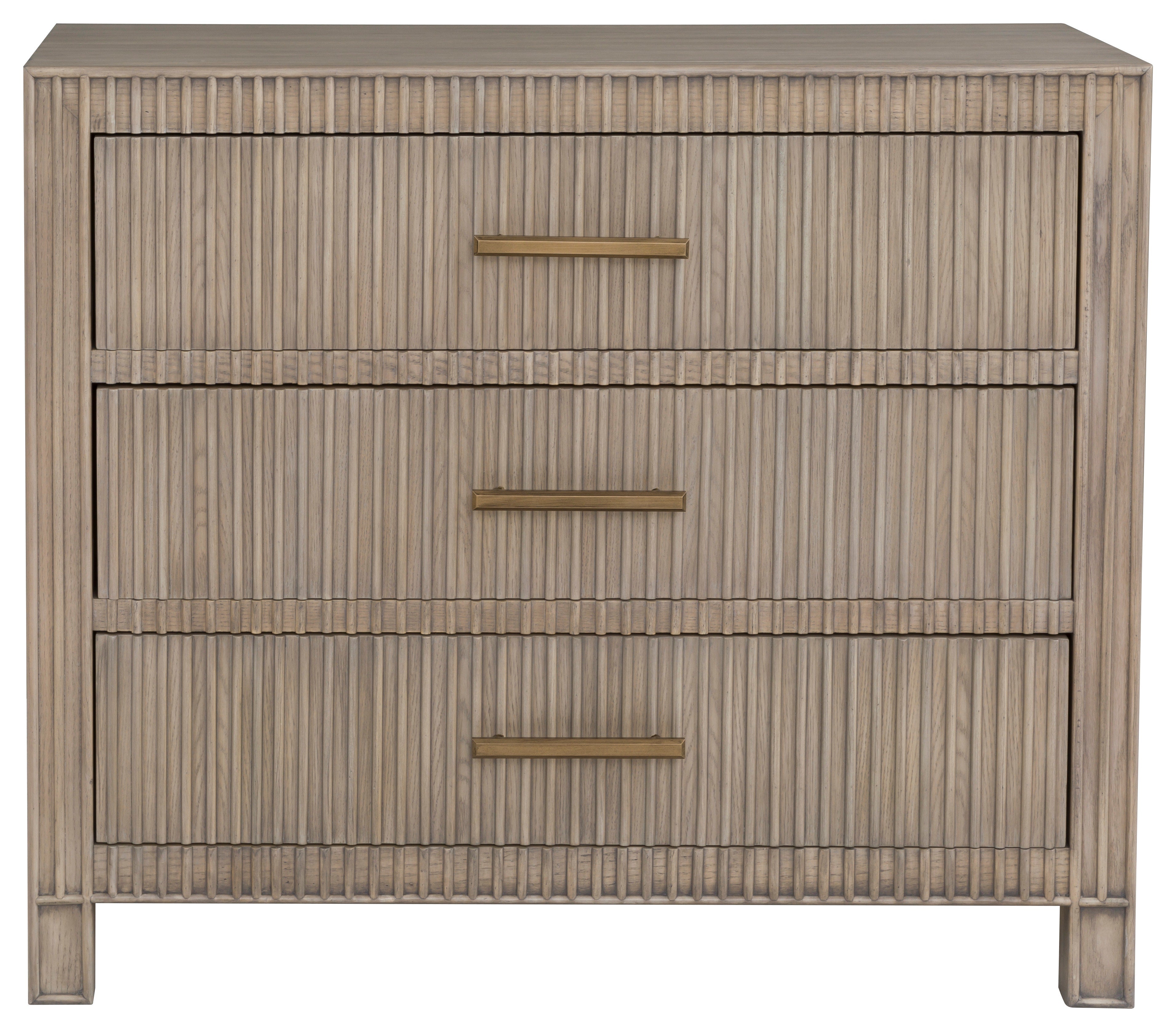Features three drawers in Biscotti Finish with Brushed Brass hardware.