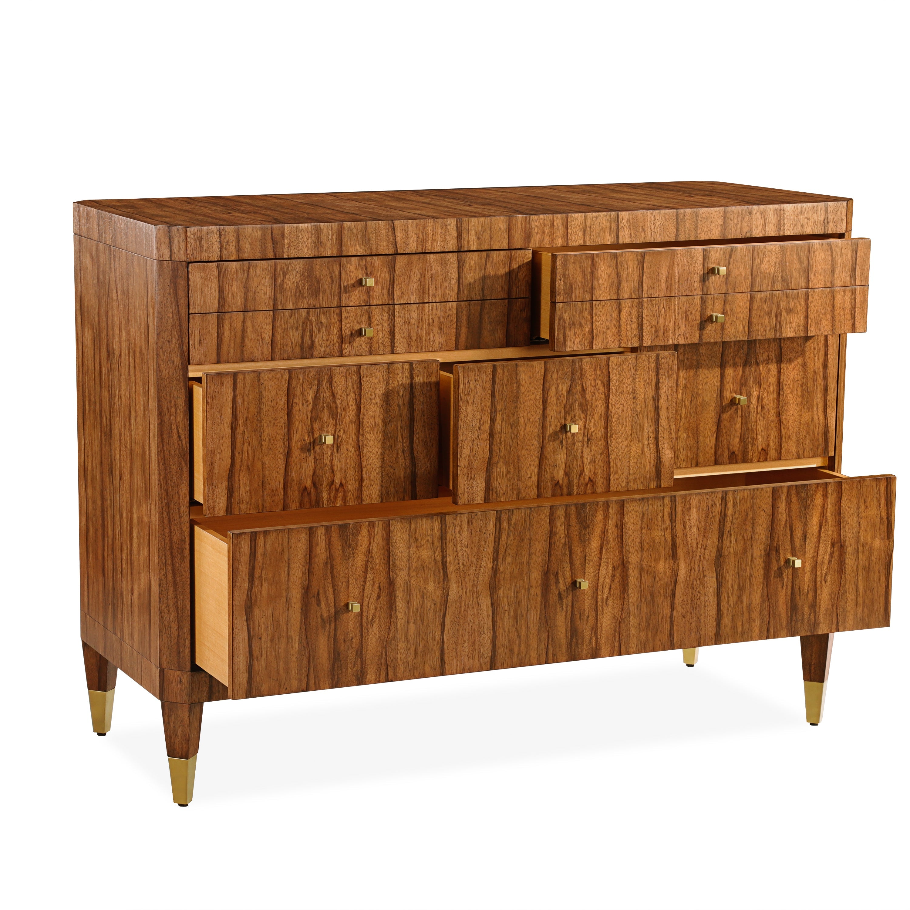 The Pomar Dresser is a dignified statement piece that enhances a space through serene natural tones. The dresser showcases gorgeous ofram wood grain patterns in a Moura finish, taking on a delicate light brown tone. Each of the nine compartments features stainless steel handles in Brushed Brass, matched by the feet to tastefully contrast the wood with warm metallic tones. This dresser is equipped with soft close drawer runners.
