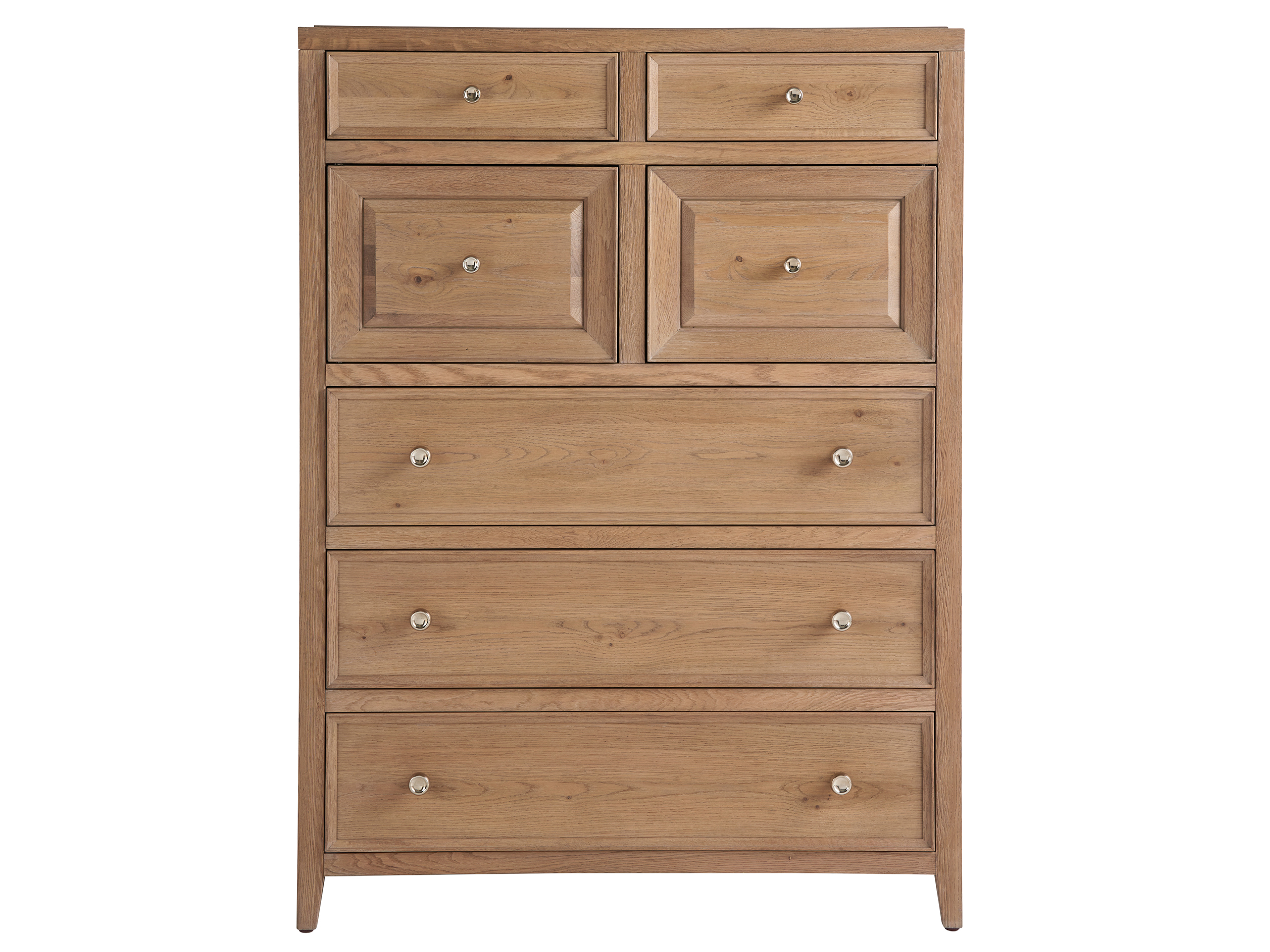 The Weekender Dressing Chest strikes an ideal balance between classic and modern, featuring a tall silhouette with drawers of varying sizes and a versatile knotty oak finish.