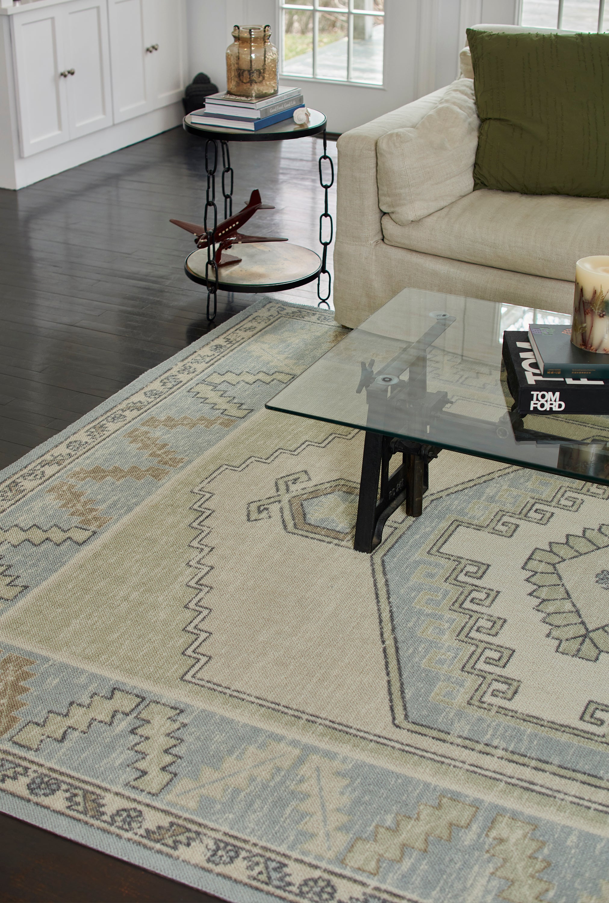 SOFT TRIBAL LOOK: The pastel color palette of Anatolia presents a softer side of tribal styles. Subdued shades of pink, baby blue and brown fill the field and ornamental rug borders with classical medallions and vine and dot motifs.