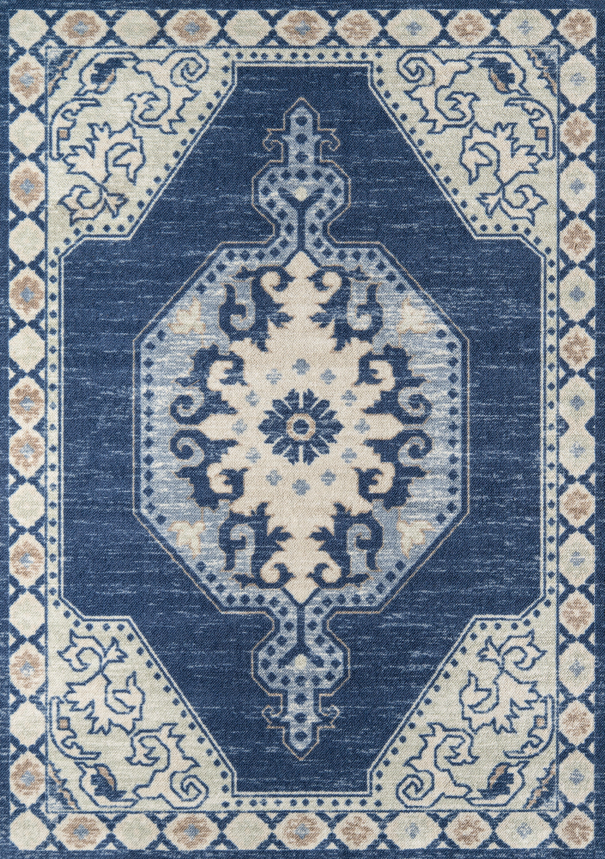 SOFT TRIBAL LOOK: The pastel color palette of Anatolia presents a softer side of tribal styles. Subdued shades of pink, baby blue and brown fill the field and ornamental rug borders with classical medallions and vine and dot motifs.