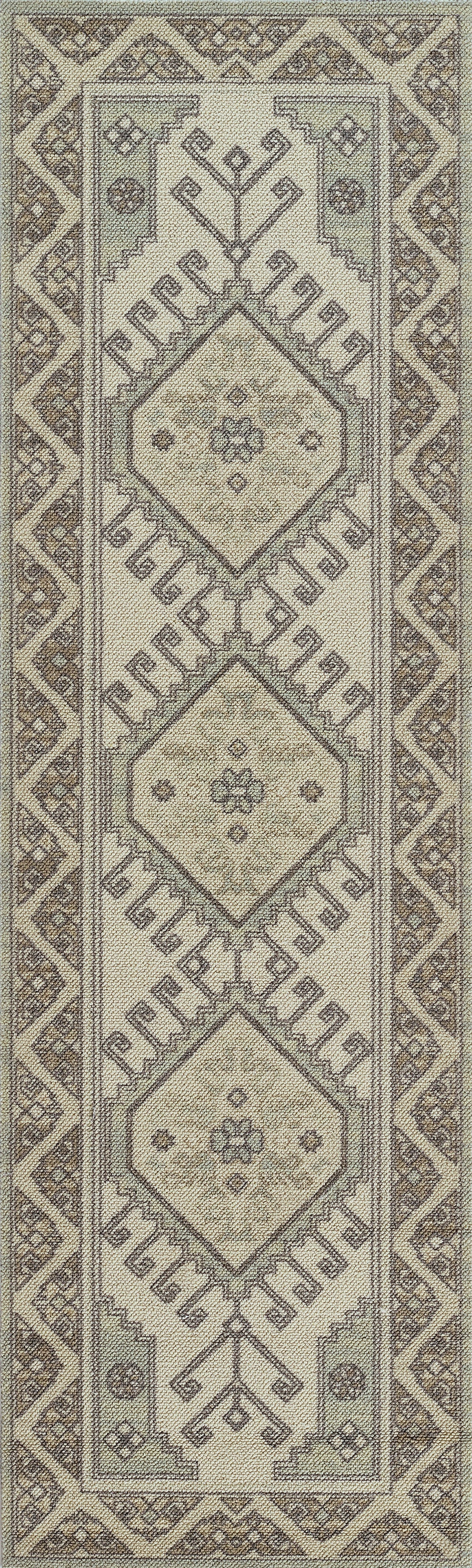 SOFT TRIBAL LOOK: The pastel color palette of Anatolia presents a softer side of tribal styles. Subdued shades of pink, baby blue and brown fill the field and ornamental rug borders with classical medallions and vine and dot motifs.