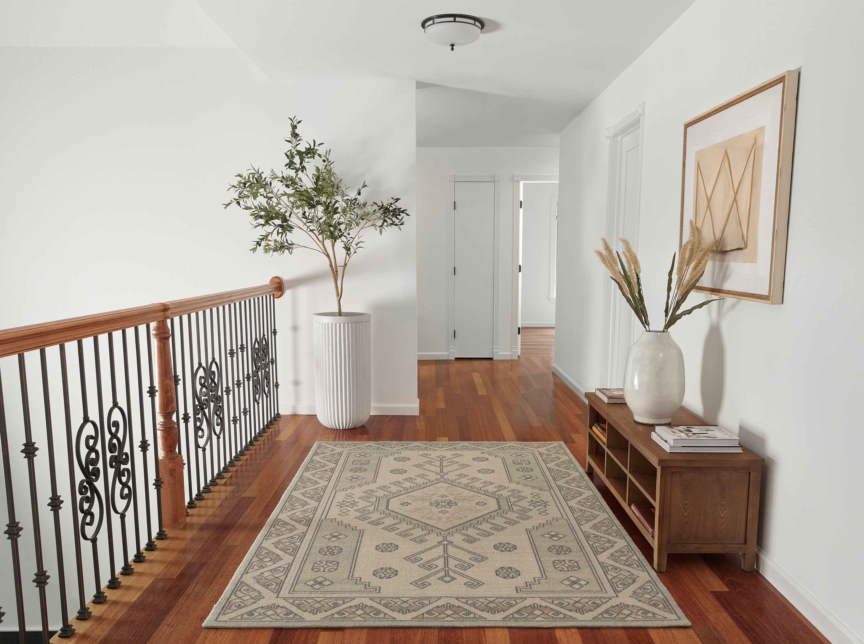 INNOVATIVE CRAFTING: Crafted in an innovative combination of natural wool and nylon threads, modern machining mimics ancestral weaving techniques to create a series of chic floor coverings that are superior in beauty and performance.