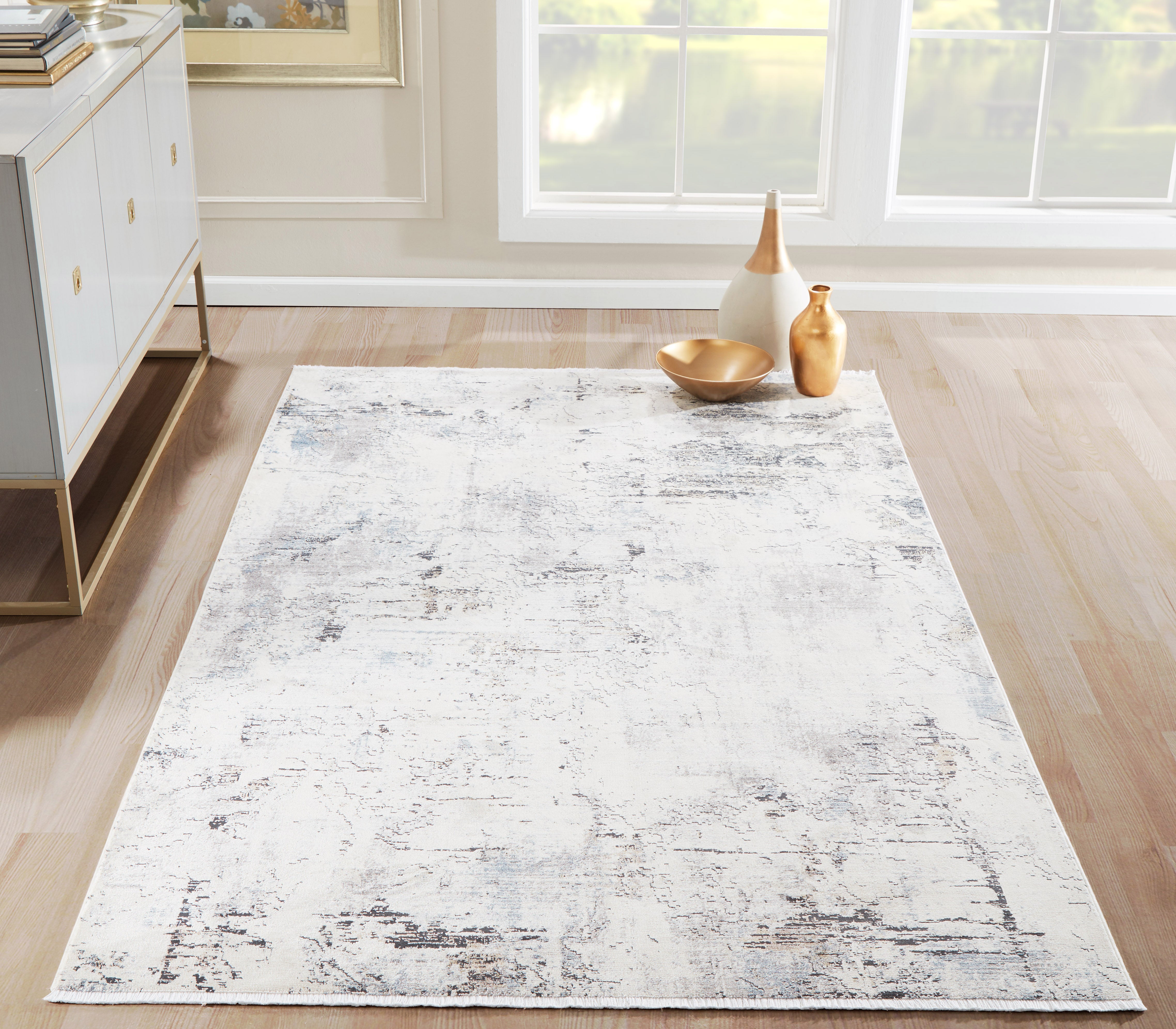 ABSTRACT DESIGN: This modern area rug collection is an exuberant expression of tone and texture. Hints of traditional carpet patterns play out beneath splashes of white and bold black striations, artfully crafted in a curated palette of grayscale shades.