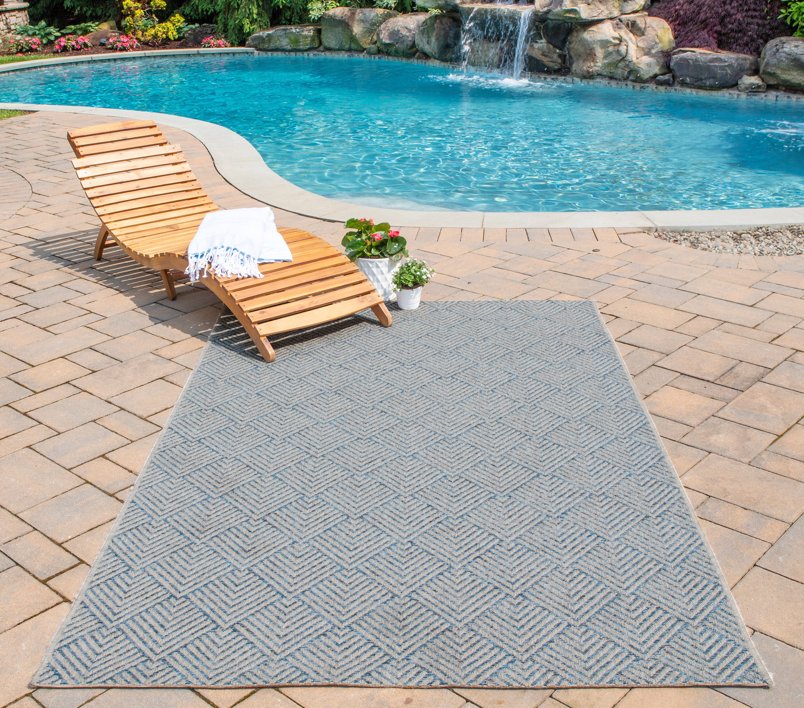 Sophistication is just a step away from the tropical style of this indoor/outdoor area rug collection. An essential design element for interior and exterior settings, each floorcovering is a fitting statement piece in natural surroundings with geometric, thatch and striated patterns that draw inspiration from island influences. All-weather polypropylene fibers soften surfaces of patios and pool decks and retain richness of color in sun or shade.