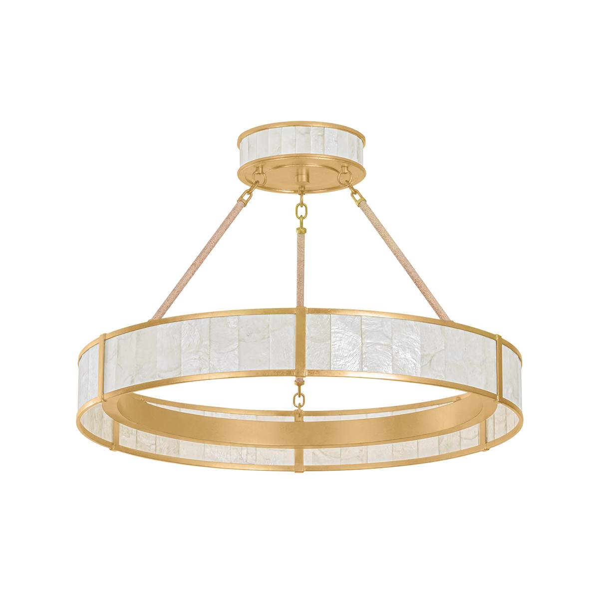 The ethereal Halcott ring chandelier is constructed of luminous capiz panels that recall the iridescence of mother-of-pearl. As the Vintage Gold Leaf frame brings out the natural glow, the abaca rope-wrapped suspension contributes to the coastal beauty of this fixture. Available in two sizes, Halcott makes for a gleaming one-of-a-kind focal point.*Due to the one-of-a-kind nature of the medium, exact colors and patterns may vary slightly from the image shown.