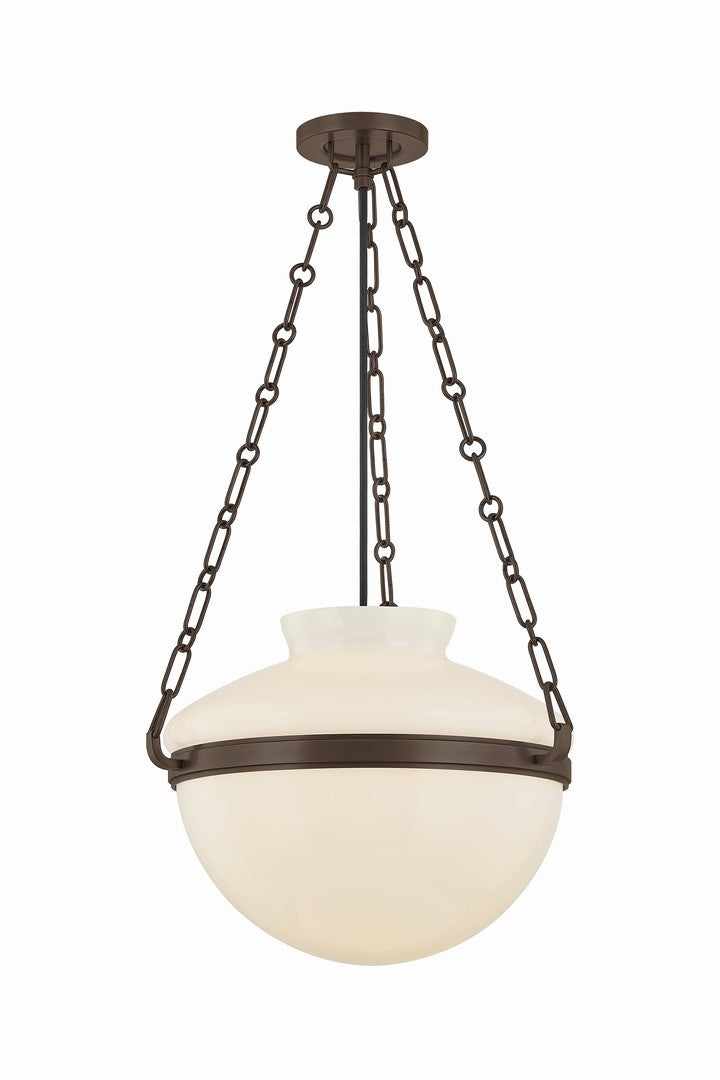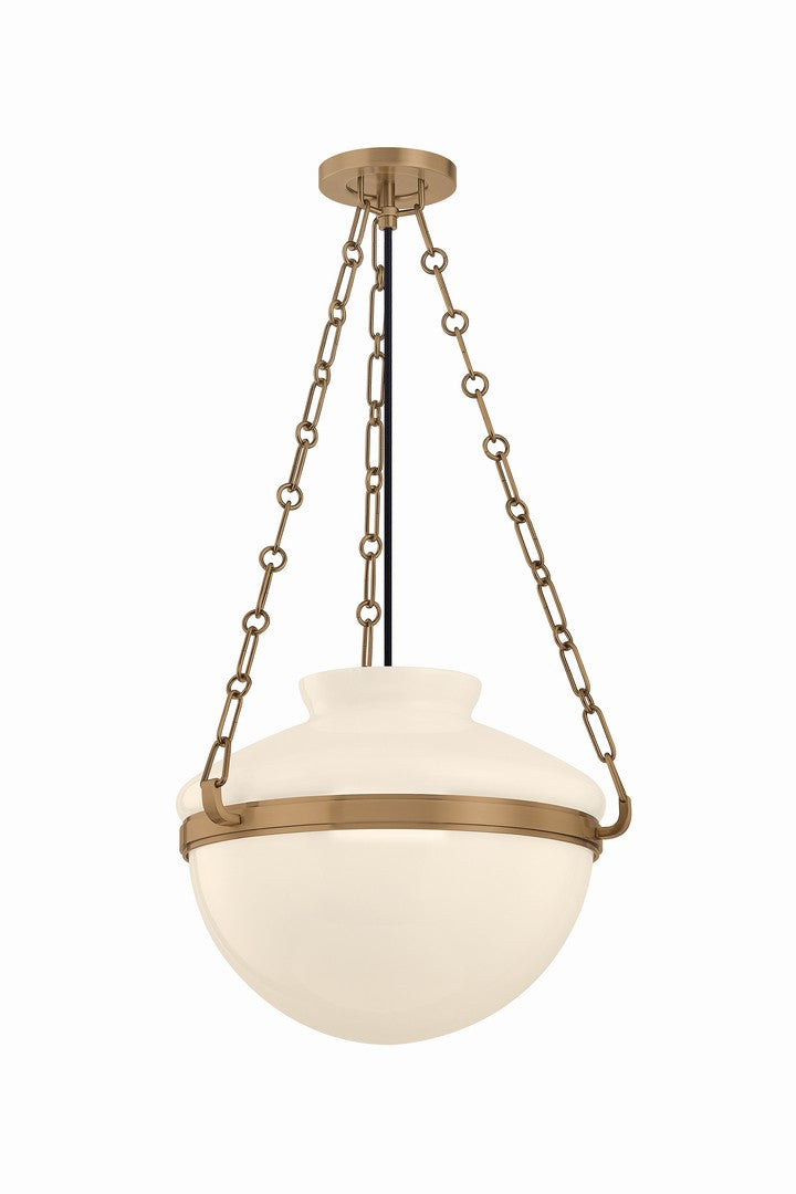 With a silhouette that nods to the past, Paradigm reimagines the classic lantern with bold, generous proportions and a contemporary sensibility. A large student-style opal shiny glass shade hangs from a trio of chunky chains, finished in either polished Patina Brass or an understated Bronze finish. Available in two sizes, Paradigm blends heritage and modernity into a sculptural overhead statement.