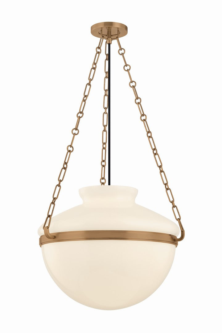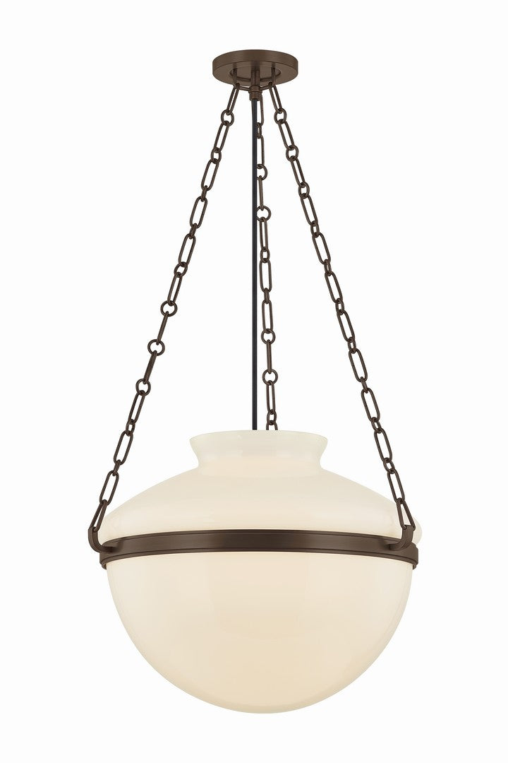 With a silhouette that nods to the past, Paradigm reimagines the classic lantern with bold, generous proportions and a contemporary sensibility. A large student-style opal shiny glass shade hangs from a trio of chunky chains, finished in either polished Patina Brass or an understated Bronze finish. Available in two sizes, Paradigm blends heritage and modernity into a sculptural overhead statement.