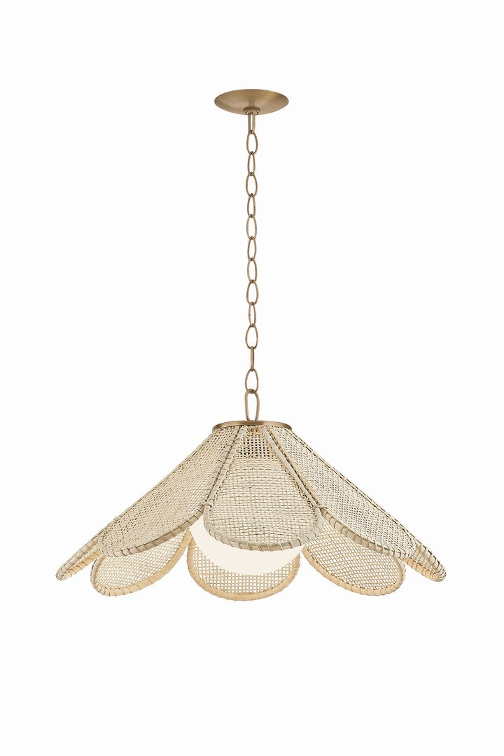 A nod to nature’s quiet beauty, Petal features handwoven rattan cane shaped into delicate “petals” that surround a shiny opal glass globe. The organic silhouette—both rustic and refined—is suspended by a bold loop and chain in Patina Brass (PBR). Available in two sizes, it’s a charming addition above a kitchen island or breakfast nook.*Due to the one-of-a-kind nature of the medium, exact colors and patterns may vary slightly from the image shown.