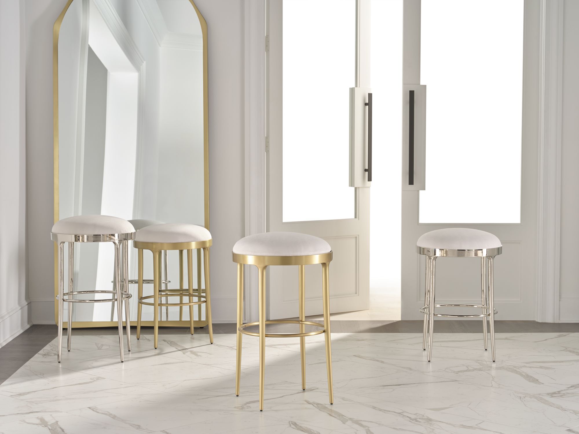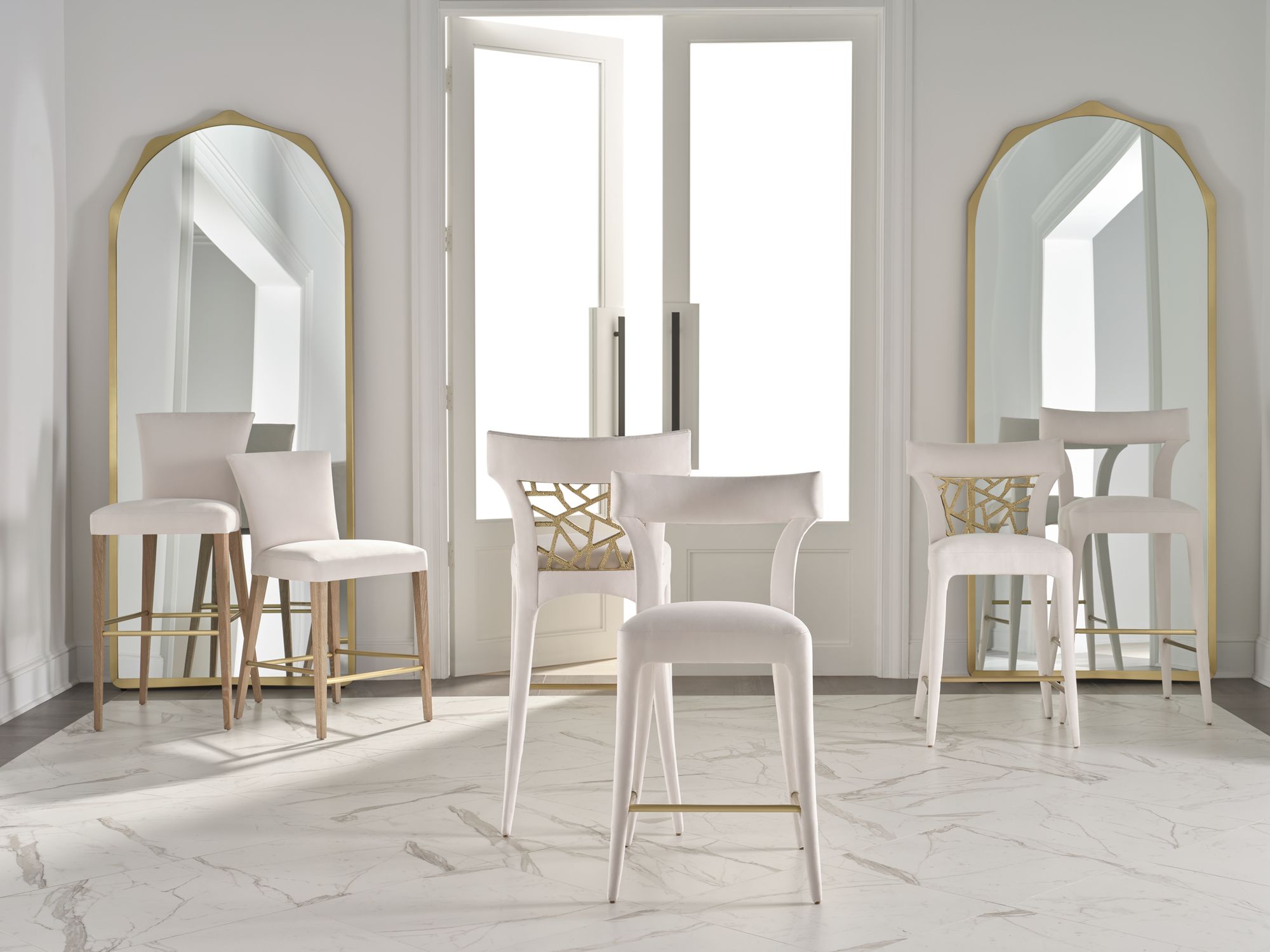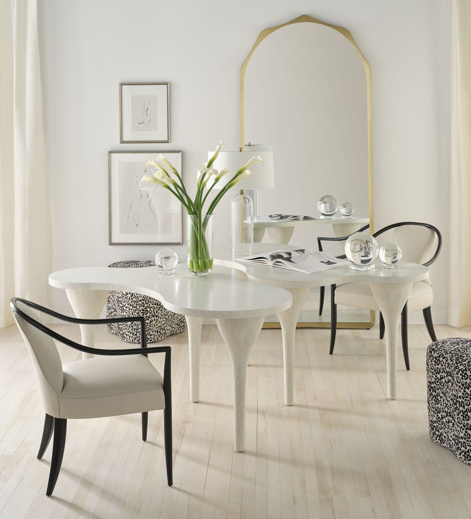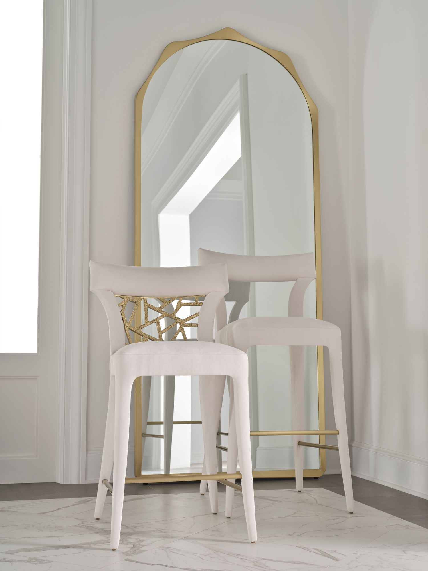 The Crew Mirror is a towering piece with a bronze frame that stands nearly eight feet tall. Its shaping was inspired by by modernist bangle cuffs.