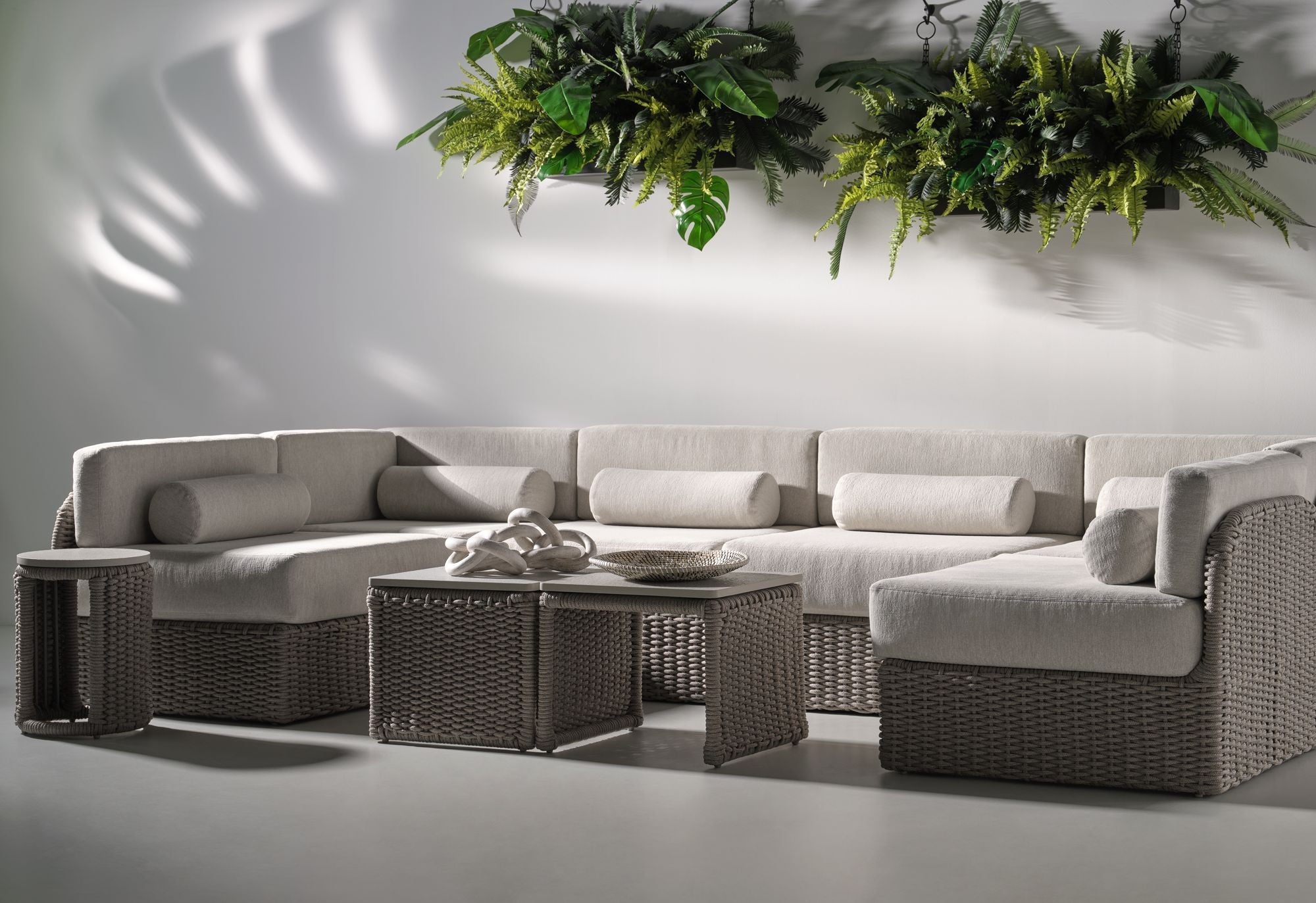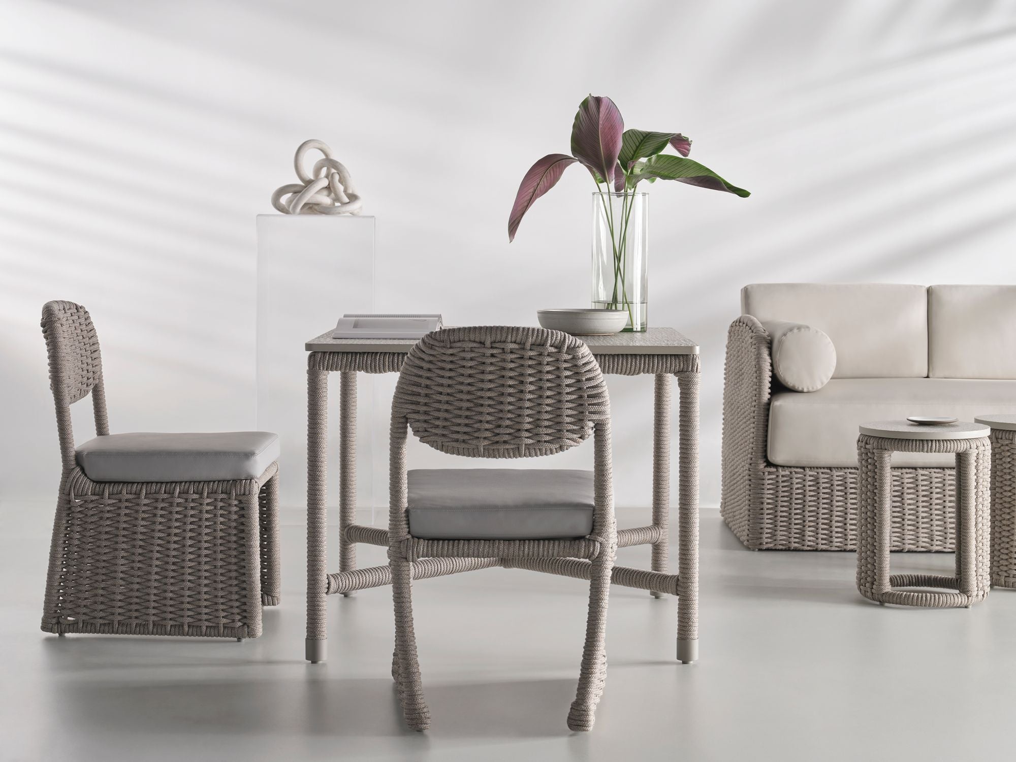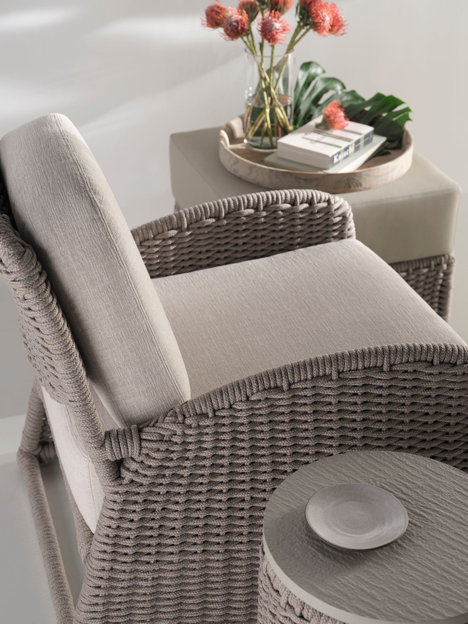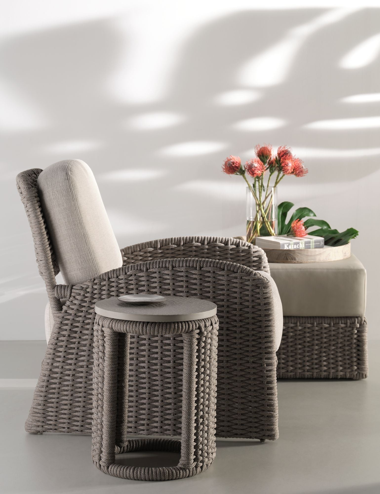 Woven acrylic cording flows around the curved surface of the Cuerda Spot Table to create a dramatic, highly detailed piece. Featuring soft neutral tones, the table can accompany nearly any outdoor piece including the collection’s Cuerda Slipper Chair or Cuerda Lounge Chair.