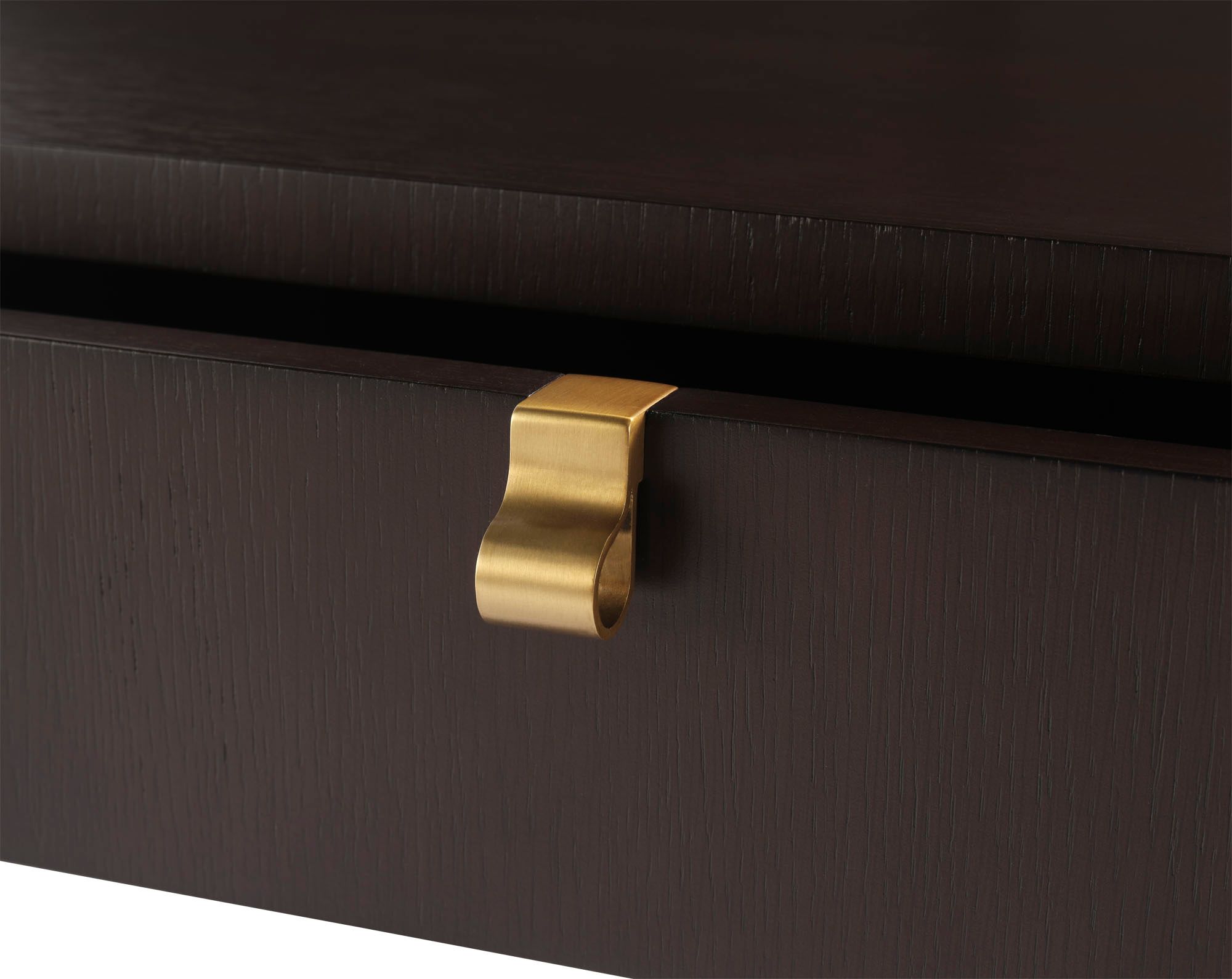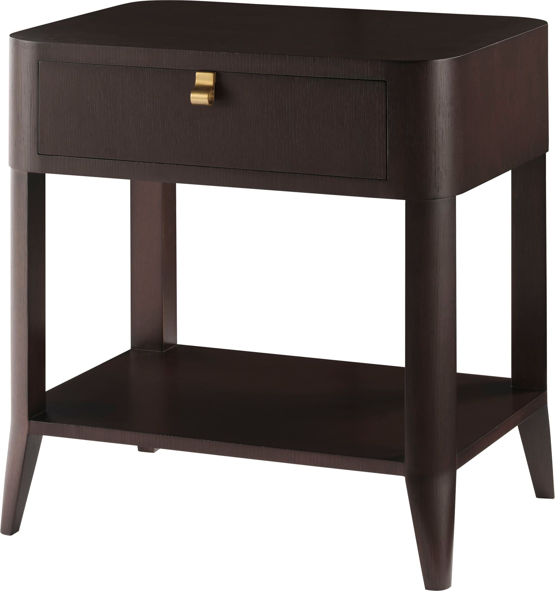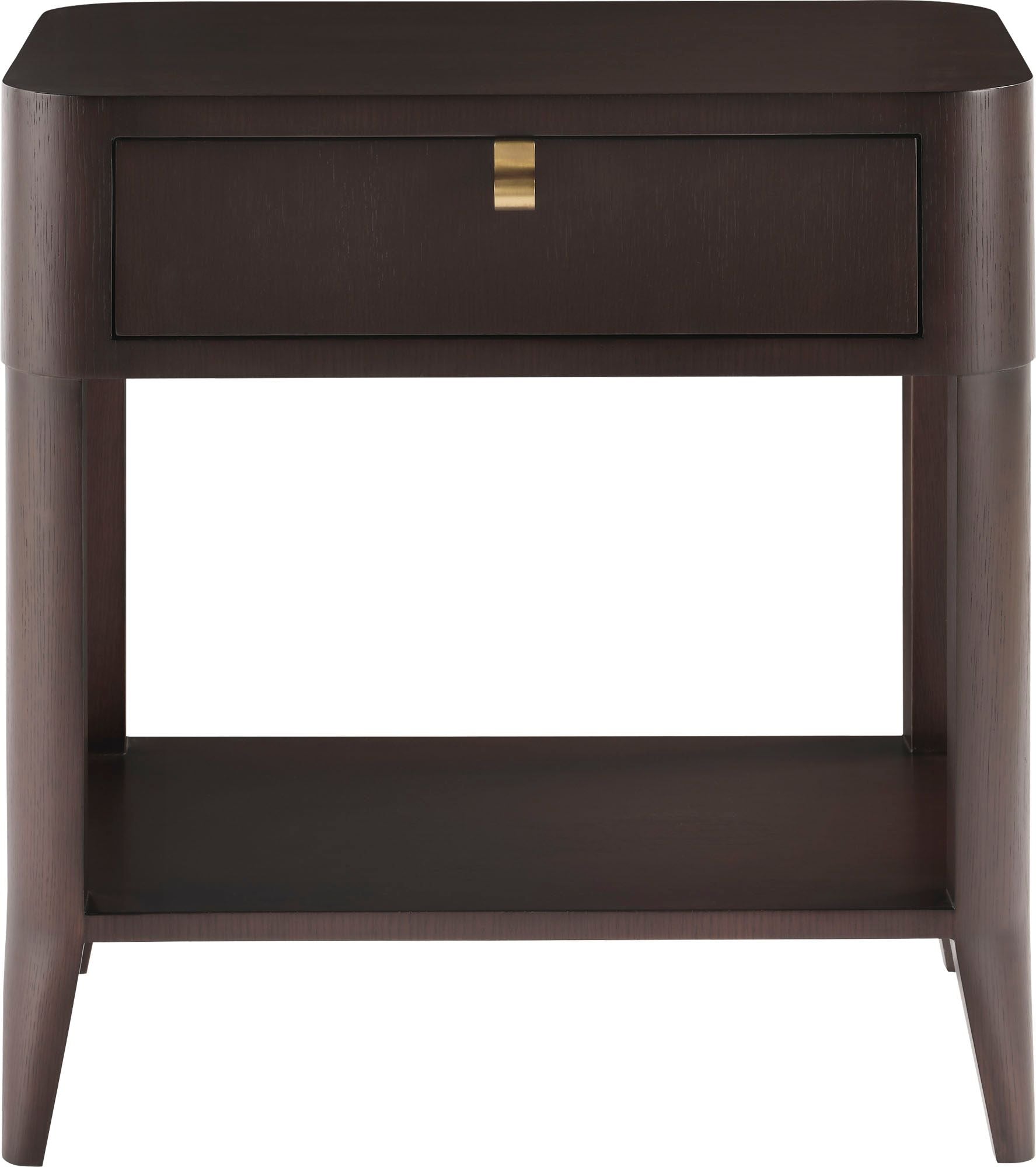 Defined by its smooth rounded corners and accented by brass hardware, the Eliana Nightstand is a modern and feminine choice. The nightstand is crafted in quartered oak veneer.