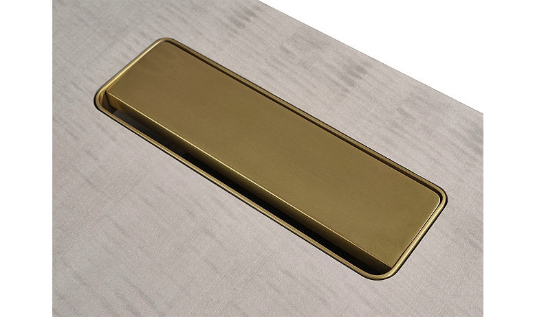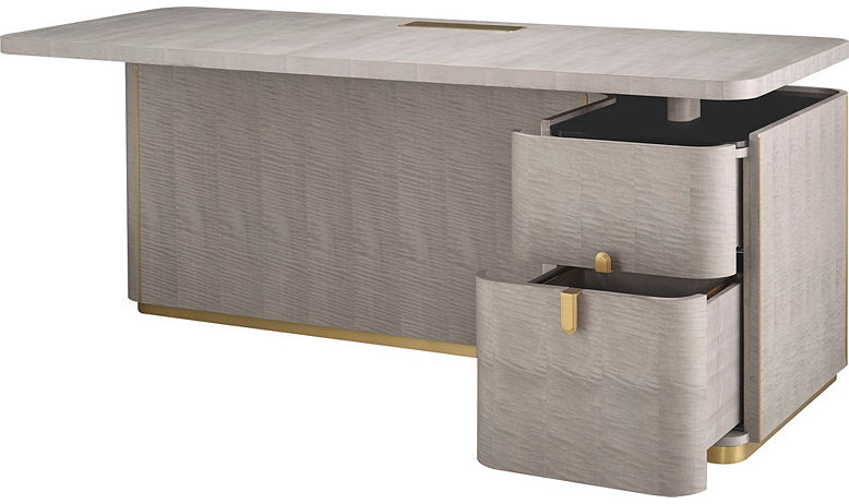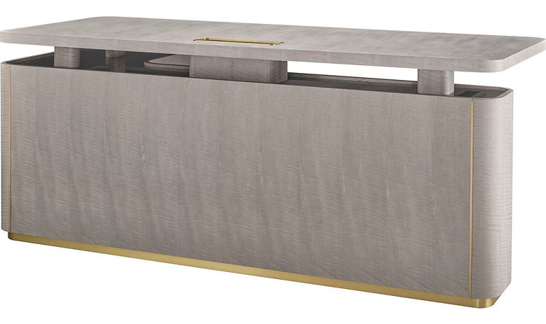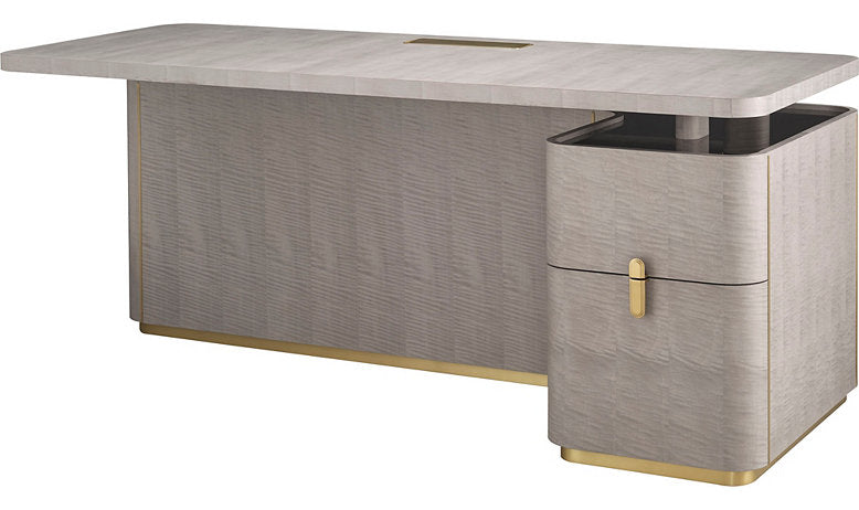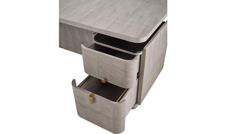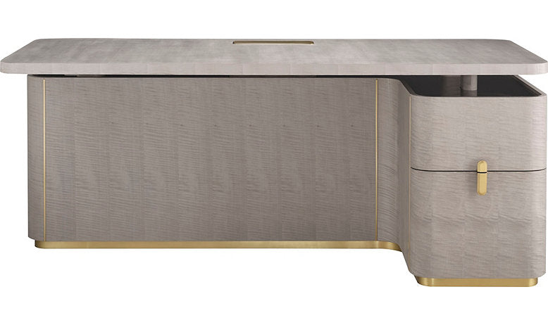 Designed for everyday productivity, the Fixed Height Desk with Wood Top is beautifully crafted in figured gray sycamore. The desk is rich in details with rounded edges, bronze glass and bronze reveals that add elegance to the way you work. This piece offers elegantly conceived storage, desktop power access, and wire management to help keep cords and cables out of sight.