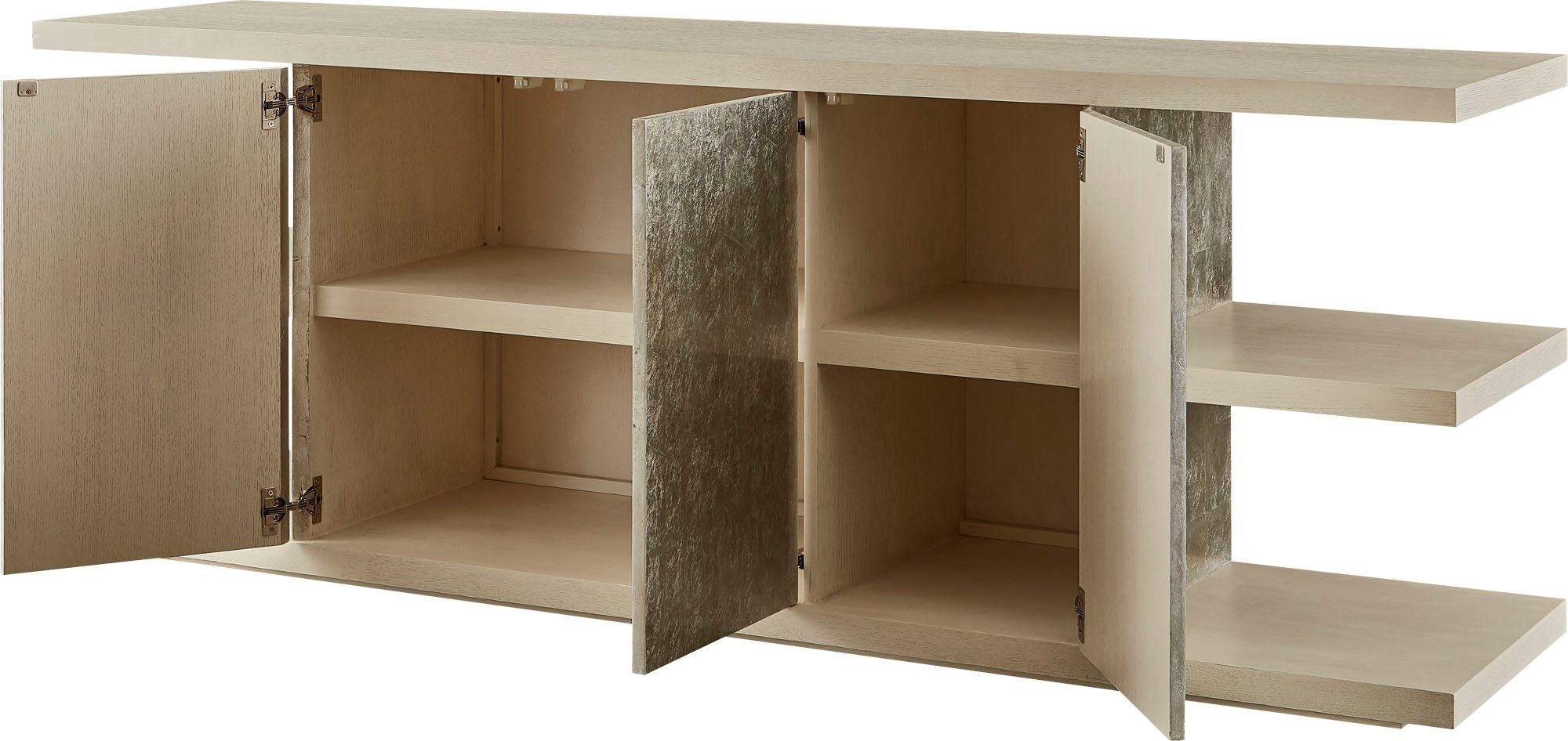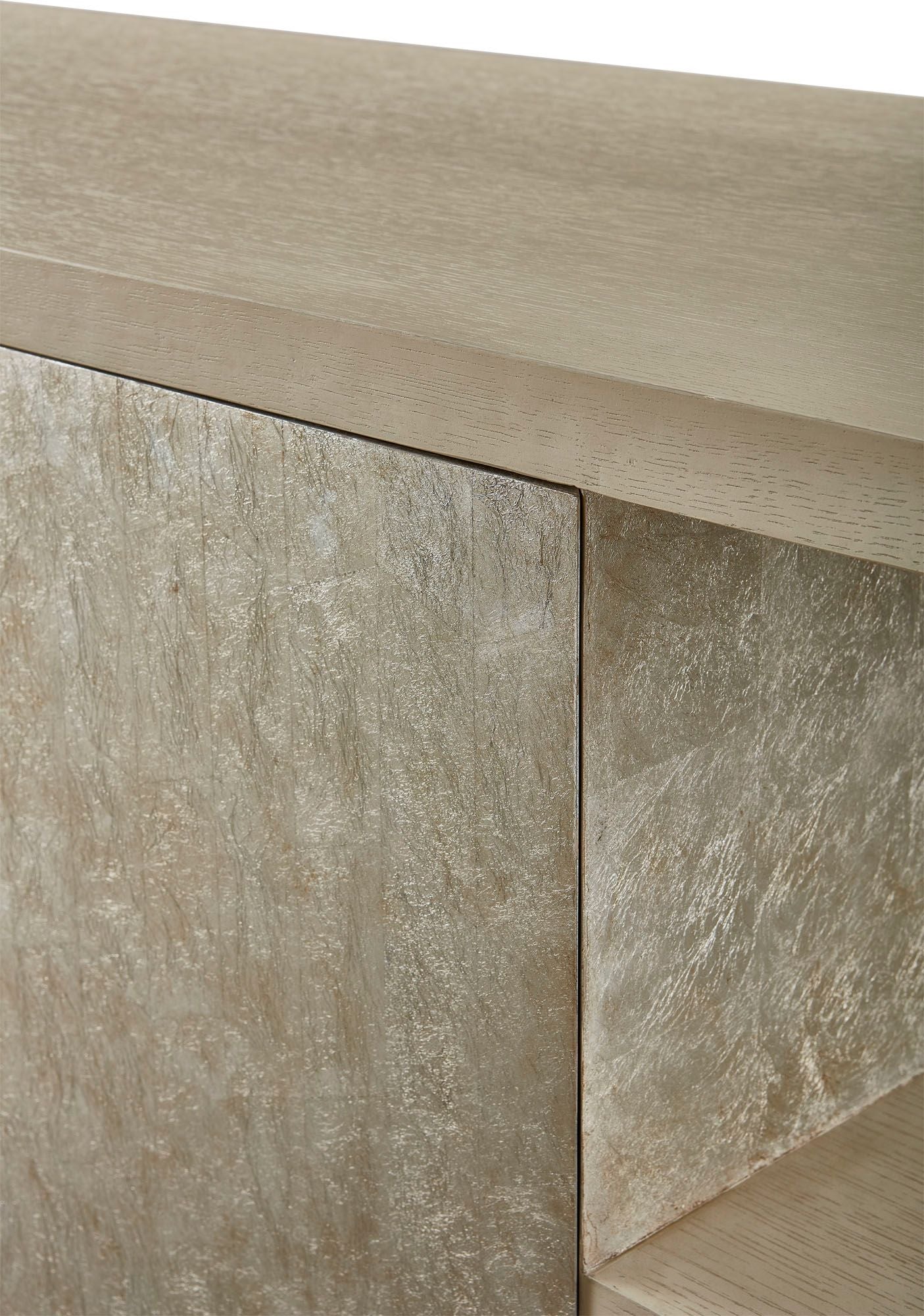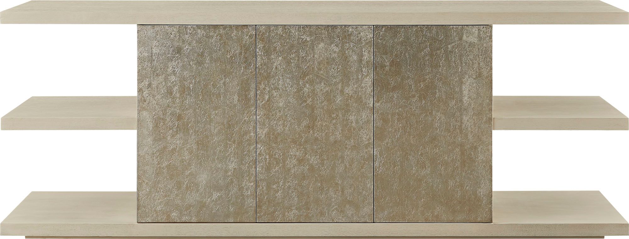The Hollis Media Console is inspired by the Bauhaus movement and its artistic approach to modern design. Its cantilevered linear shelves extend beyond a captivating silver leafed chest.